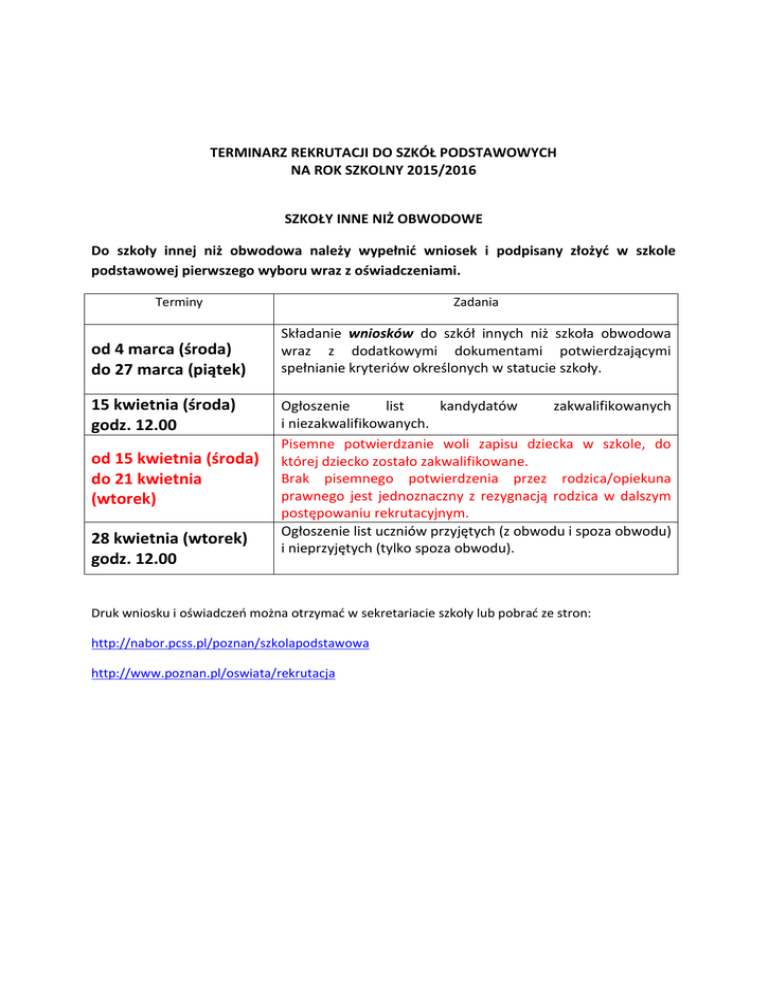 TERMINARZ REKRUTACJI DO SZKÓŁ PODSTAWOWYCH NA ROK SZKOLNY 2015/2016 SZKOŁY INNE NIŻ OBWODOWE Do szkoły innej niż obwodowa należy wypełnić wniosek i podpisany złożyć w szkole podstawowej pierwszego wyboru wraz z oświadczeniami. Terminy od 4 marca (środa) do 27 marca (piątek) 15 kwietnia (środa) godz. 12.00 od 15 kwietnia (środa) do 21 kwietnia (wtorek) 28 kwietnia (wtorek) godz. 12.00 Zadania Składanie wniosków do szkół innych niż szkoła obwodowa wraz z dodatkowymi dokumentami potwierdzającymi spełnianie kryteriów określonych w statucie szkoły. Ogłoszenie list kandydatów zakwalifikowanych i niezakwalifikowanych. Pisemne potwierdzanie woli zapisu dziecka w szkole, do której dziecko zostało zakwalifikowane. Brak pisemnego potwierdzenia przez rodzica/opiekuna prawnego jest jednoznaczny z rezygnacją rodzica w dalszym postępowaniu rekrutacyjnym. Ogłoszenie list uczniów przyjętych (z obwodu i spoza obwodu) i nieprzyjętych (tylko spoza obwodu). Druk wniosku i oświadczeń można otrzymać w sekretariacie szkoły lub pobrać ze stron: http://nabor.pcss.pl/poznan/szkolapodstawowa http://www.poznan.pl/oswiata/rekrutacja