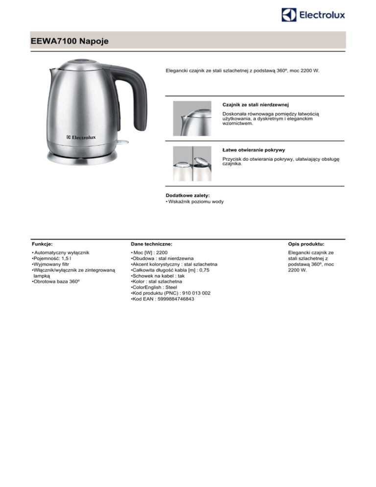 EEWA7100 Napoje Elegancki czajnik ze stali szlachetnej z podstawą 360º, moc 2200 W. Czajnik ze stali nierdzewnej Doskonała równowaga pomiędzy łatwością użytkowania, a dyskretnym i eleganckim wzornictwem. Łatwe otwieranie pokrywy Przycisk do otwierania pokrywy, ułatwiający obsługę czajnika. Dodatkowe zalety: • Wskaźnik poziomu wody Funkcje: Dane techniczne: Opis produktu: • Automatyczny wyłącznik •Pojemność: 1,5 l •Wyjmowany filtr •Włącznik/wyłącznik ze zintegrowaną lampką •Obrotowa baza 360º • Moc [W] : 2200 •Obudowa : stal nierdzewna •Akcent kolorystyczny : stal szlachetna •Całkowita długość kabla [m] : 0,75 •Schowek na kabel : tak •Kolor : stal szlachetna •ColorEnglish : Steel •Kod produktu (PNC) : 910 013 002 •Kod EAN : 5999884746843 Elegancki czajnik ze stali szlachetnej z podstawą 360º, moc 2200 W.