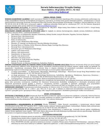 Serwis Informacyjny Urzędu Gminy Stare Babice, 18 grudnia 2015 r. Nr 463 www.stare-babice.pl GMINA, URZĄD, TEREN WIDZISZ ZAGROŻENIE? ALARMUJ! Jeżeli zauważycie Państwo w swoim otoczeniu niepokojącą Was sytuację, podejrzanie zachowujące się osoby, przypadkowo staniecie się świadkami przestępstwa, zauważycie, że komuś może grozić niebezpieczeństwo – poinformujcie o swoich spostrzeżeniach dyżurnego Komendy Powiatowej Policji dla Powiatu Warszawskiego Zachodniego z siedzibą w Starych Babicach, tel. (22) 752 80 00, (22) 60 43 900, lub w sytuacjach nagłych - najbliższą jednostkę Policji pod nr. alarmowym 997, 112. Do Państwa dyspozycji pozostaje również adres poczty elektronicznej [email protected] URZĄD NIECZYNNY 24.12.2015 Na podstawie Zarządzenia Nr 186/2015 Wójta Gminy Stare Babice z dnia 02.12.2015 r. Urząd Gminy Stare Babice w dniu 24 grudnia 2015 r. będzie nieczynny. DODATKOWY ODBIÓR ODPADÓW W STYCZNIU 2016 Ze względu na zmianę harmonogramu, odpady zostaną dodatkowo odebrane w sobotę 2 stycznia 2016 r. z poniższych lokalizacji: Stare Babice: ul. Kampinoska, Okrężna, Izabelińska, Zielony Zaułek, Leśnych Skrzatów, Pogodna, Zaciszna, Bajkowa. Borzęcin Duży: Cała miejscowość. Borzęcin Mały: Cała miejscowość. Buda: ul. Zaborowska. Janów: ul. gen. Władysława Sikorskiego. Klaudyn: ul. Ludwiga van Beethovena, Henryka Mikołaja Góreckiego. Koczargi Nowe: ul. Szkolna, Górki, Wiosenna, Różana, Bugaj, Czarnego Bzu, Klonowa. Koczargi Stare: Cała miejscowość. Kwirynów: gen. Ul. Władysława Sikorskiego. Lipków: Cała miejscowość. Mariew: Cała miejscowość. Stanisławów: ul. Spacerowa. Topolin: Cała miejscowość. Wierzbin: Cała miejscowość. Wojcieszyn: ul. Trakt Królewski, Wspólna. Zalesie: ul. Trakt Królewski. Zielonki Parcele: ul. Okrężna, Południowa, Zachodnia, Parkowa. ZIMOWE UTRZYMANIE DRÓG NA TERENIE GMINY STARE BABICE W SEZONIE 2015/2016 Zimowe utrzymanie dróg są to prace mające na celu ograniczenie zakłóceń ruchu drogowego takimi czynnikami atmosferycznymi jak śliskość zimowa, opady śniegu czy gołoledź. Za organizację i koordynację utrzymania dróg w okresie zimy, w stopniu zależnym od zaistniałych warunków atmosferycznych oraz posiadanego zaplecza technicznego (sprzętowo-materiałowego), na terenie gminy odpowiedzialni są: za drogi wojewódzkie – ul. Warszawska, Sikorskiego, Okulickiego, Sobieskiego – Mazowiecki Zarząd Dróg Wojewódzkich rejon Grodzisk Mazowiecki, tel. 227 555 946 lub 227 555 117, za drogi powiatowe – ul. Akacjowa, Mościckiego-Sienkiewicza, Izabelińska, Ogrodnicza, Południowa, Spacerowa, Kwiatowa – Zarząd Dróg Powiatowych, ul. Poznańska 300, 05-850 Ożarów Mazowiecki, tel. 227 221 380, za drogi gminne – Urząd Gminy Stare Babice, Referat Gospodarki Komunalnej, tel. 227 229 535. Pierwszej kolejności zimowego utrzymania podlegają ulice strategiczne dla komunikacji. Nie podlegają zimowemu utrzymaniu przez urząd gminy ulice prywatne, wewnętrzne, osiedlowe etc. Zimowym utrzymaniem chodników niebędących w obowiązku utrzymania przez właścicieli prywatnych posesji zgodnie z „Ustawą o utrzymaniu czystości i porządku w gminach”, parkingów oraz przystanków autobusowych zajmuje się firma „REMONDIS Sp. z o.o.” z siedzibą w Warszawie (02-981), ul. Zawodzie 16, tel. 225 930 555. ODŚNIEŻAMY CHODNIKI! Przypominamy mieszkańcom gminy, że Ustawa z dnia 13 września 1996 roku o utrzymaniu czystości i porządku w gminach (Tekst jednolity: Dz. U. z 2012 r. poz. 391) art. 5 ust.1, pkt. 4 nakłada na właścicieli nieruchomości obowiązek utrzymania czystości i porządku przez: uprzątnięcie błota, śniegu, lodu i innych zanieczyszczeń z chodników położonych wzdłuż nieruchomości. SPORT, WYDARZENIA SPOTKANIE Z PRZYRODĄ W KPN Kampinoski Park Narodowy serdecznie zaprasza na plenerowe spotkania z przyrodą i historią Puszczy Kampinoskiej w dniu 19.12.2015 r. godz. 12.00. Początek spotkania na polanie wypoczynkowej w Lipkowie, w programie m.in. spacer z przewodnikiem ścieżką edukacyjną "Do Lipkowskiej wody" oraz zabawy edukacyjne. ZDROWIE GASTROSKOPIA I KOLONOSKOPIA W FORMMED Klinika Formmed z Babic Nowych zawiadamia o rozszerzonej ofercie badań refundowanych przez NFZ. Od 9 grudnia 2015 r. będzie można wykonać badania gastroskopii i kolonoskopii. Badania będą wykonywane w nowej Pracowni Endoskopowej, zapisy w rejestracji, tel. 22 350 47 05, kom. 606 388 973. OPIEKA I REHABILITACJA W SDS SADOWA Środowiskowy Dom Samopomocy w Sadowej gm. Łomianki oferuje opiekę, rehabilitację, ciekawe formy spędzania czasu w godz. 7.00-15.00. Oferta skierowana dla osób dotkniętych problemami zdrowia psychicznego. Możliwość korzystania ze zorganizowanego dojazdu. Kontakt: 22-751 36 39. OGŁOSZENIA SPOŁECZNE Poszukuję do wynajęcia garażu na potrzeby własne (nie prowadzę działalności gospodarczej). Tel. 504 780 888. Wydzierżawię ziemię rolną w Gminie Stare Babice od 1 do 5 ha. Tel. 502-487-879. Potrzebne osoby do prac porządkowych w Łomiankach. Zapewniony transport. Tel. 794-331-338. Firma WUZETEM zatrudni: operatora/ustawiacza maszyn i urządzeń. Miejsce pracy: Panatonni Park Konotopa – Jawczyce. Więcej informacji na www.stare-babice.pl w zakładce "ogłoszenia społeczne", e-mail: [email protected] lub fax: +48 22 841 24 41.