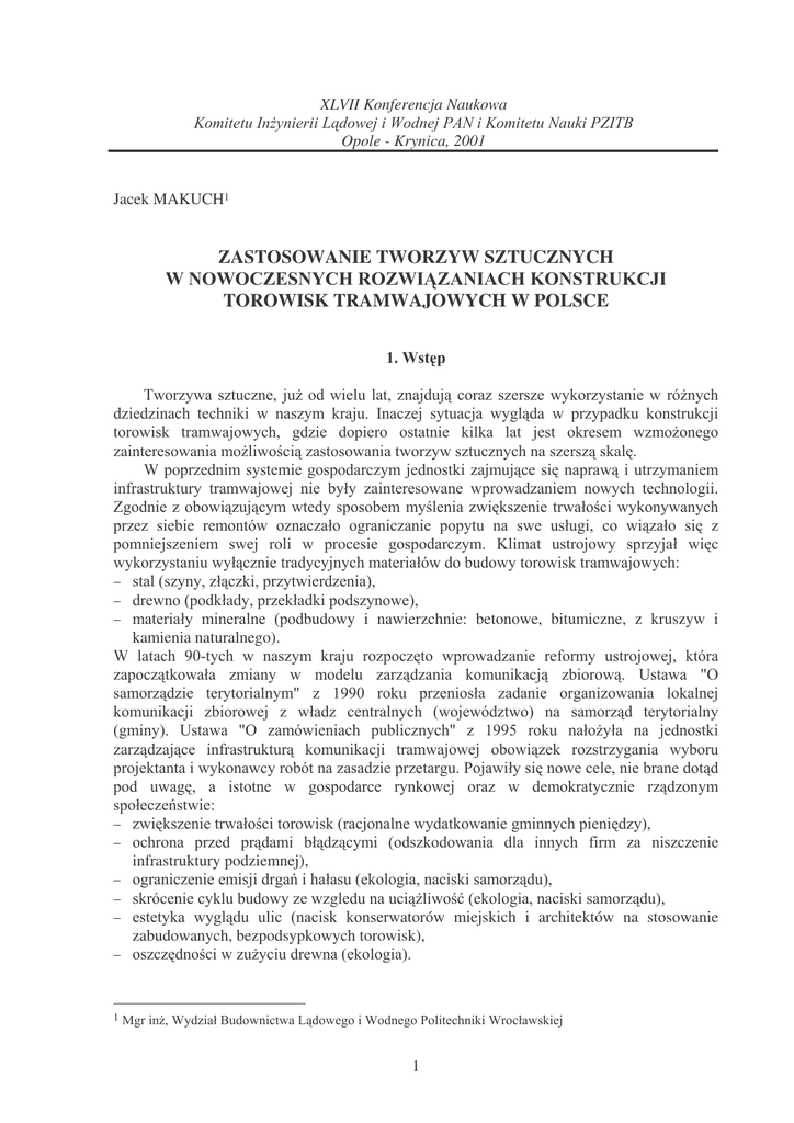 XLVII Konferencja Naukowa Opole - Krynica, 2001 Jacek MAKUCH1 ZASTOSOWANIE TWORZYW SZTUCZNYCH TOROWISK TRAMWAJOWYCH W POLSCE ! "# $ " " " # # # % # − − − # " # # & ' # ( ' # # ( # ' budowy i nawierzchnie: betonowe, bitumiczne, z kruszyw i kamienia naturalnego). )*+ ! # " , -. /))* # " # ' ( ' ( , -. " - /))0 # # ! " " " 1 # " # − − − − − − 1 2 & # ' ( "# ' ! infrastruktury podziemnej), 2 # ' ( " 3' ( ' watorów miejskich i architektów na stosowanie zabudowanych, bezpodsypkowych torowisk), ' ( 4 #5 6 1 1 # 7 # # zarówno w projektowaniu jak i w wykonawstwie. Wprowadzenie gospodarki rynkowej " # 2 # 8 # torowisk tramwajowych. # " # #" # ' # " ( znacznej mierze tworzywami sztucznymi. 2. Podstawowe informacje o tworzywach sztucznych . - - ' #+ " ' " " $ 3 + − # '" # (:/; )0 9 ( " # ( # & " # 3' # /** 9( # − plastomery - ch # /**9( & − + # temperaturze, a twarde w temperaturze otoczenia, − + # czynników chemicznych (chemoutwardzalne). " / zastosowanie w budowie torowisk tramwajowych. ' # ' ( " # Tablica 1. Tworzywa sztuczne wykorzystywane w budowie torowisk tramwajowych Rodzaj tworzywa Nazwa tworzywa Elastomery kauczuk (guma) Plastomery Termoplasty polietylen, polipropylen, polichlorek winylu (PCV), polistyren (styropian), poliamid, poliuretan Duroplasty chemoutwardzalne epoksydy ! " "# $ #" # %& ' &(# "' % &) &( " "#* +# )"# &( % 2 W przypadku torowisk wydzielonych z jezdni oraz poprzecznych przejazdów drogowych " # " " " 2 + - " -' " " 2 # # ( 2 '! ( " # 2' ( 3.1. Podparcie i przytwierdzenie szyny -%- ' " # # /( # <*+ " 1 ->5+?- ' " # "# #3 =*+ # # # @( # # # # " " # 2 # 3 4 # Rys.1. Przytwierdzenie "K" Rys.2. Przytwierdzenie "SB-3" Przytwierdzenie typu "K" jest nadal stosowane do posadowienia szyn na betonowej ' " ( " # " " ' ?( 3 # & # " 1 # " 3 1 # " " " " " " " " " 1 # " " " # " " " # # + 1 !" " " 8 " " # "" + " # # " 2 # # " "# " # # " 1 & 3 " + " # /))0( ' ! # " mechanizacji robót. 1 # E # # -' F " #1 # # #3 (B 2 2 # Rys.3. Tor na podporach wibroizolacyjnych $ - A + 2 " 1 ' % " " C( !# 1 '" 5 1 ( B C " D*+ # !" ! " # # " # # 7 " # 2 # B " elektryczna, krótki i zmechanizowany cykl budowy, estetyka uzyskiwanej nawierzchni (z & # +. /))<( B & ! # 3 # 1 1 "#% ' % /)=C(:@; " # B # G > 5 8 # '1 2 ( " # 0> # & " # + -" # "3 ' # " ( " ' ( # " 3 " # ' " ( "3 " # " # # " # " # # # # " " # 4 " " ? # " # 1 1 ' " ( F ' /))0(:?; # " H /))<( :C; (ul.Karkonoska, 1999) i Poznaniu (ul. Podgórna, 2000). B 0 ' Rys.6. Tor z zalewem poliuretanowym # B # % # # # # " D # " ' !" " " " # ( " #3 # " " 2 I 1 ># /))D( Hucisko, 2000). > @*** % # ' # ' F /)))( J 2 ' J " 2 + % " # #@ :0; > # @*** D " ! 7# $ " 3.2. Zabudowa torowiska I " # # " ' (5 # + # # " # " # $ " # & − masy zalewowe poliuretanowe albo bitumiczno-kauczukowe (rys.3 - prawa strona 0(A − " + ' ?+ ( " # ! " − & ' C( # ' 0 + ( # ' <(+ % J 2 5 B <J # przejazdowe B = # # 8 3 " warstwami nawierzchni w celu wzmocnienia lub separacji (rys.5) oraz o dodatkach z tworzyw # # " ! ' ! ( ' ! ( !" & # " # # 3.3. Podbudowa torowiska ? " " " 0 "# # ' 3 # ?( "# ' 0( " ' kwarcowym w odpowiedniej proporcji). Podobnie jak w przypadku nawierzchni, przy wykonywaniu betonowych podbudów korzystne jest stosowanie dodatków z tworzyw # # " ' ! ( # " " " " # # # 7 " # " 2 # " podbudowach torowisk, w postaci mat wibroizolacyjnych z jednorodnej gumy albo granulatu # 8 = F /))0 :?; 4 # " " " -B " # # % # 5 7# @*** " " 4 " 3 & # '% 5 @***+ ! # ( 6 3.4. Podtorze 8 # " & " " # " # 2& 4 # ! # # +> ' 2 4 ' /))D( " # # ( & # " " , 1 + " " "# '* +"' -"#./ *.01' & )'./"&( "''.*' " & #& . ' ' ( # (A # " # &! " ( " A ' " & " (1 " ' " " 4. Podsumowanie . # − − − 3'# 3 & # 2 3 # chemicznych (sole, oleje, smary), − 3 " − − " − # # ( 3' " 2( ! ' " ancji # # # ( 3' ( & − z − "# − # '" @( # '" ' " C( # $ "# # ?( I ! & − − zastosowaniem tworzyw sztucznych jako dodatków lub w nowych zastosowaniach, − ' # I chemoutwardzalnych preparatów). E #3 2 # 2 7 2 > # @* 2 # ! # 31 # # 4 3 ! 3 " 2 3 $ # ?+ # % " "# " = F # 2 :?; B # 2" H @ 0 ? :C; " K! 1 konstrukcjach 3 torowisk 2 ! tramwajowych, brakuje 8 " natomiast warunków technicznych 2 " oferowanie nadzoru podczas budowy. Innym problemem jest praktyka stosowana niekiedy przez wykonawców robót 2 2 # > " " # " $ # ! ! + " " ." " Tablica 2. Zastosowanie tworzyw sztucznych zamiast tworzyw tradycyjnych 3 tworzywo tworzywo tradycyjne sztuczne # drewno polietylen, polia#3 3A # mid, guma, ela" 3 stomer korkowy # podlewy, bitumiczne poliuretanowe 3 3 zalewy # " A ' 3(A lepsza izolacja elektryczna beton cementowy epoksydowy " A #3 #3 # + podsypka styropian, pianka A nia cementowo poliuretanowa, " A 3A -piaskowa PCV 3 # rury betonowe, polietylen, A # kamionko- polipropylen A 3 A we, 3# 3 # 8 Tablica 3. Zastosowanie tworzyw sztucznych jako dodatków do tworzyw tradycyjnych tworzywo dodatki tradycyjne betony plastyfikatory #3 3 3A cementowe A " " A # betony asfal- elastomer towe, zalewy (kauczuk syn3 3 #3 bitumiczne tetyczny) 3 geosyntetyki maty wibroizolacyjne kleje preparaty preparaty Tablica 4. Nowe zastosowania tworzyw sztucznych tworzywo sztuczne polietylen, wzmocnienie, separacja i odwodnienie warstw polipropylen, podbudowy lub podtorza poliester guma, elastomer wzrost izolacji wibroakustycznej korkowy # poliuretanowe, " 2 epoksydowe bitumiczno# kauczukowe polimery zapewnienie odpowiednich warunków podczas dojrzewania betonu epoksydy zabezpieczenie i izolacja powierzchni, polepszenie # Literatura [1] [2] [3] [4] [5] DOBROSZ K., MATYSIAK A., ! ! . Wydawnictwa Szkolne i Pedagogiczne, Warszawa, 1990. FLKG4 KF% 1 # " Sympozjum Naukowo-Techniczne: Racjonalne wykorzystanie infrastruktury szynowej. Kraków-Zakopane 1995, s. 177-187. %G.>K% % 8 Sympozjum Naukowo-Techniczne: Racjonalne wykorzystanie infrastruktury szynowej. Kraków-Zakopane 1995, s. 195-204. MZTSiPT, Nowa technologia budowy rozjazdu tramwajowego. Kraków 1997. OLEKSIEWICZ W., " " #$ " # # # % % #&' . Transcomp Warszawa, 1997. 9 APP