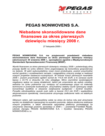 PEGAS NONWOVENS S.A. Niebadane skonsolidowane dane finansowe za okres pierwszych dziewięciu miesięcy 2008 r. 27 listopada 2008 r. PEGAS NONWOVENS S.A. ma przyjemność przedstawić niebadane skonsolidowane dane finansowe za okres pierwszych dziewięciu miesięcy zakończonych 30 września 2008 r., sporządzone zgodnie z Międzynarodowymi Standardami Sprawozdawczości Finansowej (MSSF). Wyniki finansowe za okres pierwszych dziewięciu miesięcy 2008 r. potwierdzają silną pozycję Spółki na rynku włóknin mimo pogarszającej się koniunktury gospodarczej na świecie. W pełni wykorzystaliśmy nowe moce produkcyjne, poziom przychodów wzrósł zgodnie z oczekiwaniami zarządu i osiągnęliśmy znaczny postęp w realizacji nowych projektów badawczo-rozwojowych. W okresie trzech pierwszych kwartałów 2008 r. poziom przychodów ogółem wzrósł do 110,8 mln EUR, a to oznacza wynik lepszy o 22,1% w stosunku do roku ubiegłego. Mimo czynników wywierających negatywny wpływ na naszą działalność, takich jak umacnianie się waluty czeskiej, wahania na rynku polimerów czy mniejszy od oczekiwanego popyt na materiały techniczne w przemyśle budowlanym, utrzymaliśmy stabilny wynik operacyjny dzięki koncentracji wysiłków w obszarze zwiększania wydajności i kontroli kosztów. Ponadto odnotowaliśmy wysoki zysk netto w kwocie 23,5 mln EUR i wypłaciliśmy akcjonariuszom dywidendę, równocześnie utrzymując zadłużenie netto na stabilnym poziomie. Głównym celem, jaki wyznaczyliśmy sobie na okres do końca roku jest utrzymanie wyniku na działalności operacyjnej na wysokim poziomie, dalsza skuteczna realizacja nowych projektów, a także stworzenie optymalnej platformy pozwalającej na utrzymanie obecnego poziomu sprzedaży w 2009 r. – powiedział František Řezáč, członek Zarządu PEGAS NONWOVENS S.A. i Dyrektor Generalny PEGAS NONWOVENS s.r.o. 1 Podsumowanie wyników finansowych 9 miesięcy styczeń–wrzesień 2008 (mln EUR) III kw. lipiec–wrzesień 2008 rok do roku rok do roku Przychody 110,8 +22,1% 35,4 +18,0% Koszty operacyjne pomniejszone o amortyzację 80,3 +32,7% 25,7 +24,0% Zysk EBITDA 30,4 +0,8% 9,7 +4,7% Amortyzacja 12,6 +38,7% 4,4 +42,5% Zysk operacyjny (EBIT) 17,8 (15,6%) 5,4 (13,8%) Zysk/strata z tytułu różnic kursowych i pozostałe przychody/(koszty) finansowe (netto) 13,1 b.d. (4,5) b.d. Koszty odsetkowe (netto) 4,8 (41,0%) 1,6 (3,8%) Zobowiązania/(należności) z tytułu podatku dochodowego 2,6 b.d. (1,0) b.d. Zysk netto 23,5 +88,2% 0,3 (97,3%) Nakłady inwestycyjne 17,8 (4,8%) 0,7 (80,0%) Zatrudnienie (koniec okresu) 389 +3,5% 389 +3,5% Średnie zatrudnienie 381 +9,8% 386 +4,9% Zadłużenie netto 123,5 (0,9%) 123,5 (0,9%) Wielkość produkcji (w tonach) 50 060 +19,7% 17 138 +22,8% Średni kurs EUR/CZK 24,815 (11,6%) 24,092 (13,7%) 24,665 (10,7%) 24,665 (10,7%) Kurs EUR/CZK okresu – koniec 2 Skonsolidowane wyniki finansowe Przychody, koszty, EBITDA W okresie pierwszych trzech kwartałów 2008 r. skonsolidowane przychody (przychody ze sprzedaży produktów) wyniosły 110,8 mln EUR, co stanowiło wzrost o 22,1% w stosunku do analogicznego okresu roku poprzedniego. Na wzrost ten wpływ miał głównie wyższy wolumen produkcji, osiągnięty dzięki zwiększeniu mocy produkcyjnych, oraz wzrost cen surowców, który znalazł swoje odzwierciedlenie w cenach wyrobów. Skonsolidowane przychody (przychody ze sprzedaży produktów) odnotowane w III kw. 2008 r. kształtowały się na poziomie 35,4 mln EUR, co stanowi wzrost o 18,0% w stosunku do analogicznego okresu poprzedniego roku. Słabsza dynamika wzrostu przychodów w III kw. 2008 r. (w porównaniu z poprzednimi kwartałami roku) wynikała z niższych cen sprzedaży, co podyktowane było krótkofalowym spadkiem indeksów cenowych służących do wyznaczania cen polimerów w II kw. 2008 r. i tymczasowym zwiększeniem zapasów wyrobów gotowych, związanym z przesunięciem sprzedaży pomiędzy segmentami. W okresie dziewięciu miesięcy 2008 r., łączne skonsolidowane koszty operacyjne bez amortyzacji (netto) zwiększyły się o 32,7% i osiągnęły poziom 80,3 mln EUR. Głównym czynnikiem wzrostu był wyższy wolumen zużytych surowców i materiałów, związany ze zwiększeniem produkcji, a także wzrost cen surowców i energii oraz kosztów zatrudnienia. W III kw. 2008 r. łączne skonsolidowane koszty operacyjne bez amortyzacji (netto) wzrosły do 25,7 mln EUR, czyli o 24,0% rok do roku. Niższy w stosunku do poprzednich okresów bieżącego roku przyrost kosztów operacyjnych można przypisać zmianie stanu zapasów wyrobów gotowych, która wystąpiła w związku z niesprzedanymi wyrobami z segmentu technicznego. Ponadto należy zaznaczyć, że większość kosztów związanych z projektem przejęcia poniesiona została w II kw. 2008 r. Zysk EBITDA za okres dziewięciu miesięcy 2008 r. osiągnął poziom 30,4 mln EUR, co oznacza wzrost o 0,8% w stosunku do analogicznego okresu roku ubiegłego. Bez uwzględnienia uzyskanego w zeszłym roku jednorazowego przychodu w wysokości 1,03 mln EUR z tytułu odszkodowania przyznanego w ramach postępowania arbitrażowego, wzrost zysku EBITDA za pierwsze dziewięć miesięcy 2008 r. osiągnąłby poziom 4,4%. Wyższa wartość zysku EBITDA wynikała ze zwiększenia mocy produkcyjnych, a pozytywny wpływ na jego poziom miało kształtowanie się cen polimerów, których skutkiem były opóźnienia w procesie przenoszenia wzrostu cen polimerów na klientów w pierwszej połowie 2008 r. Poziom cen polimerów odnotowany w III kw. nie był dla Spółki korzystny. Aktualizacja wyceny programu na akcje fantomowe, wynikająca z kształtowania się kursu akcji, także miała korzystny wpływ na wynik EBITDA. Do czynników negatywnie wpływających na poziom EBITDA zaliczyć należy kurs korony czeskiej, wzrost cen energii, koszty poniesione w związku z planowaną transakcją przejęcia oraz mniejsza sprzedaża materiałów dla branży budowlanej. 3 W III kw. 2008