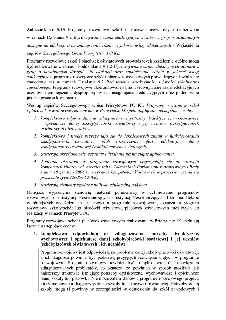 Załącznik nr 5.15 Programy rozwojowe szkół i placówek oświatowych realizowane w ramach Działania 9.2 Wyrównywanie szans edukacyjnych uczniów z grup o utrudnionym dostępie do edukacji oraz zmniejszanie różnic w jakości usług edukacyjnych - Wyjaśnienia zapisów Szczegółowego Opisu Priorytetów PO KL. Programy rozwojowe szkół i placówek oświatowych prowadzących kształcenie ogólne mogą być realizowane w ramach Poddziałania 9.1.2 Wyrównywanie szans edukacyjnych uczniów z grup o utrudnionym dostępie do edukacji oraz zmniejszanie różnic w jakości usług edukacyjnych, programy rozwojowe szkół i placówek oświatowych prowadzących kształcenie zawodowe zaś w ramach Działania 9.2 Podniesienie atrakcyjności i jakości szkolnictwa zawodowego. Programy rozwojowe ukierunkowane są na wyrównywanie szans edukacyjnych uczniów i zmniejszanie dysproporcji w ich osiągnięciach edukacyjnych oraz podnoszenie jakości procesu kształcenia. Według zapisów Szczegółowego Opisu Priorytetów PO KL Programy rozwojowe szkół i placówek oświatowych realizowane w Priorytecie IX spełniają łącznie następujące cechy: 1. kompleksowo odpowiadają na zdiagnozowane potrzeby dydaktyczne, wychowawcze i opiekuńcze danej szkoły/placówki oświatowej i jej uczniów (szkół/placówek oświatowych i ich uczniów); 2. kompleksowo i trwale przyczyniają się do jakościowych zmian w funkcjonowaniu szkoły/placówki oświatowej i/lub rozszerzenia oferty edukacyjnej danej szkoły/placówki oświatowej (szkół/placówek oświatowych); 3. zawierają określone cele, rezultaty i działania już na etapie aplikowania; 4. działania określone w programie rozwojowym przyczyniają się do rozwoju kompetencji kluczowych określonych w Zaleceniach Parlamentu Europejskiego i Rady z dnia 18 grudnia 2006 r. w sprawie kompetencji kluczowych w procesie uczenia się przez całe życie (2006/962/WE); 5. zawierają elementy zgodne z polityką edukacyjną państwa. Niniejsze wyjaśnienia stanowią materiał pomocniczy w definiowaniu programów rozwojowych dla Instytucji Pośredniczących i Instytucji Pośredniczących II stopnia. Ilekroć w niniejszych wyjaśnieniach jest mowa o programie rozwojowym, oznacza to program rozwojowy szkoły/szkół lub placówki oświatowej/placówek oświatowych możliwych do realizacji w ramach Priorytetu IX. Programy rozwojowe szkół i placówek oświatowych realizowane w Priorytecie IX spełniają łącznie następujące cechy: 1. kompleksowo odpowiadają na zdiagnozowane potrzeby dydaktyczne, wychowawcze i opiekuńcze danej szkoły/placówki oświatowej i jej uczniów (szkół/placówek oświatowych i ich uczniów) Program rozwojowy jest odpowiedzią na problemy danej szkoły/placówki oświatowej, a ich diagnoza powinna być podstawą przyjętych rozwiązań ujętych w programie rozwojowym. Program rozwojowy powinien być kompleksową próbą rozwiązania zdiagnozowanych problemów, co oznacza, że powinien w sposób możliwie jak najszerszy traktować istniejące potrzeby dydaktyczne, wychowawcze i opiekuńcze danej szkoły lub placówki. Nie może zatem stanowić programu rozwojowego projekt, który nie zawiera diagnozy potrzeb szkoły lub placówki oświatowej. Potrzeby danej szkoły mogą (i powinny w szczególności w odniesieniu do szkól zawodowych i ponadgimnazjalnych) wynikać z sytuacji na lokalnym lub regionalnym rynku pracy. Odpowiedź na powyższe potrzeby powinna skutkować rozszerzeniem oferty edukacyjnej danej szkoły lub prowadzić do podniesienia jakości świadczonych usług edukacyjnych. Warunkiem spełnienia powyższej przesłanki jest realizacja programu rozwojowego w ramach działalności szkoły (w odróżnieniu do projektów realizowanych w Priorytecie III, w którym zajęcia mogą odbywać się poza szkołą). 2. kompleksowo i trwale przyczyniają się do jakościowych zmian w funkcjonowaniu szkoły/placówki oświatowej i/lub rozszerzenia oferty edukacyjnej danej szkoły/placówki oświatowej (szkół/placówek oświatowych) W zależności od analizy potrzeb i polityki edukacyjnej danej szkoły lub placówki oświatowej może ona stworzyć program rozwojowy ukierunkowany na: - reformę szkoły, w celu podniesienia jakości i atrakcyjności dotychczasowej oferty i/lub - program rozwojowy ukierunkowany na rozszerzenie oferty edukacyjnej, w celu dopasowania tej oferty do potrzeb lokalnego/regionalnego rynku pracy. Oba podejścia do programu rozwojowego wpisują się w cele zarówno Działania 9.1 jak i Działania 9.2. Kompleksowe podejście do rozszerzenia oferty edukacyjnej i/lub reformy danej szkoły oznacza systemowe podejście do rozwoju szkoły lub placówki oświatowej i jest powiązane z przesłanką nr 1. Kompleksowość odnosi się zatem zarówno do diagnozy potrzeb, jak i działań podejmowanych w wyniku tej diagnozy. Należy ją rozpatrywać w kontekście wszystkich elementów wniosku oraz w kontekście celów i wartości dodanej projektu. Każdorazowo ocena kompleksowości należy do osoby dokonującej oceny merytorycznej wniosku. Należy zaznaczyć, że programem rozwojowym w żadnym z powyższych rodzajów programów rozwojowych nie mogą być np. jedynie zajęcia z j. obcego czy też zajęcia sportowe, bo mimo że podniosą atrakcyjność oferty edukacyjnej danej szkoły, to nie będzie to systemowe podejście do rozszerzenia oferty edukacyjnej. Program rozwojowy powinien w sposób całościowy (systemowy) i trwały przyczyniać się do rozwoju szkoły/placówki oświatowej. Program rozwojowy powinien zatem koncentrować się na wywołaniu efektu trwałej zmiany pracy szkoły (np. wprowadzeniu nowych elementów nauczania, mechanizmów dostosowania oferty edukacyjnej do potrzeb rynku pracy, itp.). Efekt trwałej zmiany pracy szkoły może również wynikać z osiągniętych rezultatów miękkich programu rozwojowego (np. doświadczenie i kwalifikacje nauczycieli zdobyte podczas realizacji programu rozwojowego są wykorzys