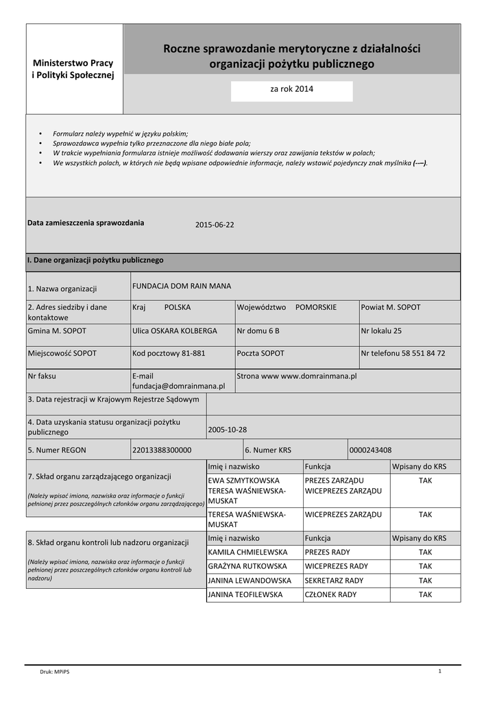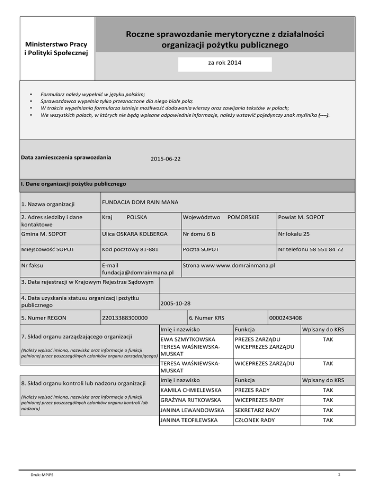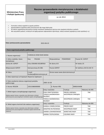 ZŽĐnjŶĞƐƉƌĂǁŽnjĚĂŶŝĞŵĞƌLJƚŽƌLJĐnjŶĞnjĚnjŝĂųĂůŶŽƑĐŝ ŽƌŐĂŶŝnjĂĐũŝƉŽǏLJƚŬƵƉƵďůŝĐnjŶĞŐŽ Ministerstwo Pracy ŝWŽůŝƚLJŬŝ^ƉŽųĞĐnjŶĞũ za rok 2014 • • • • &ŽƌŵƵůĂƌnjŶĂůĞǏLJǁLJƉĞųŶŝđǁũħnjLJŬƵƉŽůƐŬŝŵ͖ ^ƉƌĂǁŽnjĚĂǁĐĂǁLJƉĞųŶŝĂƚLJůŬŽƉƌnjĞnjŶĂĐnjŽŶĞĚůĂŶŝĞŐŽďŝĂųĞƉŽůĂ͖ tƚƌĂŬĐŝĞǁLJƉĞųŶŝĂŶŝĂĨŽƌŵƵůĂƌnjĂŝƐƚŶŝĞũĞŵŽǏůŝǁŽƑđĚŽĚĂǁĂŶŝĂǁŝĞƌƐnjLJŽƌĂnjnjĂǁŝũĂŶŝĂƚĞŬƐƚſǁǁƉŽůĂĐŚ͖ tĞǁƐnjLJƐƚŬŝĐŚƉŽůĂĐŚ͕ǁŬƚſƌLJĐŚŶŝĞďħĚČǁƉŝƐĂŶĞŽĚƉŽǁŝĞĚŶŝĞŝŶĨŽƌŵĂĐũĞ͕ŶĂůĞǏLJǁƐƚĂǁŝđƉŽũĞĚLJŶĐnjLJnjŶĂŬŵLJƑůŶŝŬĂ (--–). Data zamieszczenia sprawozdania 2015-06-22 /͘ĂŶĞŽƌŐĂŶŝnjĂĐũŝƉŽǏLJƚŬƵƉƵďůŝĐnjŶĞŐŽ 1. Nazwa organizacji FUNDACJA DOM RAIN MANA 2. Adres siedziby i dane kontaktowe Kraj Gmina M. SOPOT Ulica OSKARA KOLBERGA Nr domu 6 B Nr lokalu 25 DŝĞũƐĐŽǁŽƑđ^KWKd Kod pocztowy 81-881 Poczta SOPOT Nr telefonu 58 551 84 72 Nr faksu E-mail [email protected] Strona www www.domrainmana.pl POLSKA Województwo POMORSKIE Powiat M. SOPOT ϯ͘ĂƚĂƌĞũĞƐƚƌĂĐũŝǁ<ƌĂũŽǁLJŵZĞũĞƐƚƌnjĞ^ČĚŽǁLJŵ ϰ͘ĂƚĂƵnjLJƐŬĂŶŝĂƐƚĂƚƵƐƵŽƌŐĂŶŝnjĂĐũŝƉŽǏLJƚŬƵ publicznego 5. Numer REGON 22013388300000 ϳ͘^ŬųĂĚŽƌŐĂŶƵnjĂƌnjČĚnjĂũČĐĞŐŽŽƌŐĂŶŝnjĂĐũŝ ;EĂůĞǏLJǁƉŝƐĂđŝŵŝŽŶĂ͕ŶĂnjǁŝƐŬĂŽƌĂnjŝŶĨŽƌŵĂĐũĞŽĨƵŶŬĐũŝ ƉĞųŶŝŽŶĞũƉƌnjĞnjƉŽƐnjĐnjĞŐſůŶLJĐŚĐnjųŽŶŬſǁŽƌŐĂŶƵnjĂƌnjČĚnjĂũČĐĞŐŽͿ ϴ͘^ŬųĂĚŽƌŐĂŶƵŬŽŶƚƌŽůŝůƵďŶĂĚnjŽƌƵŽƌŐĂŶŝnjĂĐũŝ ;EĂůĞǏLJǁƉŝƐĂđŝŵŝŽŶĂ͕ŶĂnjǁŝƐŬĂŽƌĂnjŝŶĨŽƌŵĂĐũĞŽĨƵŶŬĐũŝ ƉĞųŶŝŽŶĞũƉƌnjĞnjƉŽƐnjĐnjĞŐſůŶLJĐŚĐnjųŽŶŬſǁŽƌŐĂŶƵŬŽŶƚƌŽůŝůƵď nadzoru) Druk: MPiPS 2005-10-28 6. Numer KRS 0000243408 /ŵŝħŝŶĂnjǁŝƐŬŽ Funkcja Wpisany do KRS EWA SZMYTKOWSKA dZ^t_E/t^<Ͳ MUSKAT WZ^Zh t/WZ^Zh TAK dZ^t_E/t^<Ͳ MUSKAT t/WZ^Zh TAK /ŵŝħŝŶĂnjǁŝƐŬŽ Funkcja KAMILA CHMIELEWSKA PREZES RADY TAK 'ZzEZhd<Kt^< WICEPREZES RADY TAK JANINA LEWANDOWSKA SEKRETARZ RADY TAK JANINA TEOFILEWSKA BKE<Zz TAK Wpisany do KRS 1 9. Cele statutowe organizacji ;EĂůĞǏLJŽƉŝƐĂđĐĞůĞŶĂƉŽĚƐƚĂǁŝĞƐƚĂƚƵƚƵŽƌŐĂŶŝnjĂĐũŝͿ ĞůĞŵ&ƵŶĚĂĐũŝũĞƐƚƉƌŽǁĂĚnjĞŶŝĞĚnjŝĂųĂůŶŽƑĐŝŶĂƌnjĞĐnjŽƐſďnjĂƵƚLJnjŵĞŵ͕ njĞƐƉŽųĞŵZĞƚƚĂŝƉŽŬƌĞǁŶLJŵŝnjĂďƵƌnjĞŶŝĂŵŝƌŽnjǁŽũŽǁLJŵŝŽƌĂnjŶĂƌnjĞĐnj ŝĐŚƌŽĚnjŝŶ͕ĂǁƐnjĐnjĞŐſůŶŽƑĐŝ͗ ĂͿĐĂųŽŬƐnjƚĂųƚnjĂĚĂŷnjǁŝČnjĂŶLJĐŚnjnjĂųŽǏĞŶŝĞŵŽƑƌŽĚŬĂůƵďŝŶŶLJĐŚŵŝĞũƐĐ ƐƚĂųĞŐŽƉŽďLJƚƵŽƌĂnjƉƌĂĐLJ͕ƚĞƌĂƉŝŝŝƌĞŚĂďŝůŝƚĂĐũŝĚŽƌŽƐųLJĐŚŽƐſďnj ĂƵƚLJnjŵĞŵŝƉŽŬƌĞǁŶLJŵŝnjĂďƵƌnjĞŶŝĂŵŝ͕njǁĂŶLJĐŚĚĂůĞũKƑƌŽĚŬŝĞŵ͕ ďͿnjĂƉĞǁŶŝĞŶŝĞŶŝĞnjďħĚŶLJĐŚƑƌŽĚŬſǁĚůĂĨƵŶŬĐũŽŶŽǁĂŶŝĂƚĞŐŽ KƑƌŽĚŬĂŽƌĂnjƐƉƌĂǁŽǁĂŶŝĞƉŝĞĐnjLJŶĂĚũĞŐŽĚnjŝĂųĂůŶŽƑĐŝČ͕ c) upowszechnianie wiedzy o autyzmie i pokrewnych zaburzeniach oraz sposobach terapii, ĚͿƐŬƵƉŝĂŶŝĞǁŽŬſųŝĚĞŝ&ƵŶĚĂĐũŝŽƐſďĐŚĐČĐLJĐŚƉŽŵſĐŽƐŽďŽŵnj ĂƵƚLJnjŵĞŵ͕njĞƐƉŽųĞŵZĞƚƚĂŝƉŽŬƌĞǁŶLJŵŝnjĂďƵƌnjĞŶŝĂŵŝ͘ Fundacja realizuje swoje cele poprzez: ĂͿƉƌnjLJŐŽƚŽǁĂŶŝĞƉƌŽŐƌĂŵƵŝnjĂƐĂĚĨƵŶŬĐũŽŶŽǁĂŶŝĂKƑƌŽĚŬĂ͕ ďͿďƵĚŽǁħKƑƌŽĚŬĂŽƌĂnjnjŽƌŐĂŶŝnjŽǁĂŶŝĞũĞŐŽĚnjŝĂųĂůŶŽƑĐŝ͕ 10. Sposób realizacji celów statutowych organizacji ĐͿnjĂŬƵƉƐƉƌnjħƚƵŶŝĞnjďħĚŶĞŐŽĚŽƉƌĂǁŝĚųŽǁĞŐŽĚnjŝĂųĂŶŝĂKƑƌŽĚŬĂ͕ ĚͿƉƌŽǁĂĚnjĞŶŝĞKƑƌŽĚŬĂ͕ ;EĂůĞǏLJŽƉŝƐĂđƐƉŽƐſďƌĞĂůŝnjĂĐũŝĐĞůſǁƐƚĂƚƵƚŽǁLJĐŚŽƌŐĂŶŝnjĂĐũŝŶĂ ĞͿƐnjŬŽůĞŶŝĞƉĞƌƐŽŶĞůƵKƑƌŽĚŬĂ͕ ĨͿŬŽŶĨĞƌĞŶĐũĞ͕ǁLJŬųĂĚLJ͕ƐnjŬŽůĞŶŝĂŝƉƵďůŝŬĂĐũĞƉŽƉƵůĂƌLJnjƵũČĐĞ podstawie statutu organizacji) ŚƵŵĂŶŝƐƚLJĐnjŶĞŵĞƚŽĚLJŽƉŝĞŬŝŶĂĚŽƐŽďĂŵŝnjĂƵƚLJnjŵĞŵ͕njĞƐƉŽųĞŵZĞƚƚĂŝ pokrewnymi zaburzeniami rozwojowymi. ŐͿƉƌŽǁĂĚnjĞŶŝĞƐƉĞĐũĂůŝƐƚLJĐnjŶLJĐŚƵƐųƵŐŽƉŝĞŬƵŷĐnjLJĐŚŽƌĂnjĞĚƵŬĂĐũŝ͕ ƚĞƌĂƉŝŝŝƌĞŚĂďŝůŝƚĂĐũŝŽƐſďnjĂƵƚLJnjŵĞŵ͕njĞƐƉŽųĞŵZĞƚƚĂŝƉŽŬƌĞǁŶLJŵŝ zaburzeniami rozwojowymi. h) prowadzenie poradnictwa dla rodzin, organizacji i instytucji njĂũŵƵũČĐLJĐŚƐŝħƑǁŝĂĚĐnjĞŶŝĞŵƉŽŵŽĐLJŽƐŽďŽŵnjĂƵƚLJnjŵĞŵ͕njĞƐƉŽųĞŵ Retta i pokrewnymi zaburzeniami rozwojowymi. ŝͿǁƐƉſųƉƌĂĐħnjŝŶƐƚLJƚƵĐũĂŵŝƉĂŷƐƚǁŽǁLJŵŝŝŽƌŐĂŶŝnjĂĐũĂŵŝƐƉŽųĞĐnjŶLJŵŝ͕ ŬƌĂũŽǁLJŵŝŝŵŝħĚnjLJŶĂƌŽĚŽǁLJŵŝ͕ĚnjŝĂųĂũČĐLJŵŝǁnjĂŬƌĞƐŝĞŽďũħƚLJŵĐĞůĂŵŝ &ƵŶĚĂĐũŝ͕ƉŽƉƌnjĞnjŽƌŐĂŶŝnjŽǁĂŶŝĞǁƐƉſůŶLJĐŚĂŬĐũŝĚŽƚLJĐnjČĐLJĐŚ͗ ͲǁƐƉŝĞƌĂŶŝĂŝŶŝĐũĂƚLJǁnjŵŝĞƌnjĂũČĐLJĐŚĚŽƉŽƉƌĂǁLJƐƚĂŶƵƉƌnjĞƉŝƐſǁƉƌĂǁĂ ǁnjĂŬƌĞƐŝĞƉƌŽďůĞŵƵĂƵƚLJnjŵƵ͕njĞƐƉŽųƵZĞƚƚĂŝƉŽŬƌĞǁŶLJĐŚnjĂďƵƌnjĞŷ rozwojowych. ͲƉƌŽƉĂŐŽǁĂŶŝĞǁƐƉŽųĞĐnjĞŷƐƚǁŝĞǁŝĞĚnjLJŽƉŽƚƌnjĞďĂĐŚ //͘ŚĂƌĂŬƚĞƌLJƐƚLJŬĂĚnjŝĂųĂůŶŽƑĐŝŽƌŐĂŶŝnjĂĐũŝƉŽǏLJƚŬƵƉƵďůŝĐnjŶĞŐŽǁŽŬƌĞƐŝĞƐƉƌĂǁŽnjĚĂǁĐnjLJŵ ϭ͘KƉŝƐĚnjŝĂųĂůŶŽƑĐŝƉŽǏLJƚŬƵƉƵďůŝĐnjŶĞŐŽ ϭ͘ϭ͘