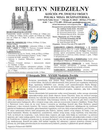 BIULETYN NIEDZIELNY KOĝCIÓà PW. ĝWIĉTEJ TRÓJCY POLSKA MISJA DUSZPASTERSKA 1118 North Noble Street * Chicago, IL 60642 - 4015tel. (773) 489 4140 * fax: (773) 489 - 5918-mail: [email protected] BIURO PARAFIALNE CZYNNE: Poniedziaáek, wtorek, czwartek: od 9:00am do 1:00pm oraz od 2:00pm do 5:00pm. ĝroda i piątek: od 9:00am do 1:00pm oraz od 2:00pm do 7:30pm. W soboty i niedziele biuro jest nieczynne. MSZE ĝW. NIEDZIELNE: 8:00am, 10:00am, 12:15pm, 4:00pm, 8:00pm MSZE ĝW. W TYGODNIU: codziennie 8:00am, w kaĪdą ĞrodĊ i piątek o 7:30pm, w Pierwszy Czwartek miesiąca o 7:30pm, w Pierwszą SobotĊ miesiąca o 6:30pm. NABOĩEēSTWA: • NaboĪeĔstwo ku czci Ğw. Józefa - Ğroda, po Mszy o 8:00am • Nowennna do MB Nieustającej Pomocy - Ğroda, 7:30pm • Godzinki do NMP - niedziela, 7:30am • Adoracja w Godzinie Miáosierdzia: piątek i niedziela - 3:00pm • Pierwszy Czwartek miesiąca i namaszczenie olejami Ğw. Charbela - 6:30pm • Pierwszy Piątek miesiąca: naboĪeĔstwo pokutne - 6:30pm i naboĪeĔstwo uwielbienia z proĞbą o uzdrowienie po Mszy Ğw. o 7:30pm • Pierwsza Sobota miesiąca z procesją Ğwiatáa - 6:30pm strona internetowa: www.trojcowo.com Duszpasterstwo prowadzą KsiĊĪa Chrystusowcy: Ks. Andrzej Totzke SChr - Dyrektor Ks. Adam SáomiĔski SChr - Asystent Ks. Krzysztof Janicki SChr - Asystent Ks. Wojciech Baryski SChr - Rezydent Siostry Misjonarki tel. (773) 227-9826 Sr. Gertruda SzymaĔska MChR Sr. Hiacynta Ratajczak MChR Sr. Anna Strycharz MChR Organista - Mariusz Pluta tel. (773) -640-1379 SAKRAMENT CHRZTU ĝWIĉTEGO: w II niedzielĊ miesiąca podczas Mszy Ğw. o godz. 10:00am i IV niedzielĊ miesiąca podczas Mszy Ğw. o godz. 12:15pm. Chrzest dziecka prosimy zgáosiü przynajmniej miesiąc wczeĞniej. Katecheza przedchrzcielna w pierwszą sobotĊ miesiąca o godz. 5:00pm w sali pod koĞcioáem. SAKRAMENT POKUTY I POJEDNANIA: kaĪda sobota od 4:00pm do 5:00pm oraz 30 minut przed kaĪdą Mszą Ğw. DUSZPASTERSTWO CHORYCH: w kaĪdy Pierwszy Piątek miesiąca odwiedzamy z posáugą sakramentalną chorych parafian w domach oraz na kaĪde wezwanie. SAKRAMENT MAàĩEēSTWA: prosimy zgáaszaü przynajmniej szeĞü miesiĊcy przed planowaną datą Ğlubu. 13 listopada 2016 - XXXIII Niedziela Zwykáa ĝWIAT JAKO PLAC BUDOWY ĝwiątynia jerozolimska byáa domem Boga, miejscem spotkania Wszechmogącego ze swoim ludem. Ale byáa teĪ mikrokosmosem, który przecieĪ jest wypeániony obecnoĞcią Boga, tajemniczą SZEKINA (ozn. chwaáa), czyli zamieszkiwaniem Ducha BoĪego. WszechĞwiat jest Ğwiątynią, do której zamieszkiwania Bóg zaprosiá teĪ czáowieka. ĩeby sobie to uĞwiadomiü, czáowiek potrzebowaá projektu, miniatury, jaką byáa wáaĞnie ta budowla. Pierwsi chrzeĞcijanie byli postawieni wobec nowej koncepcji, wobec nowego stworzenia zapoczątkowanego przez dzieáo zbawcze Jezusa Chrystusa. Jezus nie stworzyá nowego kosmosu, lecz sam staá siĊ Ğwiatem dla swych uczniów, sam staá siĊ Ğwiątynią, sam poáoĪyá siebie jako fundament nowej wiĊzi z czáowiekiem. Taką koncepcjĊ widzimy w Jego sáowach, gdy mówi o kamieniu odrzuconym przez budujących, albo o Ğwiątyni swego ciaáa, zaraz po oczyszczeniu Ğwiątyni z handlarzy. ĝwiĊty Piotr w Pierwszym LiĞcie wraca do tej wizji Jezusa i rozszerza ją, okreĞlając KoĞcióá jako Dom Duchowy, gmach zbudowany z dusz wiernych Jezusowi. My wszyscy jesteĞmy kamieniami duchowymi, ukáadającymi siĊ warstwami pokoleĔ na fundamencie apostoáów, gdzie kamieniem wĊgielnym, czyli tym, który rozpocząá budowĊ, jest Chrystus. W caáym zamieszaniu historii, które przypomina plac budowy, musimy znaleĨü swoje miejsce, bo kaĪdy z nas jest innym kamieniem. Musimy siĊ dopasowaü, scementowaü, znaleĨü swoją ĞcianĊ, swoją wspólnotĊ, swój charyzmat. Tych, na których siĊ wesprzemy, i tych, którym damy wsparcie, jak cegáy, które káadą siĊ warstwami i są zarówno oparciem, jak i same szukają oparcia. Jest to czas pracy duchowej i pewnej czujnoĞci, jak podpowiada czytanie z Listu do Tesaloniczan. CzujnoĞü jest konieczna, by nie pomyliü budowli i nie staü siĊ elementem jakiejĞ atrapy sekciarskiej czy okultystycznej. KoĞcióá jest jeden. JeĞli kamieĔ wĊgielny byá odrzucony i pierwsi uczniowie równieĪ, to nie dziwmy siĊ, jeĞli bĊdąc przeznaczonymi do tworzenia nowej budowli, jesteĞmy w jakikolwiek sposób odtrącani. Augustyn Pelanowski OSPPE 98 OBCHODY ĝWIĉTA NIEPODLEGàOĝCI Po 124 latach zaborów paĔstwo polskie odzyskaáo swą niepodlegáoĞü. Dzisiaj o godz. 10:00am na Mszy Ğw. modliü siĊ bĊdziemy za PolskĊ z okazji 98 rocznicy odzyskania przez nią NiepodlegáoĞci. PamiĊtajmy teĪ o tych, którzy za PolskĊ niepodlegáą polegli, ale teĪ i o tych, którzy w trudzie budowali i budują jej niepodlegáy byt. Po Mszy zapraszamy do Muzeum Polskiego w Ameryce, 984 N. Milwaukee Avenue, gdzie odbĊdzie siĊ akademia z okolicznoĞciowym programem artystycznym przygotowanym przez Harcerzy Związku Harcerstwa Polskiego - Obwód Chicago. Zapraszamy równieĪ do sali pod koĞcioáem na pyszny obiad przygotowany przez parafialny chór „ĝpiewajmy Panu”. UBEZPIECZENIE ZDROWOTNE Pozwól sobie pomóc! Duszpasterstwo Imigranci-Imigrantom zaprasza wszystkich na bezpáatne spotkanie na temat ubezpieczeĔ zdrowotnych (Medicare, ObamaCare, Medicaid inne), które odbĊdzie siĊ dzisiaj o godz. 5:00pm w sali parafialnej. SpecjaliĞci do spraw ubezpieczeĔ pomogą w znalezieniu najlepszego planu medycznego dla Ciebie i Twojej rodziny oraz pomogą w wypeánieniu aplikacji. Informacji o Duszpasterstwie i spotkaniu: Maágorzata Antoniak: 874 917 0422. IMIENINY SIOSTRY GERTRUDY W ĞrodĊ, 16 listopada, swoje imieniny obchodzi sr. Gertruda SzymaĔska MChR. Naszej drogiej Solenizantce Īyczymy: báogosáawieĔstwa BoĪego, pokoju serca, darów Ducha ĝwiĊtego oraz opieki Matki BoĪej. Wszystkiego najlepszego! SPOTKANIE DLA SENIORÓW W czwartek 17 listopada zapraszamy: 