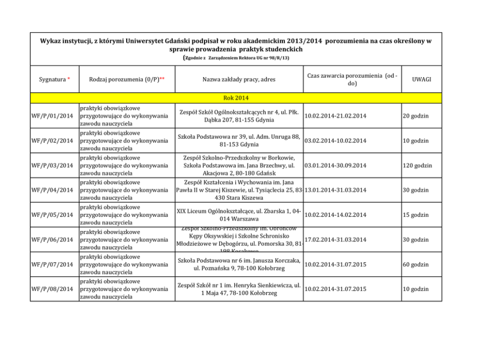 Wykaz instytucji, z którymi Uniwersytet Gdański podpisał w roku akademickim 2013/2014 porozumienia na czas określony w sprawie prowadzenia praktyk studenckich (zgodnie z Sygnatura * Rodzaj porozumenia (0/P)** Zarządzeniem Rektora UG nr 98/R/13) Nazwa zakłady pracy, adres Czas zawarcia porozumienia (od do) UWAGI Rok 2014 WF/P/01/2014 praktyki obowiązkowe przygotowujące do wykonywania zawodu nauczyciela Zespół Szkół Ogólnokształcących nr 4, ul. Płk. 10.02.2014-21.02.2014 Dąbka 207, 81-155 Gdynia 20 godzin WF/P/02/2014 praktyki obowiązkowe przygotowujące do wykonywania zawodu nauczyciela Szkoła Podstawowa nr 39, ul. Adm. Unruga 88, 03.02.2014-10.02.2014 81-153 Gdynia 10 godzin WF/P/03/2014 praktyki obowiązkowe przygotowujące do wykonywania zawodu nauczyciela WF/P/04/2014 praktyki obowiązkowe przygotowujące do wykonywania zawodu nauczyciela Zespół Kształcenia i Wychowania im. Jana Pawła II w Starej Kiszewie, ul. Tysiąclecia 25, 83- 13.01.2014-31.03.2014 430 Stara Kiszewa 30 godzin WF/P/05/2014 praktyki obowiązkowe przygotowujące do wykonywania zawodu nauczyciela XIX Liceum Ogólnokształcące, ul. Zbarska 1, 0410.02.2014-14.02.2014 014 Warszawa 15 godzin WF/P/06/2014 praktyki obowiązkowe przygotowujące do wykonywania zawodu nauczyciela 30 godzin WF/P/07/2014 praktyki obowiązkowe przygotowujące do wykonywania zawodu nauczyciela Zespół Szkolno-Przedszkolny im. Obrońców Kępy Oksywskiej i Szkolne Schronisko 17.02.2014-31.03.2014 Młodzieżowe w Dębogórzu, ul. Pomorska 30, 81198 Kosakowo Szkoła Podstawowa nr 6 im. Janusza Korczaka, 10.02.2014-31.07.2015 ul. Poznańska 9, 78-100 Kołobrzeg 60 godzin WF/P/08/2014 praktyki obowiązkowe przygotowujące do wykonywania zawodu nauczyciela Zespół Szkół nr 1 im. Henryka Sienkiewicza, ul. 10.02.2014-31.07.2015 1 Maja 47, 78-100 Kołobrzeg 10 godzin Zespół Szkolno-Przedszkolny w Borkowie, Szkoła Podstawowa im. Jana Brzechwy, ul. Akacjowa 2, 80-180 Gdańsk 03.01.2014-30.09.2014 120 godzin WF/P/09/2014 praktyki obowiązkowe przygotowujące do wykonywania zawodu nauczyciela WF/P/10/2014 praktyki obowiązkowe przygotowujące do wykonywania zawodu nauczyciela WF/P/11/2014 praktyki obowiązkowe przygotowujące do wykonywania zawodu nauczyciela WF/P/12/2014 praktyki obowiązkowe przygotowujące do wykonywania zawodu nauczyciela WF/P/13/2014 praktyki obowiązkowe przygotowujące do wykonywania zawodu nauczyciela WF/P/14/2014 Społeczne Gimnazjum w Radzikowie, ul. Bydgoska 34a, 78-100 Kołobrzeg 10.02.2014-31.07.2015 60 godzin Szkoła Podstawowa nr 57 im. gen. Władysława 03.02.2014-13.02.2014 Andersa, ul. Aksamitna 8, 80-858 Gdańsk 10 godzin Zespół Szkół w Mrocznie, 13-324 Grodziczno 14.01.2014-31.03.2014 50 godzin Zespół Szkół Licealnych i Agrotechnicznych im. Leona Janty-Połczyńskiego w Tucholi, ul. 14.01.2014-31.03.2014 Nowodworskiego 9-13, 89-500 Tuchola 50 godzin Szkoła Podstawowa, Brzydowo 27, 14-100 Ostróda 28.01.2014-28.01.2015 40 godzin praktyki obowiązkowe przygotowujące do wykonywania zawodu nauczyciela Zespół Szkół nr 3, Szkoła Podstawowa nr 8, ul. 16.01.2014-28.03.2014 Nanicka 22, 84-200 Wejherowo 10 godzin WF/P/15/2014 praktyki obowiązkowe przygotowujące do wykonywania zawodu nauczyciela Zespół Szkół nr 3, Gimnazjum nr 3, ul. Nanicka 16.01.2014-28.03.2014 22, 84-200 Wejherowo 10 godzin WF/P/16/2014 praktyki obowiązkowe przygotowujące do wykonywania zawodu nauczyciela Zespół Szkół Ogólnokształcących nr 2, II Liceum Ogólnokształcące im. Teodora Bolduana, 17.01.2014-28.03.2014 Osiedle Kaszubskie 27, 84-200 Wejherowo 10 godzin WF/P/17/2014 praktyki obowiązkowe przygotowujące do wykonywania zawodu nauczyciela Gdyńska Szkoła Społeczna, ul. Kapitańska 37, 81-249 Gdynia 11.02.2014-31.05.2014 80 godzin WF/O/18/2014 praktyki obowiązkowe TUI Poland Dystrybucja sp. z o.o., ul. Wołoska 25.02.2014-30.04.2014 9A, 02-583 Warszawa 60 godzin WF/O/19/2014 praktyki obowiązkowe Przedszkole pw. Świętej Rodziny prowadzone przez Zgromadzenie Sióstr Św. Dominika, ul. 17.02.2014-14.03.2014 Miernicza 9, 81-527 Gdynia 160 godzin WF/P/20/2014 praktyki obowiązkowe przygotowujące do wykonywania zawodu nauczyciela WF/P/21/2014 praktyki obowiązkowe przygotowujące do wykonywania zawodu nauczyciela WF/P/22/2014 praktyki obowiązkowe przygotowujące do wykonywania zawodu nauczyciela WF/P/23/2014 praktyki obowiązkowe przygotowujące do wykonywania zawodu nauczyciela WF/O/24/2014 Zespół Kształcenia Podstawowego nr 12, Szkoła Podstawowa nr 48 i Gimnazjum nr 16, ul. 27.01.2014-28.02.2014 Burzyńskiego 10, 80-462 Gdańsk Zespół Szkół Handlowych w Sopocie, ul. Kościuszki 18/20, 81-704 Sopot 20 godzin 18.02.2014-30.04.2014 30 godzin Zespół Szkół im. Jana Kasprowicza w Sztumie, 18.02.2014-07.03.2014 ul. Kasprowicza 3, 82-400 Sztum 10 godzin Szkoła Podstawowa nr 76 im. Jarosława Dąbrowskiego, ul. Jagiellońska 14, 80-371 Gdańsk 24.02.2014-11.04.2014 80 godzin praktyki obowiązkowe Biuro Tłumacza Przysięgłego "Corvus" Piotr Maj, ul. Zielony Trójkąt 10, 80-869 Gdańsk 10.02.2014-10.03.2014 30 godzin WF/O/25/2014 praktyki obowiązkowe Sea Tours.pl, Biuro Podróży Karol Rosada, ul. Toruńska 18D/G, 80-747 Gdańsk 14.03.2014-30.05.2014 60 godzin WF/P/26/2014 praktyki obowiązkowe przygotowujące do wykonywania zawodu nauczyciela Akademickie Liceum Ogólnokształcące Magellanum, ul. Wały Jagiellońskie 26/6, 80853 Gdańsk 24.02.2014-30.04.2014 10 godzin WF/P/27/2014 praktyki obowiązkowe przygotowujące do wykonywania zawodu nauczyciela Akademickie Gimnazjum Magellanum, ul. Wały 24.02.2014-30.04.2014 Jagiellońskie 26/6, 80-853 Gdańsk 10 godzin WF/O/28/2014 praktyki obowiązkowe WF/O/29/2014 praktyki obowiązkowe Państwowa Galeria Sztuki, Plac Zdrojowy 2, 8105.02.2014-21.03.2014 720 Sopot 80 godzin WF/P/30/2014 praktyki obowiązkowe przygotowujące do wykonywania zawodu nauczyciela Szkoła Podstawowa nr 60, ul. Chłopska 64, 8017.02.2014-15.06.2014 350 Gdańsk 120 godz