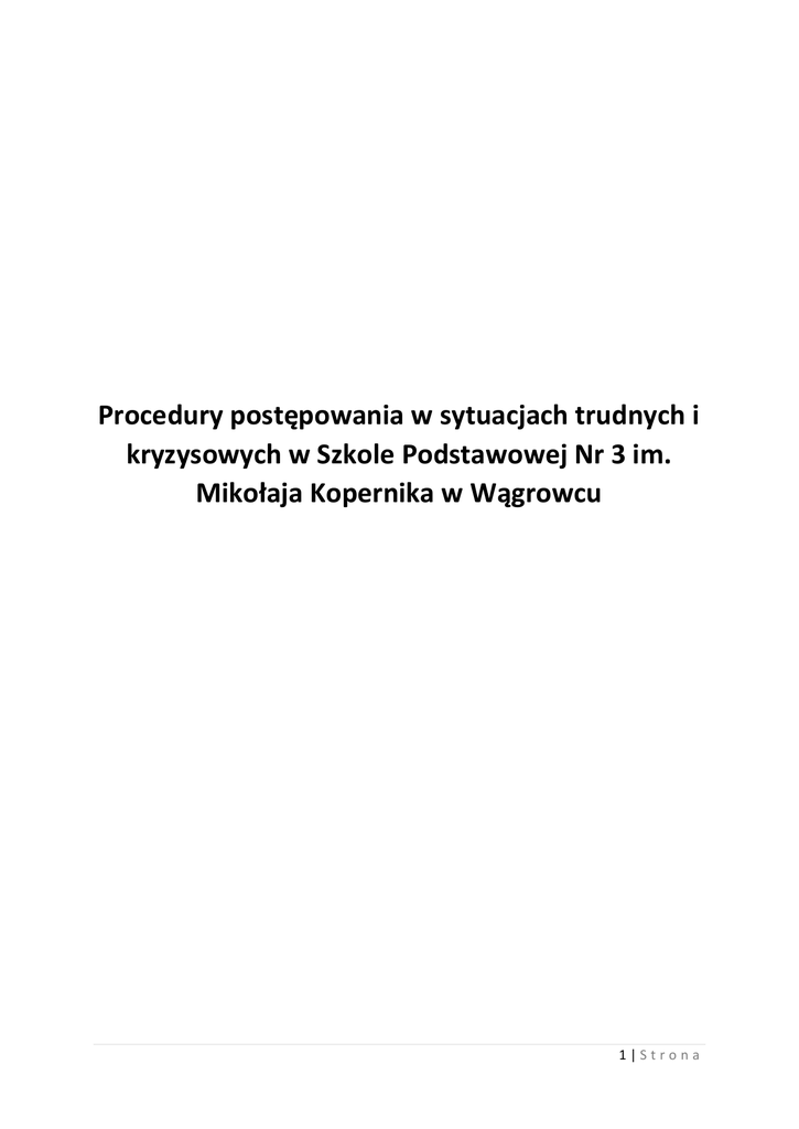 Procedury postępowania w sytuacjach trudnych i kryzysowych w Szkole Podstawowej Nr 3 im. Mikołaja Kopernika w Wągrowcu 1|Strona Spis treści 1. PODSTAWY PRAWNE str. 6 2. DEFINICJA BEZPIECZEŃSTWA str. 19 3. CELE PROCEDUR str. 19 4. ZAKRES PROCEDUR str. 19 5. OSOBY ODPOWIEDZIALNE str. 19 6. OPIS DZIAŁAŃ: • DZIAŁANIA DYREKTORA SZKOŁY str. 19 • DZIAŁANIA NAUCZYCIELI str. 20 • DZIAŁANIA PRACOWNIKÓW ADMINISTRACJI I OBSŁUGI str. 21 8. SZCZEGÓŁOWE PROCEDRY POSTĘPOWANIA • Procedura postępowania w przypadka niszczenia i dewastacji mienia szkolnego przez ucznia. • str. 22 Procedura postępowania w przypadku dokonania kradzieży przez ucznia. • str. 21 Procedura postępowania w przypadku, stosowania przemocy i agresji psychicznej przez uczniów. • str. 21 Procedura postępowania w przypadku stosowania agresji i przemocy fizycznej przez, uczniów. • str. 21 str. 22 Procedura postępowania w przypadku stwierdzenia nieobecności ucznia na zajęciach lekcyjnych uchylanie się od obowiązku szkolnego (wagary). • str. 23 Procedura postępowania w przypadku stwierdzenia znamion przestępczości u ucznia (wykroczenie, demoralizacja, popełnienie czynu karalnego). • str. 23 Procedura postępowania w przypadku używania nikotyny, alkoholu narkotyków innych substancji zmieniających świadomość przez uczniów na terenie szkoły i poza nią- współpraca z Policją. str. 24 2|Strona PROCEDURA WSPÓŁPRACY Z RODZICAMI str. 26 PROCEDURA POSTĘPOWANIA Z RODZICAMI UCHYLAJĄCYMI SIĘ OD WSPÓŁPRACY ZE SZKOŁĄ W PRZYPADKU PROBLEMÓW Z ICH DZIECKEM/ UCZNIEM str. 30 PROCEDURA POSTĘPOWANIA W PRZYPADKU UCZNIA SPRAWIAJĄCEGO TRUDNOŚCI WYCHOWAWCZE str. 30 PROCEDURA POSTĘPOWANIA WOBEC OSÓB OBCYCH WCHODZĄCYCH NA TEREN SZKOŁY str. 31 PROCEDURA POSTĘPOWANIA WOBEC RODZICA / OPIEKUNA GDZIE ISTNIEJE PODEJRZENIE, ŻE MOŻE SIĘ ON ZNAJDOWAĆ W STANIE WSKAZUJAZCYM NA SPOŻYCIE ALKOHOLULUB POD WPŁYWEM ZMIENIAJĄCYCH ŚWIADOMOŚĆ ZGŁASZAJĄCEGO SIĘ PO DZIECKO str. 31 PROCEDURA POSTĘPOWANIA W PRZYPADKU PODEJRZENIA, ŻE DZIECKO MOŻE BYĆ KRZYWDZONE W DOMU str. 32 PROCEDURA POSTĘPOWANIA W PRZYPADKU, GDY UCZEŃ STAŁ SIĘ OFIARA PRZEMOCY DOMOWEJ str. 32 PROCEDURA POSTĘPOWANIA Z UCZNIAMI UCZESTNIKAMI „BÓJKI" str. 33 3|Strona PROCEDURA POSTĘPOWANIA W PRZYPADKU ZAGINIĘCIA / ZNISZCZENIA DZIENNIKA str. 33 PROCEDURA POSTĘPOWANIA W PRZYPADKU ZAISTNIENIA WYPADKU UCZNIA W CZASIE ZAJĘĆ EDUKACYJNYCH, PRZERW MIĘDZYLEKCYJNYCH I WYCIECZEK str. 34 POSTĘPOWANIA W PRZYPADKU ŻAŁOBY PO ŚMIERCI UCZNIA str. 36 POSTĘPOWANIA NAUCZYCIELI W PRZYPADKU KONIECZNOŚCI ZAWIADOMIENIA O ŚMIERCI UCZNIA str. 37 POSTĘPOWANIA NAUCZYCIELI W SYTUACJACH PRÓB SAMOBÓJCZYCH, SAMOOKALECZENIACH LUB INNYCH ZWIĄZANYCH Z NARAŻENIEM ŻYCIA str. 38 PROCEDURA POSTĘPOWANIA W PRZYPADKU STWIERDZENIA CYBERPRZEMOCY str. 38 DOSTOSOWANIE WYMAGAŃ EDUKACYJNYCH DLA UCZNIÓW POSIADAJĄCYCH OPINIĘ Z PORADNI PSYCHOLOGICZNO- PEDAGOGICZNEJ str. 45 PROCEDURA WYDAWANIA OPINII O UCZNIU PRZEZ SZKOŁĘ str. 50 4|Strona Procedury bezpieczeństwa w szkole określające postępowania i reagowania nauczycieli oraz innych pracowników szkoły w sytuacjach: zagrożenia bezpieczeństwa, zdrowia i życia uczniów, wobec uczniów przejawiających negatywne zachowania, współpracy z rodzicami oraz innych nieprzewidzianych zdarzeń zakłócających proces dydaktyczno- opiekuńczo- wychowawczy szkoły. Na każdy zaistniały przejaw negatywnego zachowania uczniów, każdy nauczyciel i pracownik szkoły zobowiązany jest do odpowiedniego reagowania. Tylko wspólne, konsekwentne postępowanie nas dorosłych, odpowiedzialnych za dobre wychowanie uczniów może przynieść korzyść i sprawić, że w szkole wszyscy będziemy czuć się dobrze i będziemy wolni od wzajemnych narzekań. Na terenie szkoły dochodzi do zdarzeń, które mogą bezpośrednio zagrażać bezpieczeństwu zdrowiu i życiu uczniów. Właściwa reakcja wychowawcy, pedagoga, dyrekcji szkoły, adekwatna do zaistniałego zdarzenia oraz powiadomienie w razie potrzeby stosownych instytucji, daje gwarancję, że podjęte działania zapewniają bezpieczeństwo uczniów. Szkoła jest placówką zobowiązaną do wczesnej diagnozy objawów niedostosowania społecznego, profilaktyki oraz oddziaływań wychowawczych wobec uczniów. 5|Strona I. PODSTAWY PRAWNE: AKTY PRAWNE DOTYCZĄCE BEZPIECZEŃSTWA W SZKOLE 1.USTAWA o SYSTEMIE OŚWIATY z dnia 7 września 1991 r. (Dz. U. z 2004 r. Nr 256 póz. 2572 ze zmianami). Art. 1. System oświaty zapewnia w szczególności: 2) wspomaganie przez szkołę wychowawczej roli rodziny. 10) utrzymywanie bezpiecznych i higienicznych warunków nauki, wychowania i opieki w szkołach placówkach 12) opiekę dzieciom i młodzieży osieroconym, pozbawionym całkowicie lub częściowo opieki rodzicielskiej, a także uczniom pozbawionym całkowicie lub częściowo opieki, rodzicielskiej, a także uczniom pozostającym w trudnej sytuacji materialnej i życiowej, Art. 15. 1. Nauka jest obowiązkowa do ukończenia 18 roku życia. 2. Obowiązek szkolny dziecka rozpoczyna się z początkiem roku szkolnego w tym roku kalendarzowym, w którym dziecko kończy 7 lat, oraz trwa do ukończenia gimnazjum, nie dłużej jednak niż do ukończenia 18 roku życia. Art. 16. 5. Obowiązek szkolny spełnia się przez uczęszczanie do szkoły podstawowej i gimnazjum, publicznych albo niepublicznych, 5a. Po ukończeniu gimnazjum obowiązek nauki spełnia się: 1) przez uczęszczanie do publicznej lub niepublicznej szkoły ponadgimnazjalnej, 2) przez uczęszczanie na zajęcia realizowane w formach pozaszkolnych w placówkach publicznych i niepublicznych Art. 18. Rodzice dziecka podlegającego obowiązkowi szkolnemu są obowiązani do: 1) dopełnienia czynności związanych ze zgłoszeniem dziecka do szkoły, 2) zapewnienia regularnego uczęszczania dziecka na zajęcia szkolne, 3) zapewnienia dziecku warunków umożliwiających przygotowanie się do zajęć szkolnych, 6|Strona 4) zape