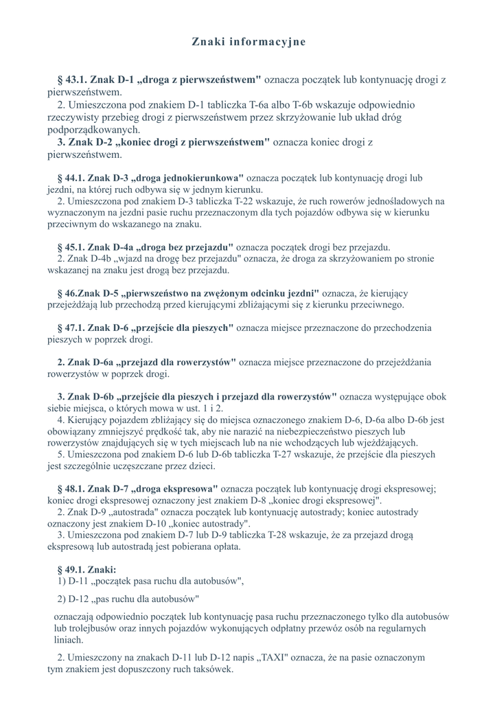 Znaki informacyjne § 43.1. Znak D-1 „droga z pierwszeństwem" oznacza początek lub kontynuację drogi z pierwszeństwem. 2. Umieszczona pod znakiem D-1 tabliczka T-6a albo T-6b wskazuje odpowiednio rzeczywisty przebieg drogi z pierwszeństwem przez skrzyżowanie lub układ dróg podporządkowanych. 3. Znak D-2 „koniec drogi z pierwszeństwem" oznacza koniec drogi z pierwszeństwem. § 44.1. Znak D-3 „droga jednokierunkowa" oznacza początek lub kontynuację drogi lub jezdni, na której ruch odbywa się w jednym kierunku. 2. Umieszczona pod znakiem D-3 tabliczka T-22 wskazuje, że ruch rowerów jednośladowych na wyznaczonym na jezdni pasie ruchu przeznaczonym dla tych pojazdów odbywa się w kierunku przeciwnym do wskazanego na znaku. § 45.1. Znak D-4a „droga bez przejazdu" oznacza początek drogi bez przejazdu. 2. Znak D-4b „wjazd na drogę bez przejazdu" oznacza, że droga za skrzyżowaniem po stronie wskazanej na znaku jest drogą bez przejazdu. § 46.Znak D-5 „pierwszeństwo na zwężonym odcinku jezdni" oznacza, że kierujący przejeżdżają lub przechodzą przed kierującymi zbliżającymi się z kierunku przeciwnego. § 47.1. Znak D-6 „przejście dla pieszych" oznacza miejsce przeznaczone do przechodzenia pieszych w poprzek drogi. 2. Znak D-6a „przejazd dla rowerzystów" oznacza miejsce przeznaczone do przejeżdżania rowerzystów w poprzek drogi. 3. Znak D-6b „przejście dla pieszych i przejazd dla rowerzystów" oznacza występujące obok siebie miejsca, o których mowa w ust. 1 i 2. 4. Kierujący pojazdem zbliżający się do miejsca oznaczonego znakiem D-6, D-6a albo D-6b jest obowiązany zmniejszyć prędkość tak, aby nie narazić na niebezpieczeństwo pieszych lub rowerzystów znajdujących się w tych miejscach lub na nie wchodzących lub wjeżdżających. 5. Umieszczona pod znakiem D-6 lub D-6b tabliczka T-27 wskazuje, że przejście dla pieszych jest szczególnie uczęszczane przez dzieci. § 48.1. Znak D-7 „droga ekspresowa" oznacza początek lub kontynuację drogi ekspresowej; koniec drogi ekspresowej oznaczony jest znakiem D-8 „koniec drogi ekspresowej". 2. Znak D-9 „autostrada" oznacza początek lub kontynuację autostrady; koniec autostrady oznaczony jest znakiem D-10 „koniec autostrady". 3. Umieszczona pod znakiem D-7 lub D-9 tabliczka T-28 wskazuje, że za przejazd drogą ekspresową lub autostradą jest pobierana opłata. § 49.1. Znaki: 1) D-11 „początek pasa ruchu dla autobusów", 2) D-12 „pas ruchu dla autobusów" oznaczają odpowiednio początek lub kontynuację pasa ruchu przeznaczonego tylko dla autobusów lub trolejbusów oraz innych pojazdów wykonujących odpłatny przewóz osób na regularnych liniach. 2. Umieszczony na znakach D-11 lub D-12 napis „TAXI" oznacza, że na pasie oznaczonym tym znakiem jest dopuszczony ruch taksówek. 3. Znak D-13 „początek pasa ruchu powolnego" oznacza początek pasa ruchu, z którego są obowiązani korzystać kierujący pojazdami nieosiągającymi na wzniesieniu minimalnej prędkości określonej na znaku liczbą kilometrów na godzinę. 4. Znak D-13a „początek pasa ruchu" oznacza początek pasa ruchu po stronie wskazanej na znaku. 5. Znak D-14 „koniec pasa ruchu" oznacza koniec skrajnego pasa ruchu, znajdującego się po stronie wskazanej na znaku; znak D-14 umieszczony przy pasie ruchu powolnego oznacza koniec tego pasa ruchu. § 50.Umieszczona pod znakiem D-7, D-8, D-9, D-10, D-13, D-13a lub D-14 tabliczka T-1a wskazuje odległość do początku lub końca drogi lub pasa ruchu. § 51.1. Znaki: 1) D-15 „przystanek autobusowy", 2) D-16 „przystanek trolejbusowy", 3) D-17 „przystanek tramwajowy" oznaczają miejsce zatrzymywania się wskazanych na znaku pojazdów wykonujących odpłatny przewóz osób na regularnych liniach. 2. Znak D-15 oznacza ponadto miejsce do zatrzymywania się innych niż autobus pojazdów samochodowych wykonujących odpłatny przewóz osób na regularnych liniach i pojazdów przeznaczonych do przewozu dzieci do szkół i przedszkoli. § 52.1. Znak D-18 „parking" oznacza miejsce przeznaczone na postój pojazdów (zespołów pojazdów), z wyjątkiem przyczep kempingowych; umieszczona pod znakiem tabliczka T-23e oznacza, że na parkingu jest dopuszczony także postój przyczep kempingowych. 2. Umieszczona pod znakiem D-18 tabliczka T-30 wskazuje sposób ustawienia pojazdu względem krawędzi jezdni oznaczonej na tabliczce barwą szarą oraz że miejsce jest przeznaczone dla pojazdów samochodowych o dopuszczalnej masie całkowitej nieprzekraczającej 2,5 t. 3. Umieszczona pod znakiem D-18 tabliczka T-3a wskazuje koniec miejsca przeznaczonego na postój. 4. Znak D-18a „parking – miejsce zastrzeżone" oznacza miejsce przeznaczone na postój pojazdu uprawnionej osoby. 5. Znak D-18b „parking zadaszony" oznacza miejsce przeznaczone na postój pojazdów znajdujące się w budynku lub pod wiatą. 6. Umieszczona pod znakiem D-18 lub D-18b tabliczka T-29 informuje o miejscu przeznaczonym dla pojazdu samochodowego uprawnionej osoby niepełnosprawnej o obniżonej sprawności ruchowej oraz dla kierującego pojazdem przewożącego taką osobę. § 53.1. Znak D-19 „postój taksówek" oznacza miejsce przeznaczone na postój taksówek osobowych, z wyjątkiem taksówek zajętych. 2. Znak D-20 „koniec postoju taksówek" oznacza miejsce, w którym kończy się postój taksówek; jeżeli na postoju taksówek nie umieszczono znaku D-20, to kończy się on w odległości nie większej niż 20 m przed znakiem D-19. 3. Umieszczony dodatkowo na znakach D-19 i D-20 napis „Bagażowe" wskazuje, że znaki te dotyczą taksówek bagażowych. Przepisy ust. 1 i 2 stosuje się odpowiednio. § 54.1. Znaki: 1) D-21 „szpital", 2) D-21a „Policja", 3) D-22 „punkt opatrunkowy", 4) D-23 „stacja paliwowa", 5) D-23a „stacja paliwowa tylko z gazem do napędu pojazdów", 6) D-24 „telefon", 7) D-25 „poczta", 8) D-26 „stacja obsługi technicznej", 9) D-26a „wulkaniza