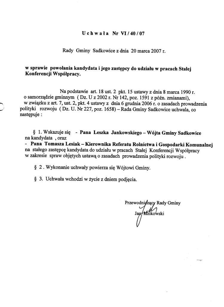 -,i u c h wal a Nr VI /40 /07 Rady Gminy Sadkowice z dnia 20 marca 2007 r. w sprawie powolania kandydata i jego zastêpcy do udzia³u w pracach Stalej Konferencji W spólpracy. Na podstawie art. 18 ust. 2 pkt. 15 ustawy z dnia 8 marca 1990 r. o samorz¹dzie gminnym (Dz. U z 2002 r. Nr 142, poz. 1591 z póŸnozmianami),"" w zwi¹zku z art. 7, ust. 2, pkt. 4 ustawy z dnia 6 grudnia 2006 r. o zasadachprowadzenia polityki rozwoju (Dz. U. Nr 227, poz. 1658) -Rada Gminy Sadkowice uchwala, co nastêpuje: § 1. W skazuje siê -Pana Leszka Jankowskiego -Wójta Gminy Sadkowice na kandydata, oraz -Pana Tomasza Lesiak -Kierownika Referatu Rolnictwa i Gospodarki Komunalnej na sta³ego zastêpcêkandydata do udzia³u w pracach Sta³ej Konferencji W spó³pracy w zakresie spraw objêtych ustaw¹ o zasadach prowadzenia polityki rozwoju. § 2. Wykonanie uchwa³y powierza siê Wójtowi Gminy. § 3. Uchwa³a wchodzi w ¿ycie z dniem podjêcia. Prze y Gminy ski