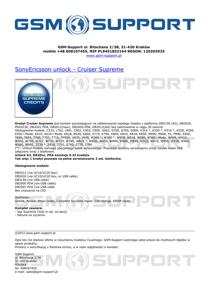 GSM-Support ul. Bitschana 2/38, 31-420 Kraków mobile +48 608107455, NIP PL9451852164 REGON: 120203925 www.gsm-support.pl SonyEricsson unlock - Cruiser Supreme Kredyt Cruiser Supreme jest kontem pozwalającym na odblokowanie każdego modelu z platformy DB3150 (A2), DB2020, PNX5230, DB2001-PDA, DB2012(new), DB2000-PDA, DB2012(old) bez patchowania w ciągu 30 sekund. Obsługiwane modele: C510, c702, c901, C902, C903, C905, G502, G700, G705, G900, K310 *, K320 *, K510 *, K530, K550, K550 i-Mode, K610, K610 i-Mode, K618, K630, K660, K770, K790, K800, K810, K818, K850, M600, M608, P1, P990, S500, T650, T658, T700, T707, T715, TM506, V630, V640, W200 *, W300 *, W508, W518, W580, W580 i-Mode, W595, W610, W660, W705, W707, W710, W715, W760, W810 *, W830, W850, W880, W888, W890, W902, W910, W950, W958, W960, W980, W995, Z530 *, Z610, Z710, Z750, Z770, Z780 (*) - unlock modelu wymaga specjalnego kabla serwisowego. Pozostałe telefony serwisujemy przez zwykły kabel USB załączony wraz z telefonem. Unlock A2, DB20xx, PDA kosztuje 0.33 kredytu Tak więc 1 kredyt pozwala na pełne serwisowanie 3 szt. telefonów. Obsługiwane modele: DB2012 (via UC10/UC20 box) DB2020 (via UC10/UC20 box, or USB cable) DB3150 (via USB cable) DB2000 PDA (via USB cable) DB2001 PDA (via USB cable Bez znaczenia na CID Możliwości: Unlock, Relock, Show codes, Complete SecZone repair, CID change, EROM repair Komplet zawiera: - logi Supreme (ilość w zal. od opcji) - faktura na życzenie ©2012 www.gsm-support.pl Opis ten nie stanowi oferty w rozumieniu Kodeksu Cywilnego. GSM-Support zastrzega sobie prawo do możliwych błędów w opisie produktu. Prosimy o weryfikację z Państwa strony, a w razie wątpliwości o kontakt. GSM-Support ul. Bitschana 2/38 31-420 Kraków POLSKA tel. 608107455 e-mail: [email protected] Powered by TCPDF (www.tcpdf.org)