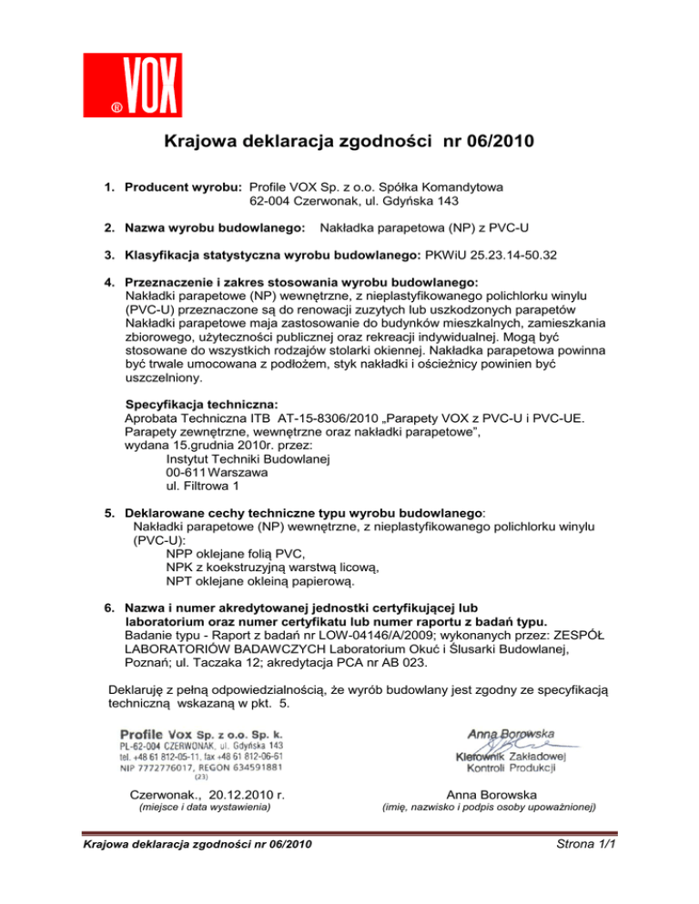 ® Krajowa deklaracja zgodności nr 06/2010 1. Producent wyrobu: Profile VOX Sp. z o.o. Spółka Komandytowa 62-004 Czerwonak, ul. Gdyńska 143 2. Nazwa wyrobu budowlanego: Nakładka parapetowa (NP) z PVC-U 3. Klasyfikacja statystyczna wyrobu budowlanego: PKWiU 25.23.14-50.32 4. Przeznaczenie i zakres stosowania wyrobu budowlanego: Nakładki parapetowe (NP) wewnętrzne, z nieplastyfikowanego polichlorku winylu (PVC-U) przeznaczone są do renowacji zuzytych lub uszkodzonych parapetów Nakładki parapetowe maja zastosowanie do budynków mieszkalnych, zamieszkania zbiorowego, użyteczności publicznej oraz rekreacji indywidualnej. Mogą być stosowane do wszystkich rodzajów stolarki okiennej. Nakładka parapetowa powinna być trwale umocowana z podłożem, styk nakładki i ościeżnicy powinien być uszczelniony. Specyfikacja techniczna: Aprobata Techniczna ITB AT-15-8306/2010 „Parapety VOX z PVC-U i PVC-UE. Parapety zewnętrzne, wewnętrzne oraz nakładki parapetowe”, wydana 15.grudnia 2010r. przez: Instytut Techniki Budowlanej 00-611 Warszawa ul. Filtrowa 1 5. Deklarowane cechy techniczne typu wyrobu budowlanego: Nakładki parapetowe (NP) wewnętrzne, z nieplastyfikowanego polichlorku winylu (PVC-U): NPP oklejane folią PVC, NPK z koekstruzyjną warstwą licową, NPT oklejane okleiną papierową. 6. Nazwa i numer akredytowanej jednostki certyfikującej lub laboratorium oraz numer certyfikatu lub numer raportu z badań typu. Badanie typu - Raport z badań nr LOW-04146/A/2009; wykonanych przez: ZESPÓŁ LABORATORIÓW BADAWCZYCH Laboratorium Okuć i Ślusarki Budowlanej, Poznań; ul. Taczaka 12; akredytacja PCA nr AB 023. Deklaruję z pełną odpowiedzialnością, że wyrób budowlany jest zgodny ze specyfikacją techniczną wskazaną w pkt. 5. Czerwonak., 20.12.2010 r. Anna Borowska (miejsce i data wystawienia) (imię, nazwisko i podpis osoby upoważnionej) Krajowa deklaracja zgodności nr 06/2010 Strona 1/1