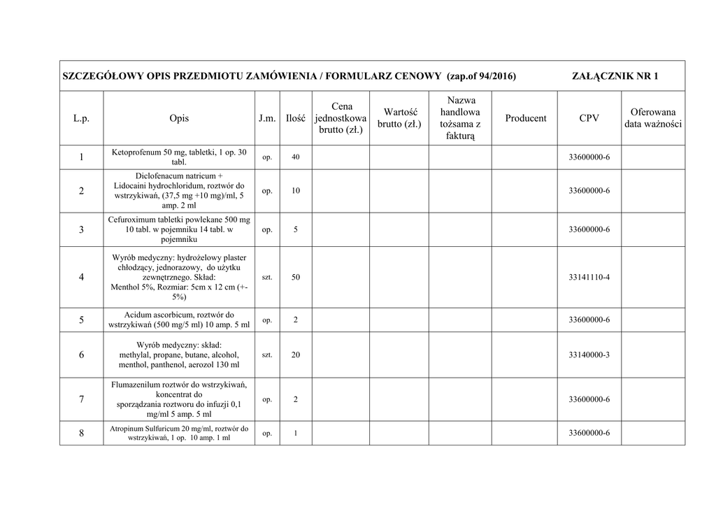 SZCZEGÓŁOWY OPIS PRZEDMIOTU ZAMÓWIENIA / FORMULARZ CENOWY (zap.of 94/2016) Cena J.m. Ilość jednostkowa brutto (zł.) Wartość brutto (zł.) Nazwa handlowa tożsama z fakturą Producent ZAŁĄCZNIK NR 1 L.p. Opis CPV 1 Ketoprofenum 50 mg, tabletki, 1 op. 30 tabl. op. 40 33600000-6 2 Diclofenacum natricum + Lidocaini hydrochloridum, roztwór do wstrzykiwań, (37,5 mg +10 mg)/ml, 5 amp. 2 ml op. 10 33600000-6 3 Cefuroximum tabletki powlekane 500 mg 10 tabl. w pojemniku 14 tabl. w pojemniku op. 5 33600000-6 4 Wyrób medyczny: hydrożelowy plaster chłodzący, jednorazowy, do użytku zewnętrznego. Skład: Menthol 5%, Rozmiar: 5cm x 12 cm (+5%) szt. 50 33141110-4 5 Acidum ascorbicum, roztwór do wstrzykiwań (500 mg/5 ml) 10 amp. 5 ml op. 2 33600000-6 6 Wyrób medyczny: skład: methylal, propane, butane, alcohol, menthol, panthenol, aerozol 130 ml szt. 20 33140000-3 7 Flumazenilum roztwór do wstrzykiwań, koncentrat do sporządzania roztworu do infuzji 0,1 mg/ml 5 amp. 5 ml op. 2 33600000-6 8 Atropinum Sulfuricum 20 mg/ml, roztwór do wstrzykiwań, 1 op. 10 amp. 1 ml op. 1 33600000-6 Oferowana data ważności 9 Jednorazowy, jałowy zestaw do szycia ran. Wyposażenie zestawu: serweta z laminatu foliowo-bibułowego 50x60 cm z otworem 8 cm, serweta z laminatu foliowo-bibułowego 45x75 cm do owinięcia, pęseta chirurgiczna metalowa, imadło metalowe 13,5 cm, nożyczki metalowe 11 cm, kompres włókninowy 30 gm2 7,5x7,5 cm - 5 sztuk, tupfer kula z gazy 17 N 20x20 cm - 3 sztuki, pęseta plastikowa 12,8 cm. kpl. 5 33140000-3 10 Ibuprofenum + Pseudoephedrini hydrochloridum 200 mg + 30 mg, tabletki powlekane, 1 op. 12 tabl. op. 15 33600000-6 11 Magnesium sulfate, roztwór do wstrzykiwań (2 g/10 ml) - 10 amp. 10 ml op. 2 33600000-6 12 Rifaximinum 200 mg, tabletki powlekane, 1 op. 12 tabl. op. 30 33600000-6 13 Skład: woda oczyszczona, D-panthenol, Pseudoalteromonas exopolysaccharides, gliceryna, glikol propylenowy, karboksymetyloceluloza, methyl parabene, benzalkonium chloride, żel do nosa nawilżająco-łagodzący, 1 op. 15 g op. 80 33600000-6 14 Menthylis salicylas + Mentholum (150 mg + 100 mg)/g, maść, 1 op. 50 g op. 140 33600000-6 15 Drotaverini hydrochloridum 40 mg/ml, 1 op. 5 amp. 2 ml op. 10 33600000-6 16 Acetylcysteinum 600 mg, tabletki musujące, 1 op. 10 tabl. op. 50 33600000-6 17 Acidum acetylsalicylicum tabletki musujące 324 mg 10 tabl. op. 30 33600000-6 18 Enoxaparinum natricum 40 mg/0,4 ml, roztwór do wstrzykiwań, 1 op. 10 amp.strzyk. 0,4 ml op. 5 33600000-6 19 Tetryzolini hydrochloridum krople do oczu, roztwór 0,5 mg/ml 1 op. 15 ml op. 100 33600000-6 20 Povidonum iodinatum żel 100 mg/g 1 tuba 10 ml szt. 30 33600000-6 21 Ibuprofenum 200 mg, tabletki drażowane, 1 op. 60 tabl. op. 20 33600000-6 22 Retinolum 400 j.m./g, maść, 1 tuba 30 g szt. 20 33600000-6 23 Retinoli palmitas + Tocopheroli acetas 30 000 j.m. + 70 mg, kapsułki miękkie, 1 op. 30 kaps. op. 25 33600000-6 24 Diazepamum 5 mg/ml roztwór do wstrzykiwań, 5 amp. 2 ml op. 2 33600000-6 25 Aluminii acetotartras żel 10 mg/g 1 tuba 75 g szt. 40 33600000-6 26 Oseltamivirum, 75 mg, kapsułki twarde, 1 op. 10 kaps. op. 10 33600000-6 27 Diosmectite, proszek do sporządzania zawiesiny doustnej, 1 op. 30 sasz. 3,76 g op. 10 33600000-6 28 Cyanocobalaminum 500 mcg/ml, roztwór do wstrzykiwań, 1 op. 5 amp. 2 ml op. 20 33600000-6 29 Amoxicillinum kapsułki twarde 500 mg 16 kaps. 10 33600000-6 30 Oxytetracyclini hydrochloridum + Polymyxini B sulfas + Hydrocortisoni acetas (5 mg + 10000 j.m. + 15 mg)/ml, krople do oczu i uszu, zawiesina, 1 tuba 5 ml szt. 10 33600000-6 31 Balsam z pantenolem, 1 op. 75 ml szt. 5 33600000-6 32 Acidum lacticum + Acidum salicylicum + Dimethylis sulfoxidum (63 mg + 100 mg + 20 mg)/g, płyn na skórę, 1 butelka 8 g szt. 15 33600000-6 op. psychotrop 33 Produkt ziołowy w formie syropu. Skład: 100ml syropu zawiera 4,36g wyciągu gęstego złożonego z ziela tymianku i korzenia pierwiosnka oraz 19,8mg tymolu, substancje pomocnicze: sacharoza, aromat pomarańczowy, woda oczyszczona. 1 butelka 100 ml szt. 10 33600000-6 34 Suplement diety. Skład: wit. A, luteina (500 mikro-g), tokoferol, kwas askorbinowy, wit. K1, tiamina, ryboflawina, pirydoksyna, wit. B12, wit. D, biotyna, kwasu foliowy, niacyna, kwasu pantotenowy, wapń, fosfor,g magnez, potas, chlor, żelazo, jod, miedz, mangan, chrom, molibden, selen, cynk, 1 op. 100 tabl. op. 10 33600000-6 35 Lactobacillus rhamnosus + Lactobacillus helveticus 2 x 109 CFU, kapsułki, 1 op. 20 kaps. op. 20 33600000-6 36 Drotaverini hydrochloridum roztwór do wstrzykiwań 20 mg/ml 5 amp. 2 ml op. 5 33600000-6 37 Oxytetracyclinum +Hydrocortisoni acetas maść (30 mg + 10mg)/g 1 tuba 10 g szt. 20 33600000-6 38 Dexpanthenolum 46,3 mg/g, aerozol do stosowania zewnętrznego, 1 op. 130 g szt. 5 33600000-6 39 Przylepiec z opatrunkiem wodoodporny, dwa rozmiary 1 op. 20 szt. op. 1 33600000-6 40 Światło chemiczne żółte 10 x 150, czas świecenia ok.. 12-24 godz. szt. 4 33140000-3 41 Światło chemiczne czerwone 10 x 150, czas świecenia ok.. 12-24 godz. szt. 3 33140000-3 42 Światło chemiczne zielone 10 x 150, czas świecenia ok.. 12-24 godz. szt. 3 33140000-3 43 Suplement diety. Skład: witamina A witamina B2 (ryboflawina),jod wapń,fosfor,cynk,magnez,mangan miedź,pantotenian wapnia witamina B12 (cyjanokobalamina) witamina D3 (cholekalcyferol) witamina B1 (tiamina) witamina PP (niacyna),molibden potas,fluor,rutyna witamina B6 (pirydoksyna) witamina E (tokoferol) kwas foliowy,żelazo witamina C (kwas askorbinowy), 1 op. 30 drażetek op. 20 33600000-6 44 Suplement diety. Skład: witamina A witamina B2 (ryboflawina),jod wapń,fosfor,cynk,magnez,mangan miedź,pantotenian wapnia witamina B12 (cyjanokobalamina) witamina D3 (cholekalcyferol) witamina B1 (tiamina) witamina PP (niacyna),molibden potas,fluor,rutyna witamina B6 (pirydoksyna) witamina E (tokoferol) kwas foliowy,żelazo witamina C (kwas askorbinowy), 1 op. 30 tabl. op. 20 33600000-6 RAZEM: UWAGI: Data ważności: 