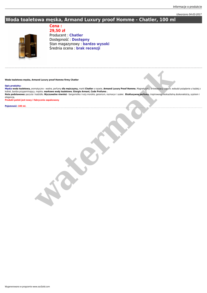 Informacje o produkcie Utworzono 04-03-2017 Woda toaletowa męska, Armand Luxury proof Homme - Chatler, 100 ml Cena : 29,50 zł Producent : Chatler Dostępność : Dostępny Stan magazynowy : bardzo wysoki Średnia ocena : brak recenzji er m ar k Woda toaletowa męska, Armand Luxury proof Homme firmy Chatler Opis produktu: Męska woda toaletowa, aromatyczno - wodne, perfumy dla mężczyzny, marki Chatler o nazwie, Armand Luxury Proof Homme. Magnetyczny, zniewalający zapach, wzbudzi pożądanie u każdej z kobiet, bardzo przypominający, męskie, markowe wody toaletowe, Giorgio Armani, Code Profumo . Nuta podstawowa: paczula i kadzidło, Wyczuwalne również - bergamotka i nuty morskie, geranium, rozmaryn i szałwi. Ekskluzywne perfumy, inspirowany nieskazitelną doskonałością, szykiem i elegancją. Produkt polski jest nowy i fabrycznie zapakowany w at Pojemność: 100 ml. Wygenerowano w programie www.oscGold.com