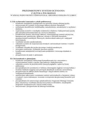 PRZEDMIOTOWY SYSTEM OCENIANIA Z JĘZYKA POLSKIEGO W SZKOLE PODSTAWOWEJ I GIMNAZJUM im. ARKADEGO FIEDLERA W LUBRZY I. Cele wychowania i nauczania w szkole podstawowej: - kształcenie umiejętności posługiwania się mówioną i pisaną odmianą języka, - motywowanie do czytania i krytycznego odbioru utworów literackich, - rozbudzanie dociekliwości intelektualnej, samodzielności, niezależności w myśleniu i działaniu, - wyposażenie uczniów w niezbędne wiadomości o budowie i funkcjonowaniu języka jako narzędzia porozumiewania się i tworzywa literatury, - kształtowanie postawy aktywnego odbiorcy, dostrzegającego wartości artystyczne, humanistyczne, patriotyczne, społeczne, zawarte w utworach literackich, przedstawieniach teatralnych, filmowych, słuchowiskach radiowych i audycjach telewizyjnych, - wyrabianie nawyku samokształcenia, - wdrażanie uczniów do rozpoznawania trwałych i uniwersalnych wartości i wzorów postępowania, - wyrabianie szacunku dla języka ojczystego i tradycji narodowych, - rozwijanie wrażliwości, wyobraźni, poczucia estetyki, - kształtowanie umiejętności rozwiązywania problemów i twórczego działania w zespole, - przygotowanie do nauki w gimnazjum. II. Cele kształcenia w gimnazjum: - kształcenie umiejętności skutecznego komunikowania się z otoczeniem z wykorzystaniem wiedzy o języku, jego budowie i funkcjonowaniu, - wdrażanie uczniów do prezentowania własnych poglądów i opinii na forum publicznym, - przysposabianie do uczestnictwa w kulturze; dostrzeganie ciągłości rozwoju kultury i trwałości ludzkich osiągnięć oraz powiązań aktualnych wydarzeń z przeszłością, - przygotowanie do odbioru dzieła literackiego i innych tekstów kultury we wzajemnych kontekstach, - umożliwianie odkrywania i rozumienia wartości uniwersalnych w literaturze, sztuce, w tradycji i życiu codziennym: tworzenie wewnętrznie akceptowanej hierarchii tych wartości, - przysposabianie do ustawicznego samokształcenia i bogacenia własnego warsztatu pracy umysłowej; wyrabianie nawyku korzystania ze słowników, encyklopedii, programów komputerowych i innych źródeł wiedzy, - motywowanie i przygotowanie do dalszego kształcenia. III. Cele PSO 1. Poinformowanie ucznia o poziomie jego osiągnięć edukacyjnych i uczynionych postępach. 2. Monitorowanie postępów ucznia. 3. Wyzwalanie motywacji do dalszej pracy. 4. Dostarczanie rodzicom (prawnym opiekunom) i nauczycielom informacji o postępach, uzdolnieniach i trudnościach ucznia. 5. Doskonalenie organizacji i metod pracy nauczyciela, ewaluacja i modyfikowanie procesu nauczania. IV. Formy aktywności ucznia podlegające ocenie na języku polskim: - prace klasowe (wypracowanie klasowe), - sprawdziany z kształcenia literackiego i językowego, - testy, - dyktanda, - kartkówki, - wypowiedzi ustne, - wypowiedzi pisemne (odp. na pytanie, rozwiązania ćwiczeń, redagowanie tekstów użytkowych i form wypowiedzi przewidzianych w programie nauczania), - prezentacje żywego słowa: recytacja prozy i poezji z pamięci, scenki, dramy, inscenizacje, - praca na lekcji, - praca nad lekturą, - czytanie, - zeszyt przedmiotowy i zeszyt ćwiczeń, - udział w akademiach, apelach, konkursach przedmiotowych, literackich, poetyckich, recytatorskich, ortograficznych, - niewerbalne wytwory pracy: album, słownik, plakat, mapa, przekład intersemiotyczny, słuchowisko. V. Zasady PSO 1. Nauczyciel na początku roku szkolnego informuje uczniów o obszarach i zasadach oceniania na języku polskim. Fakt ten odnotowuje w dzienniku lekcyjnym. 2. Prace klasowe, sprawdziany z kształcenia literackiego i językowego, testy są obowiązkowe, zapowiadane z tygodniowym wyprzedzeniem. Nauczyciel poprzedza je określeniem wymaganych treści i umiejętności podstawowych i ponadpodstawowych. Kontrola osiągnięć uczniów poprzedzona jest lekcją powtórzeniową. 3. Raz w semestrze praca klasowa (wypracowanie) oceniana będzie wg zasad oceniania kształtującego na podstawie karty stanowiącej załącznik do PSO. 4. Uczeń nieobecny na pracy klasowej, sprawdzianie lub teście ma obowiązek uzupełnienia zaległości w ciągu 2 tygodni. Jeśli tego nie uczyni z przyczyn nieusprawiedliwionych, otrzyma ocenę niedostateczną. W przypadku usprawiedliwionej nieobecności nauczyciel w porozumieniu z uczniem wyznacza nowy termin, jednak nie dłuższy niż tydzień od poprzedniego. 5. Uczeń ma prawo do poprawy jedynie oceny ndst z pracy klasowej, sprawdzianu, testu w ciągu dwóch tygodni od dnia jej otrzymania, przy czym wymagania i kryteria oceniania pozostają niezmienne. Ocena ndst poprawiona zyskuje wagę 1. 6. Uczeń jest zobowiązany do zaliczenia kluczowych zagadnień (np.: obowiązkowe teksty literackie, zagadnienia z literatury i z nauki o języku). W przypadku niepoprawienia ocen ndst, otrzymuje ocenę niedostateczną na koniec danego semestru. 7. Ocenianie jest jawne i systematyczne. 8. Zapowiedziane z tygodniowym wyprzedzeniem formy kontroli osiągnięć ucznia (pr. kl., spr., testy) oraz długoterminowe prace domowe są sprawdzane w ciągu 2 tygodni i omówione z uwzględnieniem kryteriów oceniania. Opatrzone są punktacją lub recenzją ustną bądź pisemną. Prace domowe są sprawdzane na kolejną lekcję. 9. Uczeń nie ponosi żadnych konsekwencji, jeśli zgłosi brak przygotowania, który nastąpił z powodu ważnych przyczyn lub dłuższej usprawiedliwionej nieobecności w szkole. Może być również nieprzygotowany raz w semestrze bez podania przyczyny, Nie dotyczy to lekcji powtórzeniowych. Nieprzygotowanie należy zgłaszać przed lekcją. 10. Prace domowe winny być wykonywane w terminie. Ich brak nauczyciel odnotowuje w dzienniku i wyznacza nowy termin. W przypadku ponownego niedotrzymania uczeń otrzymuje ocenę niedostateczną. Raz w semestrze uczeń może nie odrobić pracy domowej bez podania przyczyny. Nie dotyczy to długoterminowych prac domowych. 11. Uczeń ma obowiązek nosić podręcznik i zeszy