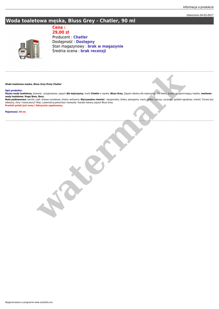 Informacje o produkcie Utworzono 04-03-2017 Woda toaletowa męska, Bluss Grey - Chatler, 90 ml Cena : 29,00 zł Producent : Chatler Dostępność : Dostępny Stan magazynowy : brak w magazynie Średnia ocena : brak recenzji er m ar k Woda toaletowa męska, Bluss Grey firmy Chatler Opis produktu: Męska woda toaletowa, drzewno - przyprawowa, zapach dla mężczyzny, marki Chatler o nazwie, Bluss Grey. Zapach idealny dla mężczyzny, XXI wieku, bardzo przypominający męskie, markowe wody toaletowe, Hugo Boss, Boss. Nuta podstawowa: wanilia, cedr, drzewo sandałowe, oliwka, wetiweria. Wyczuwalne również - bergamotka, śliwka, pelargonia, mech, jabłko, cytrusy, cynamon, goździk ogrodowy, mahoń. Chcesz być odważny, silny i nowoczesny? Więc z pewnością pokochasz niezwykły i bardzo lubiany zapach Bluss Grey. Produkt polski jest nowy i fabrycznie zapakowany w at Pojemność: 90 ml. Wygenerowano w programie www.oscGold.com