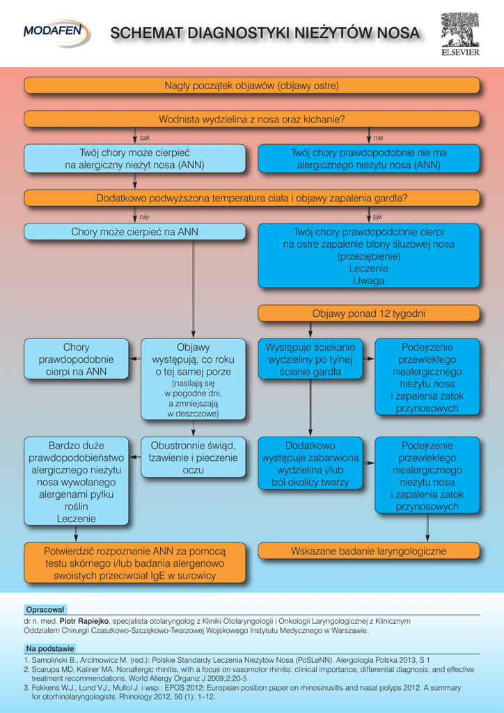 SCHEMAT DIAGNOSTYKI NIEŻYTÓW NOSA Nagły początek objawów (objawy ostre) Wodnista wydzielina z nosa oraz kichanie? tak nie Twój chory może cierpieć na alergiczny nieżyt nosa (ANN) Twój chory prawdopodobnie nie ma alergicznego nieżytu nosa (ANN) Dodatkowo podwyższona temperatura ciała i objawy zapalenia gardła? nie tak Chory może cierpieć na ANN Twój chory prawdopodobnie cierpi na ostre zapalenie błony śluzowej nosa (przeziębienie) Leczenie Uwaga Objawy ponad 12 tygodni Chory prawdopodobnie cierpi na ANN Objawy występują, co roku o tej samej porze Występuje ściekanie wydzieliny po tylnej ścianie gardła Podejrzenie przewlekłego niealergicznego nieżytu nosa i zapalenia zatok przynosowych Dodatkowo występuje zabarwiona wydzielina i/lub ból okolicy twarzy Podejrzenie przewlekłego niealergicznego nieżytu nosa i zapalenia zatok przynosowych (nasilają się w pogodne dni, a zmniejszają w deszczowe) Bardzo duże prawdopodobieństwo alergicznego nieżytu nosa wywołanego alergenami pyłku roślin Leczenie Obustronnie świąd, łzawienie i pieczenie oczu Potwierdzić rozpoznanie ANN za pomocą testu skórnego i/lub badania alergenowo swoistych przeciwciał IgE w surowicy Wskazane badanie laryngologiczne Opracował dr n. med. Piotr Rapiejko, specjalista otolaryngolog z Kliniki Otolaryngologii i Onkologii Laryngologicznej z Klinicznym Oddziałem Chirurgii Czaszkowo-Szczękowo-Twarzowej Wojskowego Instytutu Medycznego w Warszawie. Na podstawie 1. Samoliński B., Arcimowicz M. (red.): Polskie Standardy Leczenia Nieżytów Nosa (PoSLeNN). Alergologia Polska 2013, S 1 2. Scarupa MD, Kaliner MA. Nonallergic rhinitis, with a focus on vasomotor rhinitis: clinical importance, differential diagnosis, and effective treatment recommendations. World Allergy Organiz J 2009;2:20-5 3. Fokkens W.J., Lund V.J., Mullol J. i wsp.: EPOS 2012: European position paper on rhinosinusitis and nasal polyps 2012. A summary for otorhinolaryngologists. Rhinology 2012, 50 (1): 1–12.