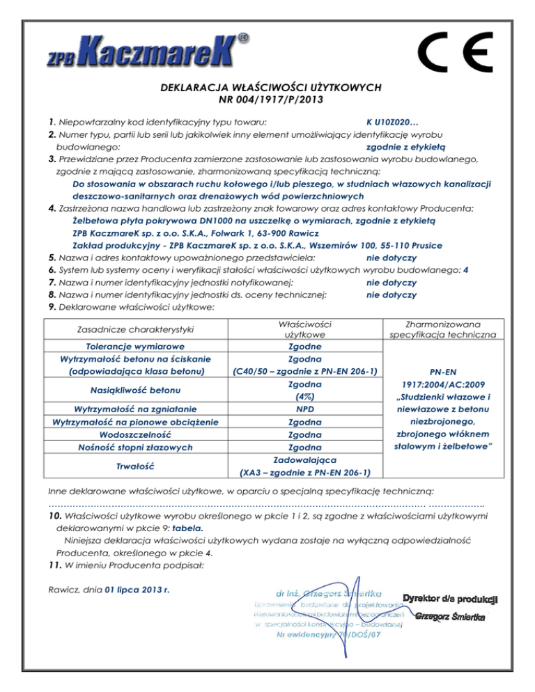 DEKLARACJA WŁAŚCIWOŚCI UŻYTKOWYCH NR 004/1917/P/2013 1. Niepowtarzalny kod identyfikacyjny typu towaru: K U10Z020… 2. Numer typu, partii lub serii lub jakikolwiek inny element umożliwiający identyfikację wyrobu budowlanego: zgodnie z etykietą 3. Przewidziane przez Producenta zamierzone zastosowanie lub zastosowania wyrobu budowlanego, zgodnie z mającą zastosowanie, zharmonizowaną specyfikacją techniczną: Do stosowania w obszarach ruchu kołowego i/lub pieszego, w studniach włazowych kanalizacji deszczowo-sanitarnych oraz drenażowych wód powierzchniowych 4. Zastrzeżona nazwa handlowa lub zastrzeżony znak towarowy oraz adres kontaktowy Producenta: Żelbetowa płyta pokrywowa DN1000 na uszczelkę o wymiarach, zgodnie z etykietą ZPB KaczmareK sp. z o.o. S.K.A., Folwark 1, 63-900 Rawicz Zakład produkcyjny - ZPB KaczmareK sp. z o.o. S.K.A., Wszemirów 100, 55-110 Prusice 5. Nazwa i adres kontaktowy upoważnionego przedstawiciela: nie dotyczy 6. System lub systemy oceny i weryfikacji stałości właściwości użytkowych wyrobu budowlanego: 4 7. Nazwa i numer identyfikacyjny jednostki notyfikowanej: nie dotyczy 8. Nazwa i numer identyfikacyjny jednostki ds. oceny technicznej: nie dotyczy 9. Deklarowane właściwości użytkowe: Zasadnicze charakterystyki Tolerancje wymiarowe Właściwości użytkowe Zgodne Zharmonizowana specyfikacja techniczna Wytrzymałość betonu na ściskanie Zgodna (odpowiadająca klasa betonu) (C40/50 – zgodnie z PN-EN 206-1) PN-EN Zgodna 1917:2004/AC:2009 (4%) „Studzienki włazowe i Wytrzymałość na zgniatanie NPD niewłazowe z betonu Wytrzymałość na pionowe obciążenie Zgodna niezbrojonego, Wodoszczelność Zgodna zbrojonego włóknem Nośność stopni złazowych Zgodna stalowym i żelbetowe” Nasiąkliwość betonu Trwałość Zadowalająca (XA3 – zgodnie z PN-EN 206-1) Inne deklarowane właściwości użytkowe, w oparciu o specjalną specyfikację techniczną: ……………………………………………………………………………………………………………… ………………. 10. Właściwości użytkowe wyrobu określonego w pkcie 1 i 2, są zgodne z właściwościami użytkowymi deklarowanymi w pkcie 9: tabela. Niniejsza deklaracja właściwości użytkowych wydana zostaje na wyłączną odpowiedzialność Producenta, określonego w pkcie 4. 11. W imieniu Producenta podpisał: Rawicz, dnia 01 lipca 2013 r.