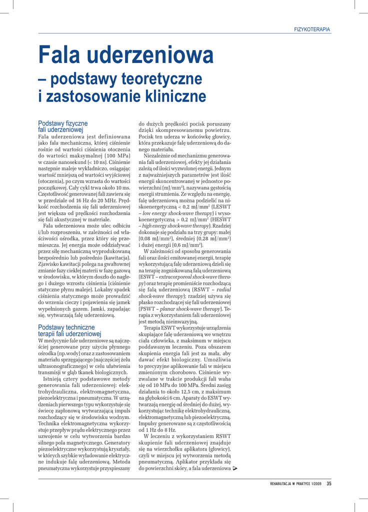 FIZYKOTERAPIA Fala uderzeniowa – podstawy teoretyczne i zastosowanie kliniczne Podstawy fizyczne fali uderzeniowej Fala uderzeniowa jest definiowana jako fala mechaniczna, której ciśnienie rośnie od wartości ciśnienia otoczenia do wartości maksymalnej (100 MPa) w czasie nanosekund (< 10 ns). Ciśnienie następnie maleje wykładniczo, osiągając wartość mniejszą od wartości wyjściowej (otoczenia), po czym wzrasta do wartości początkowej. Cały cykl trwa około 10 ms. Częstotliwość generowanej fali zawiera się w przedziale od 16 Hz do 20 MHz. Prędkość rozchodzenia się fali uderzeniowej jest większa od prędkości rozchodzenia się fali akustycznej w materiale. Fala uderzeniowa może ulec odbiciu i/lub rozproszeniu, w zależności od właściwości ośrodka, przez który się przemieszcza. Jej energia może oddziaływać przez siłę mechaniczną wyprodukowaną bezpośrednio lub pośrednio (kawitacja). Zjawisko kawitacji polega na gwałtownej zmianie fazy ciekłej materii w fazę gazową w środowisku, w którym doszło do nagłego i dużego wzrostu ciśnienia (ciśnienie statyczne płynu maleje). Lokalny spadek ciśnienia statycznego może prowadzić do wrzenia cieczy i pojawienia się jamek wypełnionych gazem. Jamki, zapadając się, wytwarzają falę uderzeniową. Podstawy techniczne terapii fali uderzeniowej W medycynie fale uderzeniowe są najczęściej generowane przy użyciu płynnego ośrodka (np.wody) oraz z zastosowaniem materiału sprzęgającego (najczęściej żelu ultrasonograficznego) w celu ułatwienia transmisji w głąb tkanek biologicznych. Istnieją cztery podstawowe metody generowania fali uderzeniowej: elektrohydrauliczna, elektromagnetyczna, piezoelektryczna i pneumatyczna. W urządzeniach pierwszego typu wykorzystuje się świecę zapłonową wytwarzającą impuls rozchodzący się w środowisku wodnym. Technika elektromagnetyczna wykorzystuje przepływ prądu elektrycznego przez uzwojenie w celu wytworzenia bardzo silnego pola magnetycznego. Generatory piezoelektryczne wykorzystują kryształy, w których szybkie wyładowanie elektryczne indukuje falę uderzeniową. Metoda pneumatyczna wykorzystuje przyspieszany do dużych prędkości pocisk poruszany dzięki skompresowanemu powietrzu. Pocisk ten uderza w końcówkę głowicy, która przekazuje falę uderzeniową do danego materiału. Niezależnie od mechanizmu generowania fali uderzeniowej, efekty jej działania zależą od ilości wyzwolonej energii. Jednym z najważniejszych parametrów jest ilość energii skoncentrowanej w jednostce powierzchni (mJ/mm2), nazywana gęstością energii strumienia. Ze względu na energię, falę uderzeniową można podzielić na niskoenergetyczną < 0,2 mJ/mm2 (LESWT – low energy shock-wave therapy) i wysokoenergetyczną > 0,2 mJ/mm2 (HESWT – high energy shock-wave therapy). Rzadziej dokonuje się podziału na trzy grupy: małej (0,08 mJ/mm2), średniej (0,28 mJ/mm2) i dużej energii (0,6 mJ/mm2). W zależności od sposobu generowania fali oraz ilości emitowanej energii, terapię wykorzystującą falę uderzeniową dzieli się na terapię zogniskowaną falą uderzeniową (ESWT – extracorporeal shock-wave therapy) oraz terapię promieniście rozchodzącą się falą uderzeniową (RSWT – radial shock-wave therapy); rzadziej używa się płasko rozchodzącej się fali uderzeniowej (PSWT – planar shock-wave therapy). Terapia z wykorzystaniem fali uderzeniowej jest metodą nieinwazyjną. Terapia ESWT wykorzystuje urządzenia skupiające falę uderzeniową we wnętrzu ciała człowieka, z maksimum w miejscu poddawanym leczeniu. Poza obszarem skupienia energia fali jest za mała, aby dawać efekt biologiczny. Umożliwia to precyzyjne aplikowanie fali w miejscu zmienionym chorobowo. Ciśnienie wyzwalane w trakcie produkcji fali waha się od 10 MPa do 100 MPa. Średni zasięg działania to około 12,5 cm, z maksimum na głębokości 6 cm. Aparaty do ESWT wytwarzają energię od średniej do dużej, wykorzystując technikę elektrohydrauliczną, elektromagnetyczną lub piezoelektryczną. Impulsy generowane są z częstotliwością od 1 Hz do 8 Hz. W leczeniu z wykorzystaniem RSWT skupienie fali uderzeniowej znajduje się na wierzchołku aplikatora (głowicy), czyli w miejscu jej wytworzenia metodą pneumatyczną. Aplikator przykłada się do powierzchni skóry, a fala uderzeniowa REHABILITACJA W PRAKTYCE 1/2009 35 fot. Archiwum BTL FIZYKOTERAPIA rozchodzi się promieniście w tkankach, penetrując je do głębokości ok. 3,5 cm. Wytwarzane ciśnienie wynosi najczęściej 12,3 MPa. Urządzenia do terapii RSWT generują energię od małej do średniej. Częstotliwość generowania impulsów to 1-21 Hz. Stosowanie kliniczne terapii uderzeniowej Terapię z wykorzystaniem płasko rozchodzącej się fali uderzeniowej PSWT wykorzystuje się głównie w leczeniu ran. W metodzie tej wykorzystywana jest technika pneumatyczna generowania fali uderzeniowej, jednakże skupienie fali powstaje w środkowej części głowicy zbudowanej w kształcie parabolicznego reflektora. Powoduje to rozchodzenie się fali uderzeniowej na dużej powierzchni. Głębokość penetracji to około 5,5 cm. Właściwe umiejscowienie generatora (aplikatora) na powierzchni skóry gwarantuje powodzenie zabiegu. Istnieją dwie grupy metod lokalizacji zmian chorobowych. Pierwsza z nich bazuje na metodach obrazowania, takich jak: ultrasonografia, fluoroskopia, tomografia komputerowa. Metody te umożliwiają bardzo precyzyjne zlokalizowanie zmian chorobowych, które w niektórych przypadkach niestety nie korelują z obszarem bólowym. Druga metoda jest znacznie prostsza i polega na podaniu fali uderzeniowej w miejsce charakteryzujące się największym bólem. W tym przypadku konieczna jest współpraca pacjenta, który wskaże obszar najbardziej bolący. Ostatni sposób aplikacji fali uderzeniowej uniemożliwia stosowanie znieczulenia, co stanowi ograniczenie w przypadku dużych energii fali. W l