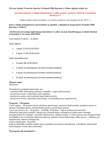 Wyższa Szkoła Trenerów Sportu i Związek Piłki Ręcznej w Polsce ogłasza nabór na kurs instruktorów i studia podyplomowe z piłki ręcznej– poziom 1 RINCK Convention (licencja C) (odpowiednik tytułu instruktora w świetle przepisów obowiązujących do 2013 r.) Kurs i studia podyplomowe prowadzone są zgodnie z oficjalnym programem Związku Piłki Ręcznej w Polsce!* Absolwenci otrzymują legitymację instruktora w piłce ręcznej umożliwiającą wydanie licencji trenerskiej C na sezon 2015/2016 Czas trwania: II.2015 r.- VI.2015r. Część ogólna: I zjazd: 27.02-01.03.2015r. II zjazd: 17.04-19.04.2015r. Część specjalistyczna: III zjazd: 08-10.05.2015r. IV zjazd: (w późniejszym terminie zostanie podane) V zjazd: (w późniejszym terminie zostanie podane) VI zjazd: (w późniejszym terminie zostanie podane) Miejsce zajęć: Warszawa Warunkiem uzyskania uprawnień jest: - minimum 80% frekwencja podczas wykładów i zajęć praktycznych; - pozytywna ocena z zaliczenia części ogólnej; - pozytywna ocena z prowadzenia zajęć praktycznych; - pozytywna ocena z egzaminu końcowego i ewentualnej pracy dyplomowej; Program - 120 godzin Część ogólna – 40 godzin (teoria szkolenia sportowego, anatomia funkcjonalna, podstawy prawa w sporcie, fizjologia sportu, biomechanika sportu, psychologia sportu) Część specjalistyczna – 30 godzin – wykłady, 40 godzin - zajęcia praktyczne/warsztaty Metodyka nauczania techniki i taktyki gry; kontrola pracy treningowej; planowanie treningu, przygotowanie do treningu i zawodów sportowych; zadania trenera w czasie meczu oraz przygotowanie zawodników do rywalizacji międzynarodowej; zadania trenera klubowego; piłka ręczna – odmiany gry; sędziowanie; odnowa biologiczna; Część seminaryjna -10 godzin Zajęcia obejmują ustalenie tematu pracy pisemnej oraz pomoc metodyczną. Certyfikaty ukończenia kursu będą po ocenie pracy pisemnej. Wymagania dla kandydatów: Wykształcenie co najmniej średnie. Wymagana dokumentacja: 1. 2. 3. 4. 5. Wypełniony wniosek o przyjęcie na kurs/studia podyplomowe instruktora piłki ręcznej; Kopia dowodu osobistego; Podpisane imieniem i nazwiskiem 2 fotografie o wymiarach: 3,5cm x 4,5cm; Zaświadczenie lekarskie, potwierdzające możliwość wzięcia udziału w kursie instruktorów piłki ręcznej; Dowód wpłaty. Dokumenty należy złożyć osobiście lub wysłać na adres: Wyższa Szkoła Trenerów Sportu ul. Myśliwiecka 9 pok.124 00-459 Warszawa Opłaty za kurs: 1 500 zł - istnieje możliwość rozłożenia płatności na raty: I rata 500 zł - płatna w momencie zapisu na kurs, II rata 1000 zł - płatna do 20.03.2015 r., Opłaty za studia podyplomowe: 1 700 zł - istnieje możliwość rozłożenia płatności na raty: I rata 700 zł - płatna w momencie zapisu na kurs, II rata 1000 zł - płatna do 20.03.2015 r., Płatności należy dokonywać na podany poniżej nr konta bankowego z dopiskiem: Imię i nazwisko, kurs/ studia podyplomowe instruktor piłki ręcznej (licencja C) Wyższa Szkoła Trenerów Sportu ul. Myśliwiecka 9, 00-459 Warszawa Nr rachunku: Nr konta: 26 1240 1109 1111 0010 3468 6215 Bank PEKAO S.A VII Oddział w Warszawie Uwaga: Opłata za kurs/studia podyplomowe obejmuje część dydaktyczną (część ogólną i specjalistyczną), materiały edukacyjne w wersji elektronicznej oraz wynajem na czas trwania kursu obiektów i sprzętu specjalistycznego. Wyżywienie i zakwaterowanie oraz dojazd uczestników są organizowane we własnym zakresie. Kadra wykładowców: Pracownicy naukowi, trenerzy klasy II, I M z doświadczeniem w pracy z kadrami narodowymi. Kontakt: Wyższa Szkoła Trenerów Sportu, e-mail: [email protected], [email protected] tel. 22 490 44 47, 22 490 40 97 Dorota Liese-Romanowska e-mail: [email protected] tel/fax.: +48 (22) 892 90 11 wew: 107 Słuchacze mogą samodzielnie rezerwować hotel: 1. Warszawskie Centrum Sportu Młodzieżowego "Agrykola" 00-459 Warszawa, ul. Myśliwiecka 9, tel. 022 622 91 07, 622 91 10, 622 91 11 2. Hotel Ibis ul. Zagórna 1 00-441 Warszawa tel. 22 745 36 60 *System licencyjny ZPRP oraz program kursu jest zgodny z wytycznymi porozumienia narodowych federacji z Europejską Federacją Piłki Ręcznej (EHF) p.n. RINCK Convention, którego jednym z sygnatariuszy jest Związek Piłki Ręcznej w Polsce.