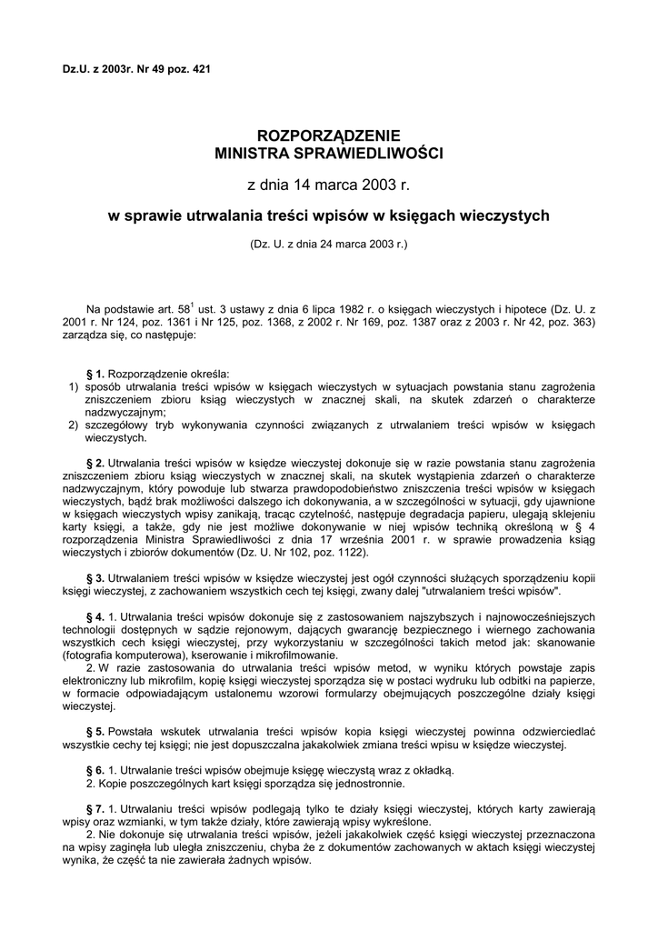 Dz.U. z 2003r. Nr 49 poz. 421 ROZPORZĄDZENIE MINISTRA SPRAWIEDLIWOŚCI z dnia 14 marca 2003 r. w sprawie utrwalania treści wpisów w księgach wieczystych (Dz. U. z dnia 24 marca 2003 r.) 1 Na podstawie art. 58 ust. 3 ustawy z dnia 6 lipca 1982 r. o księgach wieczystych i hipotece (Dz. U. z 2001 r. Nr 124, poz. 1361 i Nr 125, poz. 1368, z 2002 r. Nr 169, poz. 1387 oraz z 2003 r. Nr 42, poz. 363) zarządza się, co następuje: § 1. Rozporządzenie określa: 1) sposób utrwalania treści wpisów w księgach wieczystych w sytuacjach powstania stanu zagrożenia zniszczeniem zbioru ksiąg wieczystych w znacznej skali, na skutek zdarzeń o charakterze nadzwyczajnym; 2) szczegółowy tryb wykonywania czynności związanych z utrwalaniem treści wpisów w księgach wieczystych. § 2. Utrwalania treści wpisów w księdze wieczystej dokonuje się w razie powstania stanu zagrożenia zniszczeniem zbioru ksiąg wieczystych w znacznej skali, na skutek wystąpienia zdarzeń o charakterze nadzwyczajnym, który powoduje lub stwarza prawdopodobieństwo zniszczenia treści wpisów w księgach wieczystych, bądź brak możliwości dalszego ich dokonywania, a w szczególności w sytuacji, gdy ujawnione w księgach wieczystych wpisy zanikają, tracąc czytelność, następuje degradacja papieru, ulegają sklejeniu karty księgi, a także, gdy nie jest możliwe dokonywanie w niej wpisów techniką określoną w § 4 rozporządzenia Ministra Sprawiedliwości z dnia 17 września 2001 r. w sprawie prowadzenia ksiąg wieczystych i zbiorów dokumentów (Dz. U. Nr 102, poz. 1122). § 3. Utrwalaniem treści wpisów w księdze wieczystej jest ogół czynności służących sporządzeniu kopii księgi wieczystej, z zachowaniem wszystkich cech tej księgi, zwany dalej "utrwalaniem treści wpisów". § 4. 1. Utrwalania treści wpisów dokonuje się z zastosowaniem najszybszych i najnowocześniejszych technologii dostępnych w sądzie rejonowym, dających gwarancję bezpiecznego i wiernego zachowania wszystkich cech księgi wieczystej, przy wykorzystaniu w szczególności takich metod jak: skanowanie (fotografia komputerowa), kserowanie i mikrofilmowanie. 2. W razie zastosowania do utrwalania treści wpisów metod, w wyniku których powstaje zapis elektroniczny lub mikrofilm, kopię księgi wieczystej sporządza się w postaci wydruku lub odbitki na papierze, w formacie odpowiadającym ustalonemu wzorowi formularzy obejmujących poszczególne działy księgi wieczystej. § 5. Powstała wskutek utrwalania treści wpisów kopia księgi wieczystej powinna odzwierciedlać wszystkie cechy tej księgi; nie jest dopuszczalna jakakolwiek zmiana treści wpisu w księdze wieczystej. § 6. 1. Utrwalanie treści wpisów obejmuje księgę wieczystą wraz z okładką. 2. Kopie poszczególnych kart księgi sporządza się jednostronnie. § 7. 1. Utrwalaniu treści wpisów podlegają tylko te działy księgi wieczystej, których karty zawierają wpisy oraz wzmianki, w tym także działy, które zawierają wpisy wykreślone. 2. Nie dokonuje się utrwalania treści wpisów, jeżeli jakakolwiek część księgi wieczystej przeznaczona na wpisy zaginęła lub uległa zniszczeniu, chyba że z dokumentów zachowanych w aktach księgi wieczystej wynika, że część ta nie zawierała żadnych wpisów. 3. W przypadku, o którym mowa w ust. 2, sędzia lub referendarz sądowy dokonuje adnotacji na kopii księgi wieczystej o tych działach, które nie zawierały wpisów, a zaginęły lub uległy zniszczeniu. § 8. 1. Powstałą wskutek utrwalania treści wpisów kopię księgi wieczystej uwierzytelnia sędzia lub referendarz sądowy, składając na tej kopii czytelny podpis i zamieszczając przy nim datę. Przed podpisem zamieszcza się napis: "Za zgodność z oryginałem.". 2. Podpis sędziego lub referendarza sądowego, data uwierzytelnienia kopii księgi wieczystej oraz numer księgi wieczystej zamieszczane są na każdej karcie kopii tej księgi, bezpośrednio pod ostatnim wpisem znajdującym się na tej karcie. 3. Pod podpisem i datą uwierzytelnienia kopii księgi wieczystej ujawnia się tylko wzmianki: o wniosku, o sprawach wszczętych z urzędu, o apelacji, o kasacji i o skardze na orzeczenie referendarza sądowego. § 9. 1. Po zakończeniu utrwalania treści wpisów na kopii ostatniej karty działu I-O sporządza się opis, który zamieszcza się przed podpisem sędziego lub referendarza sądowego. Jeżeli na ostatniej karcie działu I-O brak jest miejsca na opis, zamieszcza się go na okładce kopii księgi wieczystej. 2. Opis, o którym mowa w ust. 1, zawiera informację, w której wymienia się w szczególności działy i liczbę kart, które podlegały skopiowaniu. § 10. Kopie kart księgi wieczystej numeruje się, zszywa i umieszcza w twardych okładkach. Na okładce umieszcza się napis: "Księga wieczysta Nr .... prowadzona przez Sąd Rejonowy w ..... . Kopia - dz. Kop. Nr ... .". § 11. 1. Księgę wieczystą, z której została sporządzona kopia, zamyka się z adnotacją "księga skopiowana" i przechowuje w oddzielnym pomieszczeniu. 2. Jeżeli dalsze przechowywanie księgi wieczystej, o której mowa w ust. 1, zagraża zdrowiu, życiu lub pozostałemu zbiorowi ksiąg wieczystych, na wniosek prezesa sądu rejonowego, prezes sądu okręgowego, po uzyskaniu zgody Ministra Sprawiedliwości, podejmuje decyzję o jej likwidacji. 3. Okoliczności, o których mowa w ust. 2, powinny być potwierdzone ekspertyzą specjalistyczną. § 12. 1. Utrwalania treści wpisów dokonuje wyodrębniona sekcja, powołana przez prezesa sądu rejonowego, działająca pod kierunkiem sędziego lub referendarza sądowego, która działa niezależnie od funkcjonowania wydziału ksiąg wieczystych. 2. Sekcja, o której mowa w ust. 1, dokonując ogółu czynności przy utrwalaniu treści wpisów, może, z wyjątkiem uwierzytelniania kopii księgi wieczystej, korzystać z usług zamówionych u podmiotu zewnętrznego. § 13. 1. Prezes sądu rejonowego przygo