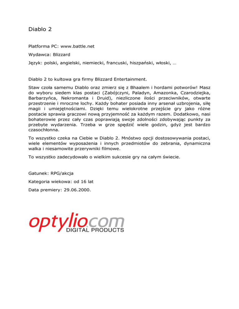 Diablo 2 Platforma PC: www.battle.net Wydawca: Blizzard Język: polski, angielski, niemiecki, francuski, hiszpański, włoski, … Diablo 2 to kultowa gra firmy Blizzard Entertainment. Staw czoła samemu Diablo oraz zmierz się z Bhaalem i hordami potworów! Masz do wyboru siedem klas postaci (Zabójczyni, Paladyn, Amazonka, Czarodziejka, Barbarzyńca, Nekromanta i Druid), niezliczone ilości przeciwników, otwarte przestrzenie i mroczne lochy. Każdy bohater posiada inny arsenał uzbrojenia, siłę magii i umiejętnościami. Dzięki temu wielokrotne przejście gry jako różne postacie sprawia graczowi nową przyjemność za każdym razem. Dodatkowo, nasi bohaterowie przez cały czas poprawiają swoje zdolności zdobywając punkty za przebyte wydarzenia. Trzeba w grze spędzić wiele godzin, gdyż jest bardzo czasochłonna. To wszystko czeka na Ciebie w Diablo 2. Mnóstwo opcji dostosowywania postaci, wiele elementów wyposażenia i innych przedmiotów do zebrania, dynamiczna walka i niesamowite przerywniki filmowe. To wszystko zadecydowało o wielkim sukcesie gry na całym świecie. Gatunek: RPG/akcja Kategoria wiekowa: od 16 lat Data premiery: 29.06.2000.