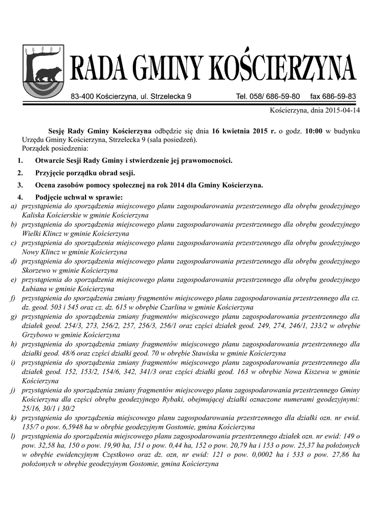 Kościerzyna, dnia 2015-04-14 Sesję Rady Gminy Kościerzyna odbędzie się dnia 16 kwietnia 2015 r. o godz. 10:00 w budynku Urzędu Gminy Kościerzyna, Strzelecka 9 (sala posiedzeń). Porządek posiedzenia: 1. Otwarcie Sesji Rady Gminy i stwierdzenie jej prawomocności. 2. Przyjęcie porządku obrad sesji. 3. Ocena zasobów pomocy społecznej na rok 2014 dla Gminy Kościerzyna. 4. Podjęcie uchwał w sprawie: a) przystąpienia do sporządzenia miejscowego planu zagospodarowania przestrzennego dla obrębu geodezyjnego Kaliska Kościerskie w gminie Kościerzyna b) przystąpienia do sporządzenia miejscowego planu zagospodarowania przestrzennego dla obrębu geodezyjnego Wielki Klincz w gminie Kościerzyna c) przystąpienia do sporządzenia miejscowego planu zagospodarowania przestrzennego dla obrębu geodezyjnego Nowy Klincz w gminie Kościerzyna d) przystąpienia do sporządzenia miejscowego planu zagospodarowania przestrzennego dla obrębu geodezyjnego Skorzewo w gminie Kościerzyna e) przystąpienia do sporządzenia miejscowego planu zagospodarowania przestrzennego dla obrębu geodezyjnego Łubiana w gminie Kościerzyna f) przystąpienia do sporządzenia zmiany fragmentów miejscowego planu zagospodarowania przestrzennego dla cz. dz. geod. 503 i 545 oraz cz. dz. 615 w obrębie Czarlina w gminie Kościerzyna g) przystąpienia do sporządzenia zmiany fragmentów miejscowego planu zagospodarowania przestrzennego dla działek geod. 254/3, 273, 256/2, 257, 256/3, 256/1 oraz części działek geod. 249, 274, 246/1, 233/2 w obrębie Grzybowo w gminie Kościerzyna h) przystąpienia do sporządzenia zmiany fragmentów miejscowego planu zagospodarowania przestrzennego dla działki geod. 48/6 oraz części działki geod. 70 w obrębie Stawiska w gminie Kościerzyna i) przystąpienia do sporządzenia zmiany fragmentów miejscowego planu zagospodarowania przestrzennego dla działek geod. 152, 153/2, 154/6, 342, 341/3 oraz części działki geod. 163 w obrębie Nowa Kiszewa w gminie Kościerzyna j) przystąpienia do sporządzenia zmiany fragmentów miejscowego planu zagospodarowania przestrzennego Gminy Kościerzyna dla części obrębu geodezyjnego Rybaki, obejmującej działki oznaczone numerami geodezyjnymi: 25/16, 30/1 i 30/2 k) przystąpienia do sporządzenia miejscowego planu zagospodarowania przestrzennego dla działki ozn. nr ewid. 135/7 o pow. 6,5948 ha w obrębie geodezyjnym Gostomie, gmina Kościerzyna l) przystąpienia do sporządzenia miejscowego planu zagospodarowania przestrzennego działek ozn. nr ewid: 149 o pow. 32,58 ha, 150 o pow. 19,90 ha, 151 o pow. 0,44 ha, 152 o pow. 20,79 ha i 153 o pow. 25,37 ha położonych w obrębie ewidencyjnym Częstkowo oraz dz. ozn, nr ewid: 121 o pow. 0,0002 ha i 533 o pow. 27,86 ha położonych w obrębie geodezyjnym Gostomie, gmina Kościerzyna m) przystąpienia do sporządzenia zmiany studium uwarunkowań i kierunków zagospodarowania przestrzennego Gminy Kościerzyna dla części obrębu ewidencyjnego Gostomie, obejmującej działkę oznaczoną numerem ewidencyjnym 141/5 i fragment działki oznaczonej numerem geodezyjnym 128; dla części obrębu ewidencyjnego Wieprznica, obejmującej działki oznaczone numerami geodezyjnymi 26/2, 28, 194/4, 195/2 i fragment działki oznaczonej numerem geodezyjnym 195/6 n) przystąpienia do sporządzenia zmiany fragmentów miejscowych planów zagospodarowania przestrzennego – fragmentu miejscowego planu zagospodarowania przestrzennego obrębu geodezyjnego Zielenin uchwalonego uchwałą Nr VI/337/06 z dnia 31 lipca 2006 roku Dz.Urz.Woj.Pom. Nr 119 Poz. 2473 – fragmentu miejscowego planu zagospodarowania przestrzennego obrębu geodezyjnego Mały Klincz uchwalonego uchwałą Nr VI/333/06 z dnia 30 czerwca 2006 roku Dz.Urz.Woj.Pom. Nr 93 Poz. 1945 o) przystąpienia do sporządzenia zmiany fragmentów miejscowych planów zagospodarowania przestrzennego – fragmentu miejscowego planu zagospodarowania przestrzennego obrębu geodezyjnego Wielki Klincz uchwalonego uchwałą Nr II/306/06 z dnia 27 marca 2006 roku Dz.Urz.Woj.Pom. Nr 63 Poz. 1313 – fragmentu miejscowego planu zagospodarowania przestrzennego obrębu geodezyjnego Nowy Podleś uchwalonego uchwałą Nr VII/345/06 z dnia 15 września 2006 roku Dz.Urz.Woj.Pom. Nr 41 Poz. 590 – fragmentu miejscowego planu zagospodarowania przestrzennego obrębu geodezyjnego Wielki Podleś uchwalonego uchwałą Nr IV/255/05z z dnia 29 lipca 2005 roku Dz.Urz.Woj.Pom. Nr 97 Poz. 2027 – fragmentu miejscowego planu zagospodarowania przestrzennego obrębu geodezyjnego Dębogóry uchwalonego uchwałą Nr VIII/56/07 z dnia 31 lipca 2007 roku Dz.Urz.Woj.Pom. Nr 152 Poz. 2852 p) wykazu kąpielisk położonych na terenie gminy Kościerzyna na rok 2015 q) wyrażenia zgody na odroczenie terminu płatności wierzytelności wobec Mazury PTTK sp. z o.o. z tytułu użytkowania wieczystego r) wyrażenia intencji w zakresie przebudowy drogi dojazdowej nr 19 i włączenia do drogi krajowej 20 Stargard Szczeciński – Gdynia w ramach inwestycji pn. „Budowa obwodnicy m.Kościerzyna w ciągu drogi krajowej nr 20 Stargard Szczeciński” s) podjęcia współpracy pomiędzy Gminą Kościerzyna a Gmina Pniewy t) przyjęcia planów pracy komisji stałych Rady Gminy Kościerzyna 5. Wolne wnioski. 6. Zakończenie posiedzenia. Przewodniczący Rady Gminy Andrzej Bober