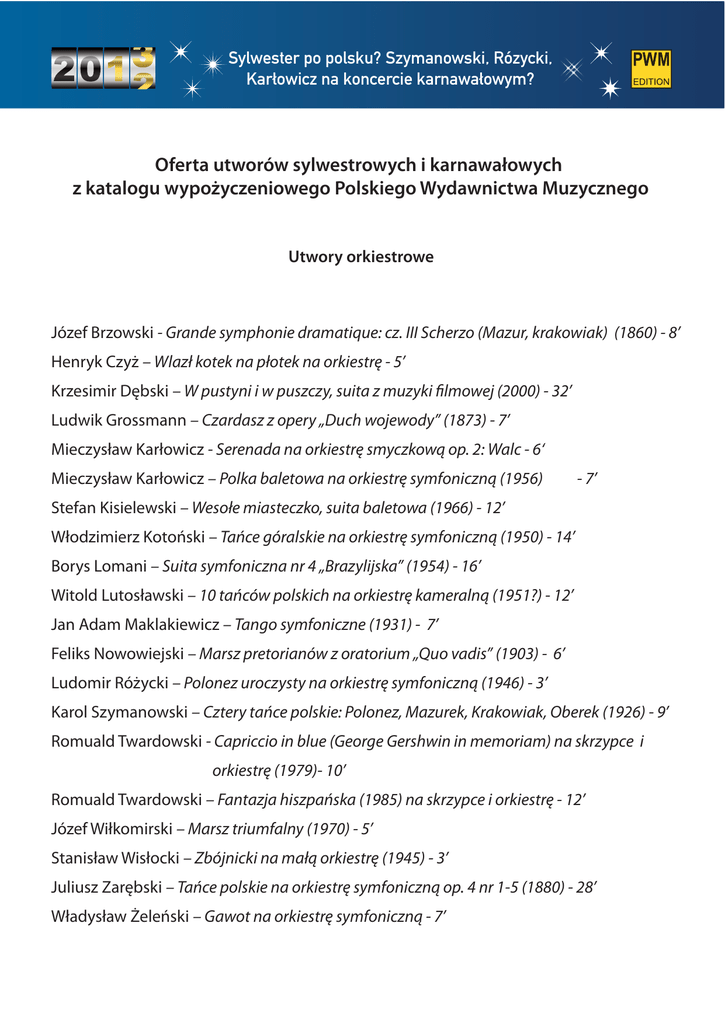 Sylwester po polsku? Szymanowski, Rózycki, Karłowicz na koncercie karnawałowym? Oferta utworów sylwestrowych i karnawałowych z katalogu wypożyczeniowego Polskiego Wydawnictwa Muzycznego Utwory orkiestrowe Józef Brzowski - Grande symphonie dramatique: cz. III Scherzo (Mazur, krakowiak) (1860) - 8’ Henryk Czyż – Wlazł kotek na płotek na orkiestrę - 5’ Krzesimir Dębski – W pustyni i w puszczy, suita z muzyki filmowej (2000) - 32’ Ludwik Grossmann – Czardasz z opery „Duch wojewody” (1873) - 7’ Mieczysław Karłowicz - Serenada na orkiestrę smyczkową op. 2: Walc - 6‘ Mieczysław Karłowicz – Polka baletowa na orkiestrę symfoniczną (1956) - 7’ Stefan Kisielewski – Wesołe miasteczko, suita baletowa (1966) - 12’ Włodzimierz Kotoński – Tańce góralskie na orkiestrę symfoniczną (1950) - 14’ Borys Lomani – Suita symfoniczna nr 4 „Brazylijska” (1954) - 16’ Witold Lutosławski – 10 tańców polskich na orkiestrę kameralną (1951?) - 12’ Jan Adam Maklakiewicz – Tango symfoniczne (1931) - 7’ Feliks Nowowiejski – Marsz pretorianów z oratorium „Quo vadis” (1903) - 6’ Ludomir Różycki – Polonez uroczysty na orkiestrę symfoniczną (1946) - 3’ Karol Szymanowski – Cztery tańce polskie: Polonez, Mazurek, Krakowiak, Oberek (1926) - 9’ Romuald Twardowski - Capriccio in blue (George Gershwin in memoriam) na skrzypce i orkiestrę (1979)- 10’ Romuald Twardowski – Fantazja hiszpańska (1985) na skrzypce i orkiestrę - 12’ Józef Wiłkomirski – Marsz triumfalny (1970) - 5’ Stanisław Wisłocki – Zbójnicki na małą orkiestrę (1945) - 3’ Juliusz Zarębski – Tańce polskie na orkiestrę symfoniczną op. 4 nr 1-5 (1880) - 28’ Władysław Żeleński – Gawot na orkiestrę symfoniczną - 7’ Poznaj lżejsze oblicze naszych Mistrzów w ofercie Biblioteki Materiałów Orkiestrowych! Oferta utworów sylwestrowych i karnawałowych z katalogu wypożyczeniowego Polskiego Wydawnictwa Muzycznego Arie operowe i operetkowe Stanisław Moniuszko – Hrabina, aria Hrabiny z II aktu „Suknio, coś mnie tak zdobiła (1860) Feliks Nowowiejski – Legenda Bałtyku, aria Domana z II aktu „Więc ty mnie kochasz” (1924) Ludomir Różycki – Casanova, walc Caton z III aktu „To dawny mój znajomy” (1923) Ludomir Różycki – Eros i Psyche, aria Psyche z aktu I „Tak śni mi się czasem, żem jest zrodzona” (1916) Ludomir Różycki – Młyn diabelski, pieśń „Rajski ptak” (1931) Ludomir Różycki – Pani Walewska, scena na balu: „Pełen rozkoszy i blasku ten świat” (1940) Roman Statkowski – Maria, aria Marii z II aktu „Znowu cię ujrzę, skarbie mej duszy” (1904) Jan Stefani – Cud mniemany, czyli Krakowiacy i górale, duet Basi i Stacha „Raz na pniu między dębami” (1794) Tadeusz Szeligowski – Krakatuk, aria Hani „Jakże ja lubię tę ciszę” (1954) Karol Szymanowski – Loteria na mężów, duet Sary i Darlaya z III aktu „Od czasu gdym cię ujrzał raz” (1909) Karol Szymanowski – Loteria na mężów, kuplety Miss Huck z II aktu „Kiedym była bardzo młoda” (1909) Karol Szymanowski – Loteria na mężów, kuplety Williamsa z II aktu „Jedna pani męża miała” (1909) Karol Szymanowski – Loteria na mężów, romans Sary z I aktu „Rozkazać sercu próżny trud” (1909) Karol Szymanowski – Loteria na mężów, duet Charliego i Darlaya z I aktu „Drogi bracie przyszedł straszny czas” (1909) Karol Szymanowski – Loteria na mężów, aria Tobiasza „Moda różne ma zwyczaje” (1909) Karol Szymanowski – Loteria na mężów, ballada indiańska (Charlie) (1909) Karol Szymanowski – Loteria na mężów, tercet Ewy, Caroline i Sary „Narzeczoną zostać to jest trudno dziś” (1909) Władysław Żeleński – Goplana, walc z I aktu „Ach, w leśnej ustroni” (1896) Władysław Żeleński – Goplana, duet miłosny Kostryna i Balladyny z III aktu opery „O, droga przed nami raj” Władysław Żeleński – Janek, dumka Janka z I aktu „Gdy ślub weźmiesz z twoim Stachem” Władysław Żeleński – Konrad Wallenrod, aria Aldony z IV aktu „Któż me westchnienia?”