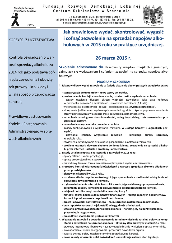 KORZYŚCI Z UCZESTNICTWA: Jak prawidłowo wydać, skontrolować, wygasić i cofnąć zezwolenie na sprzedaż napojów alkoholowych w 2015 roku w praktyce urzędniczej. Kontrola oświadczeń o war- 26 marca 2015 r. tości sprzedaży alkoholu za Szkolenie adresowane do: Pracownicy urzędów miejskich i gminnych, 2014 rok jako podstawa cof- zajmujący się wydawaniem i cofaniem zezwoleń na sprzedaż napojów alkonięcia zezwolenia i obowiązek prawny - kto, kiedy i w jaki sposób przeprowadza kontrolę. Prawidłowe zastosowanie Kodeksu Postępowania Administracyjnego w sprawach alkoholowych holowych. PROGRAM SZKOLENIA: 1. Jak prawidłowo wydać zezwolenie w świetle aktualnie obowiązujących przepisów prawa : - standaryzacja dokumentów – nowe wzory wniosków, - postanowienie komisji - termin wydania, ostateczność a wydanie zezwolenia. - zasady ustalania długości okresu ważności zezwolenia- jaka data końcowa w przypadku zezwoleń z minimalnym ustawowym terminem (2,4 lata) . - wykonalność a ostateczność decyzji - problem pojęcia „wydania zezwolenia”, - doręczanie (odbieranie) wydawanych zezwoleń zgodnie z kpa – poprawne określenie strony postępowania w aspekcie treści zezwolenia, pełnomocnictwa. - zezwolenia cateringowe - termin ważności, zasięg terytorialny, treść zezwolenia - projekt zmian ustawy, - zezwolenia na wyprzedaż – procedura i opłaty, - zasady funkcjonowania i wydawanie zezwoleń w „sklepo-barach” i „ogródkach piwnych”, - uchylanie, zmiana, wygaszanie zezwoleń - likwidacja punktu sprzedaży w trakcie roku. - zawieszenie wykonywania działalności gospodarczej a opłata za zezwolenie. - problem legalności dowozu alkoholu do domu klienta, zezwolenia na sprzedaż alkoholu przez internet – aktualne problemy i orzecznictwo, 2. Zasady ustalania opłat za korzystanie z zezwoleń w 2015 roku: - opłaty ratalne – komu przysługują, - opłaty proporcjonalne za zezwolenia, - prawidłowy termin i forma wniesienia opłaty przed wydaniem zezwolenia . 3. Procedura kontroli wiarygodności oświadczeń o wartości sprzedaży alkoholu składanych przez przedsiębiorców: - planowanie kontroli w 2015 roku, - ustalenie składu zespołu kontrolnego i jego uprawnienia - możliwości odstąpienia od obowiązku zawiadomienia o kontroli, - tryb zawiadomienia o terminie kontroli i sposób jej prawidłowego przeprowadzenia, - dokumenty zespołu kontrolnego upoważniające do przeprowadzenia kontroli, - miejsce kontroli – urząd czy siedziba przedsiębiorcy ? - metody i zakres badania dokumentów finansowych - rodzaje żądanych dokumentów, forma ich przekazywania zespołowi kontrolnemu, - prawa i obowiązki kontrolowanego – m.in. sprzeciw, zastrzeżenia do protokołu, - brak raportów kasowych – jak ustalić wiarygodność oświadczeń, - ustalanie prawidłowości faktur zakupu alkoholu – na firmę czy na punkt sprzedaży, przesunięcia magazynowe, - prawidłowe sporządzanie protokołu z kontroli, 4. Wygaszanie zezwoleń z powodu naruszenia terminu wniesienia ratalnej opłaty za korzystanie z zezwolenia na sprzedaż alkoholu – aktualny stan prawny w marcu 2015 roku: - przelewy internetowe i bankowe – zasady uwzględniania wniesienia opłaty w terminie, - zawiadamianie strony postępowania i procedura dowodowa organu, - kwestia zwrotu opłat, ustalanie terminu początkowego karencji. - nowe zasady wnoszenia opłat i oświadczeń - nowelizacja ustawy, stan legislacji. 5. Prawidłowe zastosowanie Kodeksu Postępowania Administracyjnego przy wydawaniu, cofaniu, zmianie i wygaszaniu zezwoleń na sprzedaż napojów. Porady prawne i praktyczne - jak uniknąć uchylenia decyzji przez organ odwoławczy. Prowadzący: etatowy członek Samorządowego Kolegium Odwoławczego, przewodnicząca składów orzekających organu II instancji w sprawach odwoławczych, szczególnie z zakresu ustawy o wychowaniu w trzeźwości i przeciwdziałaniu alkoholizmowi, transportu drogowego, pomocy społecznej, świadczeń rodzinnych Miejsce: Szczecin, Centrum Szkoleniowe FDL, ul. M. Skłodowskiej-Curie 4 Termin i godzina: 26 marca 2015, godz. 10.00-15.00 Cena: 320 zł netto/os. przy zgłoszeniu do 12 marca 2015 350 zł netto/os. przy zgłoszeniu po 12 marca 2015 Zwolnione z VAT w przypadku szkolenia zawodowego, finansowanego ze środków publicznych. Cena zawiera materiały szkoleniowe, zaświadczenie o ukończeniu szkolenia, lunch i serwis kawowy. RABAT 10% dla każdej kolejnej osoby zgłoszonej z tej samej instytucji. Zgłoszenia: należy dokonywać najpóźniej do 19 marca 2015 r, elektronicznie ze strony (www.frdl.szczecin.pl, faksem (091 4878522) bądź listownie.