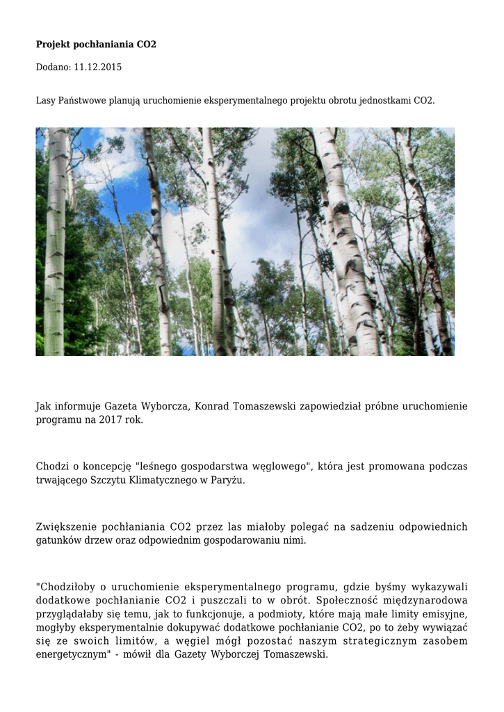 Projekt pochłaniania CO2 Dodano: 11.12.2015 Lasy Państwowe planują uruchomienie eksperymentalnego projektu obrotu jednostkami CO2. Jak informuje Gazeta Wyborcza, Konrad Tomaszewski zapowiedział próbne uruchomienie programu na 2017 rok. Chodzi o koncepcję "leśnego gospodarstwa węglowego", która jest promowana podczas trwającego Szczytu Klimatycznego w Paryżu. Zwiększenie pochłaniania CO2 przez las miałoby polegać na sadzeniu odpowiednich gatunków drzew oraz odpowiednim gospodarowaniu nimi. "Chodziłoby o uruchomienie eksperymentalnego programu, gdzie byśmy wykazywali dodatkowe pochłanianie CO2 i puszczali to w obrót. Społeczność międzynarodowa przyglądałaby się temu, jak to funkcjonuje, a podmioty, które mają małe limity emisyjne, mogłyby eksperymentalnie dokupywać dodatkowe pochłanianie CO2, po to żeby wywiązać się ze swoich limitów, a węgiel mógł pozostać naszym strategicznym zasobem energetycznym" - mówił dla Gazety Wyborczej Tomaszewski. Jak to się ma do gospodarki? Podmioty objęte systemem ETS (Europejski System Handlu Emisjami) mogłyby kupować od Lasów jednostki dwutlenku węgla pochłanianego przez leśne gospodarstwa węglowe. Tomaszewski zaznaczył też, że nie ma alternatywy dla polskiej energetyki. Konieczne jest wykorzystanie paliw kopalnych. Nie zmienia to faktu, że obowiązkiem Polski jest doprowadzenie do zmiany w technologii spalania węgla brunatnego i kamiennego, a co za tym idzie - zmniejszenia emisji CO2 do atmosfery. Wracając do gospodarstw węglowych - ciekawe, jak będą wyglądały prace w takim pochłaniającym węgiel lesie? Komentarze (0) Nie dodano jeszcze żadnego komentarza.