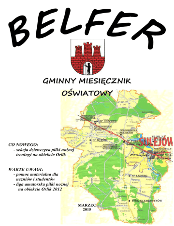 GMINNY MIESIĘCZNIK OŚWIATOWY CO NOWEGO: - sekcja dziewczęca piłki nożnej treningi na obiekcie Orlik ZSP Sulejów• WARTE UWAGI: - pomoc materialna dla uczniów i studentów - liga amatorska piłki nożnej na obiekcie Orlik 2012 MARZEC 2015 SPIS TREŚCI I. Informacje gminne .......................................................................................................... 3 1. Edukacja w Gminie Sulejów .................................................................................... 4 2. Biuro Obsługi Jednostek Oświatowych w Sulejowie .............................................. 8 II. Wiadomości z placówek oświatowych ........................................................................... 13 1. Szkoła Podstawowa Nr 1 im. Jana Pawła II w Sulejowie ....................................... 14 2. Szkoła Podstawowa Nr 2 im. Królowej Jadwigi w Sulejowie ................................ 25 3. Szkoła Podstawowa w Łęcznie ................................................................................ 31 4. Szkoła Podstawowa w Przygłowie .......................................................................... 41 5. Szkoła Podstawowa w Uszczynie ............................................................................ 50 6. Szkoła Podstawowa im. Jana Pawła II w Witowie .................................................. 55 7. Gimnazjum w Sulejowie .......................................................................................... 58 8. Gimnazjum w Przygłowie ........................................................................................ 63 9. Samorządowe Przedszkole w Sulejowie .................................................................. 66 10. Samorządowe Przedszkole w Przygłowie ............................................................... 68 11. Samorządowe Przedszkole w Poniatowie ................................................................ 70 12. Szkoła Podstawowa SPSK w Klementynowie ........................................................ 71 13. Niepubliczne Przedszkole "Uśmiech Dziecka" we Włodzimierzowie .................... 74 14. Niepubliczne Przedszkole "Zielony Zakątek" w Poniatowie .................................. 76 15. Zespół Szkół Ponadgimnazjalnych w Sulejowie ..................................................... 77 III. Historie szkół .................................................................................................................. 79 1. Historia SP Nr 2 w Sulejowie (cz. II) ...................................................................... 80 IV. Przyjemne z pożytecznym .............................................................................................. 82 1. Przydatne linki ......................................................................................................... 83 2. Ogłoszenie ................................................................................................................ 84 3. Informacja ................................................................................................................. 84 2 3 Gmina Sulejów - Urząd Miejski w Sulejowie 97-330 Sulejów, ul. Konecka 42 tel. 44 61-02-501, fax. 44 61-62-551 e-mail: [email protected], www.sulejow.pl „Wychowanie przedszkolne na terenie Gminy Sulejów” Zgodnie ze Strategicznym Planem Rządzenia oraz Programem Prac Rządu, priorytetem w obszarze edukacji jest zwiększenie dostępności do edukacji wysokiej jakości, poprzez m. in. upowszechnienie wychowania przedszkolnego dla dzieci w wieku 3 – 5 lat, w tym obowiązek rocznego przygotowania przedszkolnego dla dzieci 5-letnich. Obowiązek ten wchodzi w życie od 01.09.2015 roku. Dzieci sześcioletnie idą do klas I szkół podstawowych. Obecnie na terenie gminy Sulejów funkcjonują trzy przedszkola publiczne oraz dwa niepubliczne. Ponadto przy szkołach podstawowych funkcjonują oddziały przedszkolne – łącznie 9 oddziałów, z czego jeden oddział przy niepublicznej szkole podstawowej w Klementynowie. Zgodnie z wykazem bazy danych Systemy Informacji Oświatowych (tzw. SIO) na dzień 30.09.2014 roku do przedstawionych powyżej placówek i oddziałów zerowych uczęszcza łącznie 487 dzieci (321 dzieci w przedszkolach i 166 dzieci w oddziałach zerowych). Jeżeli liczba dzieci w placówkach publicznych pozostaje bez zmian to w przekroju ostatnich miesięcy liczba dzieci przedszkolnych w placówkach niepublicznych comiesięcznie wzrasta (przedszkole niepubliczne we Włodzimierzowie: wrzesień 2014 roku – 67 dzieci, marzec 2015 – 75 dzieci; przedszkole niepubliczne w Poniatowie: wrzesień 2014 roku – 32, dzieci, marzec 2015 – 40 dzieci). Obecnie trwa proces rekrutacji do przedszkoli i oddziałów przedszkolnych przy szkołach podstawowych. Jej rezultaty będą miały bardzo duże znaczenie przy tworzeniu arkuszy organizacyjnych placówek publicznych na przyszły rok szkolny 2015/2016. Finansowanie oświaty w części „wychowanie przedszkolne” Generalnie do niedawna prowadzenie przedszkoli i oddziałów przedszkolnych przy szkołach podstawowych było zadaniem własnym gminy, którego koszty ponoszono w 100 % z środków własnych. Od 2013 roku (od września) państwo uruchomiło tzw. dotację przedszkolną, która pierwotnie objęła dzieci w wieku od 2,5 roku do 6-latków włącznie (tylko z oddziałów przedszkolnych) a docelowo dotyczyć będzie dzieci w wieku 2,5-5 lat. Roczna dotacja na jedno dziecko w 2014 roku wynosiła 1.207,97 zł (planowana na 2015 rok wynosi 1.273,00 zł). Dotacja dotyczy jedynie dzieci ujętych w spisie SIO na dzień 30 września roku poprzedniego (brak dotacji na dzieci przyjęte po terminie spisu). Prócz dotacji gmina uzyskuje dochody w postaci wpłat rodziców za obiady oraz z tytułu tzw. „czesnego”. Wydatki na wychowanie przedszkolne można podzielić na wydatki związane z funkcjonowaniem placówek publicznych i niepublicznych. Placówki publiczne W roku 2014 g
