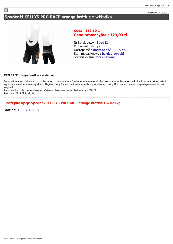Informacje o produkcie Utworzono 04-03-2017 Spodenki KELLYS PRO RACE orange krótkie z wkładką Cena : 169,90 zł Cena promocyjna : 129,00 zł Nr katalogowy : Spod41 Producent : Kellys Dostępność : Dostępność - 3 - 5 dni Stan magazynowy : bardzo wysoki Średnia ocena : brak recenzji PRO RACE orange krótkie z wkładką Spodenki kolarskie wykonane są z poliamidowych mikrowłókien Carvico w połączeniu z elastycznym włóknem Lycra. W spodenkach użyto antybakteryjnej ergonomicznie ukształtowanej wkładki Hygienic firmy Eschler, perforowane szelki z przewiewnej tkaniny Miti oraz silikonowe antypoślizgowe zakończenia nogawek. Na spodenkach dla poprawy bezpieczeństwa umieszczone jest odblaskowe logo KELLYS. Rozmiary: XS, S, M, L, XL, XXL Dostępne opcje Spodenki KELLYS PRO RACE orange krótkie z wkładką odziez: XS, S, M, L, XL, XXL. Wygenerowano w programie www.oscGold.com