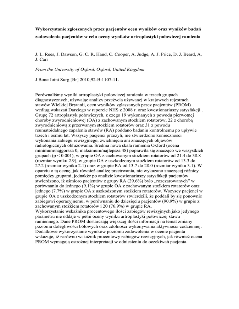 Wykorzystanie zgłoszonych przez pacjentów ocen wyników oraz wyników badań zadowolenia pacjentów w celu oceny wyników artroplastyki połowiczej ramienia J. L. Rees, J. Dawson, G. C. R. Hand, C. Cooper, A. Judge, A. J. Price, D. J. Beard, A. J. Carr From the University of Oxford, Oxford, United Kingdom J Bone Joint Surg [Br] 2010;92-B:1107-11. Porównaliśmy wyniki artroplastyki połowiczej ramienia w trzech grupach diagnostycznych, używając analizy przeżycia używanej w krajowych rejestrach stawów Wielkiej Brytanii, ocen wyników zgłaszanych przez pacjentów (PROM) według wskazań Darziego w raporcie NHS z 2008 r. oraz kwestionariuszy satysfakcji . Grupę 72 artroplastyk połowiczych, z czego 19 wykonanych z powodu pierwotnej choroby zwyrodnieniowej (OA) z zachowanym stożkiem rotatorów, 22 z chorobą zwyrodnieniową z przerwanym stożkiem rotatorów oraz 31 z powodu reumatoidalnego zapalenia stawów (RA) poddano badaniu kontrolnemu po upływie trzech i ośmiu lat. Wszyscy pacjenci przeżyli, nie stwierdzono konieczności wykonania zabiegu rewizyjnego, zwichnięcia ani znaczących objawów radiologicznych obluzowania. Średnia nowa skala ramienia Oxford (ocena minimum/najgorsza 0, maksimum/najlepsza 48) poprawiła się znacząco we wszystkich grupach (p < 0.001), w grupie OA z zachowanym stożkiem rotatorów od 21.4 do 38.8 (rozmiar wyniku 2.9), w grupie OA z uszkodzonym stożkiem rotatorów od 13.3 do 27.2 (rozmiar wyniku 2.1) oraz w grupie RA od 13.7 do 28.0 (rozmiar wyniku 3.1). W oparciu o tą ocenę, jak również analizę przetrwania, nie wykazano znaczącej różnicy pomiędzy grupami, jednakże po analizie kwestionariuszy satysfakcji pacjentów stwierdzono, iż ośmioro pacjentów z grupy RA (29.6%) było „rozczarowanych” w porównaniu do jednego (9.1%) w grupie OA z zachowanym stożkiem rotatorów oraz jednego (7.7%) w grupie OA z uszkodzonym stożkiem rotatorów. Wszyscy pacjenci w grupie OA z uszkodzonym stożkiem rotatorów stwierdzili, że poddali by się ponownie zabiegowi operacyjnemu, w porównaniu do dziesięciu pacjentów (90.9%) w grupie z zachowanym stożkiem rotatorów i 20 (76.9%) w grupie RA. Wykorzystanie wskaźnika procentowego ilości zabiegów rewizyjnych jako jedynego parametru nie oddaje w pełni oceny wyniku artroplastyki połowiczej stawu ramiennego. Dane PROM dostarczają większej ilości informacji na temat zmiany poziomu dolegliwości bólowych oraz zdolności wykonywania aktywności codziennej. Dodatkowe wykorzystanie wyników poziomu zadowolenia w ocenie pacjenta wskazuje, iż zarówno wskaźnik procentowy zabiegów rewizyjnych, jak również ocena PROM wymagają ostrożnej interpretacji w odniesieniu do oczekiwań pacjenta.