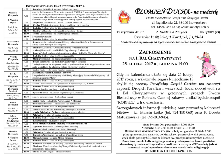 INTENCJE MSZALNE: 15-22 STYCZNIA 2017 R. 8.00 18.00 8.00 8.00 † Bogusław Siwiński – 3. rocznica śmierci – od siostry Msza św. Jubileuszowa w 20. rocznicę powstania SWPK A.G. w naszej parafii - o życie wieczne dla zmarłych członków Stowarzyszenia i o szczególne Boże błogosławieństwo dla żyjących oraz o Boże błogosławieństwo i zdrowie dla Pana Józefa Brzostka, wieloletniego przewodniczącego SWPK w naszej parafii, z okazji jego 90. rocznicy urodzin † Magdalena Polewska – od Urszuli i Henryka Polewskich † Czesław Jóźwiak – 4. rocznica śmierci – od żony i córki z mężem † Ludwika Źródło – Msza św. Gregoriańska (14) † Stanisława Rucińska – od wnuka Roberta z żoną i dziećmi † Teresa Lewandowska – od syna Grzegorza z rodziną O pojednanie w rodzinie † Ludwika Źródło – Msza św. Gregoriańska (15) † Irena Jaworska – od Aleksandry, Elżbiety i Mirosława Kaletów z Torunia oraz od Elżbiety i Jana Borowych z Niemojewka † Stanisław Koralewski – 20. rocznica śmierci – od chrześniaczki † Andrzej Moszczyński – od Zakładu Pogrzebowego P. Matuszak † Danuta Ciabach – od zarządu i współpracowników z Zakładów Mięsnych „Viando” † Ludwika Źródło – Msza św. Gregoriańska (16) † Stanisław Bogumił – od Zakładu Pogrzebowego P. Matuszak † Leszek Baranowski – od Zakładu Pogrzebowego P. Matuszak Z podziękowaniem za otrzymane łaski i z prośba o dalsze Boże błogosławieństwo oraz opiekę Matki Bożej dla Marianny z okazji 89. rocznicy urodziny † Janina Raubo – od wnuczki Karoliny z rodziną Za zmarłych z rodzin: Kapustka i Bawołów O błogosławieństwo Boże i opiekę Matki Bożej Nieustającej Pomocy dla Władysławy - od Czesława z rodziną z Mazur † Ludwika Źródło – Msza św. Gregoriańska (17) † Teresa Lewandowska – od sąsiadów z ul. Krzywoustego 33a, IV klatka † Ludwika Źródło – Msza św. Gregoriańska (18) † Henryk Suwalski – od żony, † Andrzej Petrzak 8.00 † Ryszard Semrau – od Zakładu Pogrzebowego P. Matuszak 18.00 Msza św. zarezerwowana – brak podanej intencji 8.00 8.00 8.00 8.00 18.00 8.00 8.00 8.00 8.00 18.00 8.00 9.30 9.30 11.00 11.00 12.30 † Janina Raubo – od Zakładu Pogrzebowego P. Matuszak † Franciszek Brzeziński – od sąsiadów z ul. Łokietka 39 † Ludwika Źródło – Msza św. Gregoriańska (19) † Jolenta Strzelecka – od Zakładu Pogrzebowego P. Matuszak † Aniela, Władysław i Zdzisław Jasiukiewiczowie – od dzieci † Władysław Cebula – od rodziny Jarugów † Ludwika Źródło – Msza św. Gregoriańska (20) † Róża Marciniak – 11. rocznica śmierci † Erna, Franciszek i zmarli z rodziny Wieczorkowskich i Jess † Agnieszka Straszewska – od mamy i brata z rodziną † Danuta Ciabach – od koleżanki Izabeli Nowaczyk † Władysław Cebula – od syna Andrzeja z rodziną † Kazimiera Wesołowska – od rodziny Walczaków i Szych † Stefan Zaćmiński – od córki Moniki z rodziną † Ludwika Źródło – Msza św. Gregoriańska (21) † Genowefa Plucińska – od bratowej Czesławy Czajkowskiej z rodziną z Lichenia † Marianna Wieteska – od rodziny Wandy i Wiesława Rychlewskich z dziećmi wraz z przyjaciółkami Basią i Jadzią † Michał i Anna Giergiel – od rodziny Małek 8.00 Niedziela 15 stycznia 2. Niedziela Zwykła Iz 49,3.5-6; 1 Kor 1,1-3; J 1,29-34 Poniedziałek 16 stycznia Hbr 5,1-10; Mk 2,18-22 Wtorek 17 stycznia Św. Antoniego Hbr 6,10-20; Mk 2,23-28 Środa 18 stycznia Hbr 7,1-3.15-17; Mk 3,1-6 Czwartek 19 stycznia Św. Józefa Sebastiana Pelczara Hbr 7,25-8,6; Mk 3,7-12 Piątek 20 stycznia Hbr 8,6-13; Mk 3,13-19 Sobota 21 stycznia Św. Agnieszki Hbr 9,1-3.11-14; Mk 3,20-21 Niedziela 22 stycznia 3. Niedziela Zwykła Iz 8,23b-9,3; 1 Kor 1,10-13.17; Mt 4,12-23 9.30 9.30 11.00 11.00 12.30 16.00 18.00 8.00 8.00 8.00 8.00 18.00 8.00 8.00 8.00 8.00 18.00 8.00 8.00 16.00 18.00 PŁOMIEŃ DUCHA - na niedzielę Pismo wewnętrzne Parafii p.w. Świętego Ducha ul. Jagiellońska 22, 88-100 Inowrocław; tel. +48 52 357 45 34; www.swietyduch.pl 15 stycznia 2017 r. 2. Niedziela Zwykła Nr 3/2017 (73) Czytania: Iz 49,3.5-6; 1 Kor 1,1-3; J 1,29-34 Serdecznie dziękujemy za życzliwość i wszelkie okazywane dobro! ZAPROSZENIE NA I. BAL CHARYTATYWNY! 25. LUTEGO 2017 R., GODZINA 19.00 Gdy na kalendarzu ukaże się data 25 lutego 2017 roku, a wskazówki zegara ku godzinie 19 chylić się zaczną, Parafialny Zespół Caritas ma zaszczyt zaprosić Drogich Parafian i wszystkich ludzi dobrej woli na I. Bal Charytatywny w gościnnych progach Dworu Biesiadnego w Rojewie. Czas tej zabawy umilać będzie zespół "KORNEL" z Inowrocławia. Szczegółowych informacji udzielają oraz prowadzą kolportaż biletów - ks. Marcin Łojko (tel. 724-150-060) oraz P. Dorota Matuszewska (tel. 695-203-945). MSZE ŚWIĘTE: Dni powszednie: 8.00 i 18.00. Niedziele: 8.00; 9.30; 11.00; 12.30; 16.00; 18.00. BIURO PARAFIALNE DO KOŃCA KOLĘDY: soboty od godziny 11.00 do 12.00; pilne sprawy można załatwiać po Mszach św. porannych w dni powszednie, czyli około godziny 8.30 oraz po Mszach św. przedpołudniowych w niedzielę. Darowizny na cele kultu religijnego można przekazywać na konto parafialne (darowiznę tę można odliczyć sobie w rozliczeniu rocznym - PIT – należy jednak zaznaczyć w tytule przelewu: darowizna na cele kultu religijnego): 05 1240 1196 1111 0010 6494 1416 PLAN KOLĘDY OD 15 DO 24 STYCZNIA 15.01.2017 R. NIEDZIELA – WSZYSCY OD GODZINY 15.00 1. ul. Hermana, ul. Dąbrówki, ul. Trzcińskiego 22 - ks. Proboszcz 2. ul. Kątna 20 a i b - ks. M. Przybylski 3. ul. Kątna 20 c i d - ks. M. Łojko 16.01.2017 R. PONIEDZIAŁEK 1. ul. Łokietka 15 – od nr 1 do 40 - od godz. 16.00 - ks. M. Łojko 2. ul. Łokietka 15 – od nr 41 do 80 - od godz. 15.30 - ks. M. Przybylski 3. ul. Łokietka 15 – od nr 81 do 115 - od godz. 14.00 - ks. M. Hinz 4. ul. Łokietka 4 – od nr 1 do 40 - od godz. 14.00