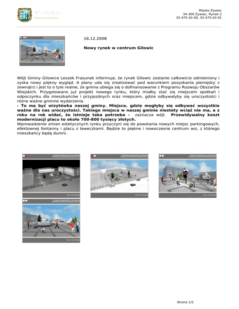 Miasto Żywiec 34-300 Żywiec, Rynek 2 33-475-42-00, 33-475-42-01 16.12.2008 Nowy rynek w centrum Gilowic Wójt Gminy Gilowice Leszek Frasunek informuje, że rynek Gilowic zostanie całkowicie odmieniony i zyska nowy piękny wygląd. A plany uda się zrealizować pod warunkiem pozyskania pieniędzy z zewnątrz i jest to o tyle realne, że gmina ubiega się o dofinansowanie z Programu Rozwoju Obszarów Wiejskich. Przygotowano już projekt nowego rynku, który miałby stać się miejscem spotkań i odpoczynku dla mieszkańców i przyjezdnych oraz miejscem, gdzie odbywałyby się uroczystości i różne ważne gminne wydarzenia. - To ma być wizytówka naszej gminy. Miejsce, gdzie mogłyby się odbywać wszystkie ważne dla nas uroczystości. Takiego miejsca w naszej gminie niestety wciąż nie ma, a z roku na rok widać, że istnieje taka potrzeba – zaznacza wójt. Przewidywalny koszt modernizacji placu to około 700-800 tysięcy złotych. Wprowadzenie zmian estetycznych rynku przyczyni się do powstania nowych miejsc parkingowych, efektownej fontanny i placu z ławeczkami. Będzie to piękne i nowoczesne centrum wsi, z którego mieszkańcy będą dumni. Strona 1/1 Powered by TCPDF (www.tcpdf.org)