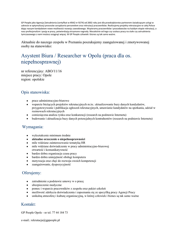 GP People jako Agencja Zatrudnienia (certyfikat w KRAZ nr 9274) od 2002 roku jest dla przedsiębiorstw partnerem świadczącym usługi w zakresie w optymalizacji procesów zarządzania personelem oraz rekrutacji pracowników. Realizujemy projekty rekrutacyjne w całej Polsce dając naszym kandydatom nowe możliwości rozwoju zawodowego. Wspieramy pracowników i pracodawców na każdym etapie rekrutacji, a nasz profesjonalizm i pasję w pracy, potwierdzają otrzymane nagrody. Niezależnie od tego czy szukasz pracy na stałe czy zatrudnienia tymczasowego z nami możesz osiągnąć więcej. W GP People człowiek i biznes są tak samo ważne. Aktualnie do naszego zespołu w Poznaniu poszukujemy zaangażowanej i zmotywowanej osoby na stanowisko: Asystent Biura / Researcher w Opolu (praca dla os. niepełnosprawnej) nr referencyjny: ABO/11/16 miejsce pracy: Opole region: opolskie Opis stanowiska: prace administracyjno-biurowe wsparcie bieżących projektów rekrutacyjnych m.in.: aktualizowanie bazy danych kandydatów, przygotowywanie i publikacja ogłoszeń rekrutacyjnych, umawianie kandydatów na spotkania, udział w rozmowach rekrutacyjnych comiesięczna analiza rynku oraz konkurencji (research na podstawie Internetu) budowanie i aktualizacja bazy danych potencjalnych kontrahentów (research na podstawie Internetu) Wymagania: wykształcenie minimum średnie aktualne orzeczenie o niepełnosprawności mile widziane zainteresowanie tematyką HR mile widziane doświadczenie w pracy administracyjno-biurowej otwartość i komunikatywność bardzo dobra organizacja czasu pracy bardzo dobra umiejętność obsługi komputera motywacja oraz chęć do rozwoju swoich kompetencji zaangażowanie, dyspozycyjność Oferujemy: zatrudnienie a podstawie umowy w o pracę ubezpieczenie medyczne pomoc i wsparcie pracowników z zespołu oraz pakiet szkoleń możliwość zdobycia doświadczenia i zapoznania się ze specyfiką pracy Agencji Pracy unikalną atmosferę i kulturę organizacyjną, w której człowiek i biznes są tak samo ważne Kontakt: GP People Opole - nr tel. 77 44 184 73 e-mail.: [email protected]