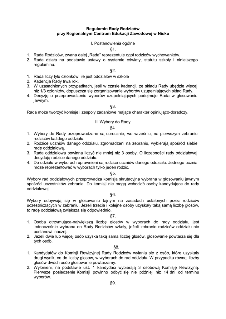 Regulamin Rady Rodziców przy Regionalnym Centrum Edukacji Zawodowej w Nisku I. Postanowienia ogólne §1. 1. Rada Rodziców, zwana dalej „Radą” reprezentuje ogół rodziców wychowanków. 2. Rada działa na podstawie ustawy o systemie oświaty, statutu szkoły i niniejszego regulaminu. §2. 1. Rada liczy tylu członków, ile jest oddziałów w szkole 2. Kadencja Rady trwa rok. 3. W uzasadnionych przypadkach, jeśli w czasie kadencji, ze składu Rady ubędzie więcej niż 1/3 członków, dopuszcza się zorganizowanie wyborów uzupełniających skład Rady. 4. Decyzję o przeprowadzeniu wyborów uzupełniających podejmuje Rada w głosowaniu jawnym. §3. Rada może tworzyć komisje i zespoły zadaniowe mające charakter opiniująco-doradczy. II. Wybory do Rady §4. 1. Wybory do Rady przeprowadzane są corocznie, we wrześniu, na pierwszym zebraniu rodziców każdego oddziału. 2. Rodzice uczniów danego oddziału, zgromadzeni na zebraniu, wybierają spośród siebie radę oddziałową. 3. Rada oddziałowa powinna liczyć nie mniej niż 3 osoby. O liczebności rady oddziałowej decydują rodzice danego oddziału. 4. Do udziału w wyborach uprawnieni są rodzice uczniów danego oddziału. Jednego ucznia może reprezentować w wyborach tylko jeden rodzic. §5. Wybory rad oddziałowych przeprowadza komisja skrutacyjna wybrana w głosowaniu jawnym spośród uczestników zebrania. Do komisji nie mogą wchodzić osoby kandydujące do rady oddziałowej. §6. Wybory odbywają się w głosowaniu tajnym na zasadach ustalonych przez rodziców uczestniczących w zebraniu. Jeżeli trzecia i kolejne osoby uzyskały taką samą liczbę głosów, to radę oddziałową zwiększa się odpowiednio. §7. 1. Osoba otrzymująca-największą liczbę głosów w wyborach do rady oddziału, jest jednocześnie wybrana do Rady Rodziców szkoły, jeżeli zebranie rodziców oddziału nie postanowi inaczej. 2. Jeżeli dwie lub więcej osób uzyska taką sama liczbę głosów, głosowanie powtarza się dla tych osób. §8. 1. Kandydatów do Komisji Rewizyjnej Rady Rodziców wyłania się z osób, które uzyskały drugi wynik, co do liczby głosów, w wyborach do rad oddziału. W przypadku równej liczby głosów dwóch osób głosowanie powtarzamy. 2. Wyłonieni, na podstawie ust. 1 kandydaci wybierają 3 osobową Komisję Rewizyjną. Pierwsze posiedzenie Komisji powinno odbyć się nie później niż 14 dni od terminu wyborów. §9. 1. Obwieszczenie wyników wyborów, podanie do wiadomości składu Rady i zwołanie pierwszego posiedzenia Rady należy do obowiązków Dyrektora szkoły. 2. Pierwsze posiedzenie Rady powinno odbyć się nie później niż 14 dni od terminu wyborów. III. Władze Rady §10. Rada wybiera ze swojego grona przewodniczącego Rady, zastępcę przewodniczącego, sekretarza i skarbnika w sposób przez siebie ustalony (w głosowaniu tajnym lub jawnym). §11. 1. Przewodniczący Rady organizuje pracę Rady, zwołuje i prowadzi posiedzenia Rady, reprezentuje Radę na zewnątrz. 3. Zastępca przewodniczącego Rady przejmuje obowiązki przewodniczącego w czasie jego nieobecności. Zakres zadań zastępcy ustala przewodniczący. 4. Sekretarz Rady odpowiada za dokumentację Rady i protokołowanie jej posiedzeń. 5. Skarbnik Rady odpowiada za prawidłową gospodarkę funduszem gromadzonym przez Radę. 6. Komisja Rewizyjna nadzoruje pracę Rady, w tym działalność finansową. Komisja Rewizyjna przedstawia raz w roku rodzicom szkoły sprawozdanie z wykonywanego nadzoru. 7. Komisja rewizyjna na swym pierwszym posiedzeniu wybiera w sposób przez siebie ustalony przewodniczącego. 1. 1) 2) 3) 4) 1. 2. 3. 1. 2. 4. 5. 6. IV. Kompetencje Rady Rodziców §12. Do kompetencji Rady Rodziców należy: uchwalanie programu wychowawczego i programu profilaktyki (wspólnie z Radą Pedagogiczną), opiniowanie dodatkowych zajęć, opiniowanie projektu planu finansowego, opiniowanie działalności organizacji pozarządowej. V. Posiedzenia Rady §13. Posiedzenia Rady odbywają się w terminach ustalonych w rocznym harmonogramie, nie rzadziej niż raz na 2 miesiące. Poza terminami ustalonymi w harmonogramie, posiedzenia Rady zwołuje przewodniczący powiadamiając członków Rady, co najmniej 7 dni przed terminem posiedzenia. W szczególnie uzasadnionych przypadkach przewodniczący może zwołać posiedzenie Rady w trybie pilnym, bez zachowania 7 - dniowego terminu. Posiedzenia Rady mogą być również zwoływane w każdym czasie, z inicjatywy 1/3 składu Rady oraz na wniosek Dyrektora lub Rady Pedagogicznej. §14. Przygotowanie posiedzenia Rady jest obowiązkiem przewodniczącego. Posiedzenia Rady prowadzone są przez przewodniczącego lub upoważnionego przez przewodniczącego członka Rady. W posiedzeniach Rady może brać udział, z głosem doradczym, Dyrektor i wicedyrektorzy lub inne osoby zaproszone przez przewodniczącego za zgodą lub na wniosek Rady. W posiedzeniach Rady mogą uczestniczyć zainteresowani rodzice i członkowie Rady Pedagogicznej. O terminie posiedzeń członkowie Rady Rodziców będą informowani w formie pisemnego zaproszenia, natomiast pozostałe osoby za pośrednictwem tablicy ogłoszeń. §15. 1. Posiedzenia Rady są protokołowane. 2. Protokoły posiedzeń Rady są przyjmowane przez Radę w drodze głosowania na następnym posiedzeniu Rady. VI. Podejmowanie uchwał §16. 1. Uchwały Rady podejmowane są zwykłą większością głosów, w głosowaniu jawnym. 2. W sprawach personalnych głosowanie odbywa się w trybie ustalonym przez Radę (w głosowaniu tajnym lub jawnym). §17. Uchwały Rady numerowane są w sposób ciągły w danym roku szkolnym. § 18. Opinie Rady wydawane są w takim samym trybie jak uchwały. VII. Prawa i obowiązki członków Rady §19. 1. Członkowie Rady mają prawo: 1) Dostępu do wszystkich informacji i dokumentów związanych z organizacją i przebiegiem procesu dydaktyczno - wychowawczo - opiekuńczego, poza informacjami i dokumentami uznanymi za poufne, lub 