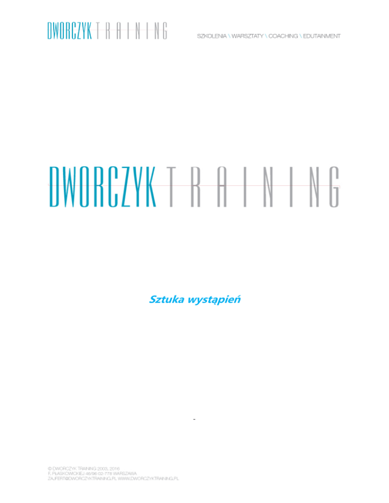 Sztuka wystąpień - MIEJSCE SZKOLENIA: WARSZAWA, TEATR BAZA DATA SZKOLENIA: 19-20.10. 2016 r. w godz. 9:00-17:00 KOSZT: 890 złotych/1 os. +VAT METODOGIA WARSZTATÓW Wykłady aktywizujące Coaching grupowy Burza mózgów Trening z kamerą Pantomima Aktorskie ćwiczenia głosowe PROGRAM 1. Talent, predyspozycje czy technika, czyli czy do tego trzeba się urodzić? Pierwsze wrażenie i znaczenie pozawerbalnych komunikatów w kontekście budowania wspólnej płaszczyzny z odbiorcami. Budowa portretu komunikacyjnego osoby mówiącej. Odkrywanie nowej świadomości ciała, czyli jak wyglądam i jak jestem postrzegany. Czy widać kompetencje? Postawa a kompetencje jako warunek skupienia uwagi i początek wywierania wpływu. Gestykulacja, a wywieranie wpływu, czyli co mówię, kiedy nie mówię i jak czytam innych? Postrzeganie przez audytorium. Co oni sobie o tobie myślą? Tylko to, co do nich wyślesz. To Ty decydujesz, jak Cię odbiorą. Elementarne zadanie aktorskie. 2. Jak uzyskać akceptację dla swoich pomysłów, idei, strategii, punktów widzenia, stanowisk? Czyli komu mówią „Tak!”? Rola pewności siebie w budowaniu autorytetu u odbiorcy. Najważniejszym argumentem każdej wypowiedzi jesteś Ty! Zbuduj swój autorytet. Jak to zrobić? Pewność siebie jako warunek konieczny przed rozpoczęciem wystąpienia/prezentacji. Występowanie z pozycji autorytetu (właściwa osoba na właściwym miejscu). Budowanie wiarygodności, stałości, solidności. Jak bronić własnego stanowiska nie atakując przy tym naszego odbiorcy/rozmówcy Dobre przygotowanie a pewność siebie. 3. Jak utrzymać władzę i sprawić by oni płynęli z prądem czyli…szczególna relacja występującego i jego audytorium. Twoja obserwacja i kontrola. Czego i jak masz słuchać prezentując? Do kogo mówisz? po co ci informacje o twoim odbiorcy – Abyś miał nad nimi władzę…ona jest ci potrzebna, jeśli chcesz wywierać wpływ Błędy prezentacyjne. Co sprawia, że jesteś sobie a muzom? – Pamiętaj nawet kiedy mówisz tylko ty, to dalej ma być dialog. Czyli o tym, że oni potrafią czytać slajdy. Udowodnij, że jesteś tam nie tylko na etacie lektora… O interakcji, czyli techniki wzbudzania zainteresowania i utrzymywania uwagi słuchaczy. Nie jesteś na scenie sam. Oni też muszą poczuć FLOW czyli o co chodzi z tą chemią? Zgodność przekazu werbalnego i mowy ciała. Jakoś tak jest, że ludzie cenią spójność i harmonię. – Daj im to! 4. Sztuka przygotowania nowoczesnej prezentacji perswazyjnej. Oparcie konstrukcji na metodzie rombu. Tworzenie porywającego intro do prezentacji. Metoda Tezy i Sugestii. O co ci właściwie chodzi? O proporcjach pomiędzy poszczególnymi częściami rombu. Romb jest precyzyjnym wzorem konstrukcyjnym, wystarczy podstawić dane Podprogowe zarządzanie wnioskiem, czyli o sile wpływu na audytorium, jak sprzedać swoją ideę Zaangażowanie emocji jako klucz do zmiany. Tajemnica mocnych wstępów, czyli co to jest EPU i jaką spełnia funkcję w koncepcji dostarczenia prezentacji do odbiorcy? A także o tym jak nie dopuścić do tego, aby fajerwerki odwróciły uwagę od sedna sprawy, a jedynie ułatwić zadanie percepcji naszego słuchacza? 5. Prezentacje własnej idei, pomysłu, stanowiska. Kurtyna W górę! Wystąpienie tematyczne w wykonaniu uczestnika. Po przemowach następuje odtworzenie materiału. Analiza mocnych i słabych stron. 6. Znaczenie głosu, metody wywierania wpływu głosem, czyli…przemawiaj niczym Winston Churchill. Rozpoznanie mówienia z technicznego punktu widzenia, czyli niech żyje szeroka samogłoska. Prawidłowe oddychanie przeponowo-żebrowe. Długość i dynamika oddechu. W poszukiwaniu średnicy głosu, czyli nie za nisko nie za wysoko. Poprawna wymowa. Akcent logiczny i wyrazowy, sztuka władania pauzą. Tempo, siła, barwa, melodyka wypowiedzi. 7. Nie taki diabeł straszny, czyli to nieprawda, że występ publiczny jest gorszy, niż wizyta u dentysty. Stres przed prezentacją wynika z autocenzury, nastawienia, a technicznie bierze się ze złego oddychania i niezredukowania napięcia mięśniowego. A zatem jest to całkowicie do usunięcia. Najpierw relaks w płucach czyli o oddychaniu Geneza tremy. Poznanie prawdziwej przyczyny stresu Techniki redukcji napięcia ZAPRASZAMY DO WSPÓŁPRACY Z DWORCZYK TRAINING ZAUFALI NAM: