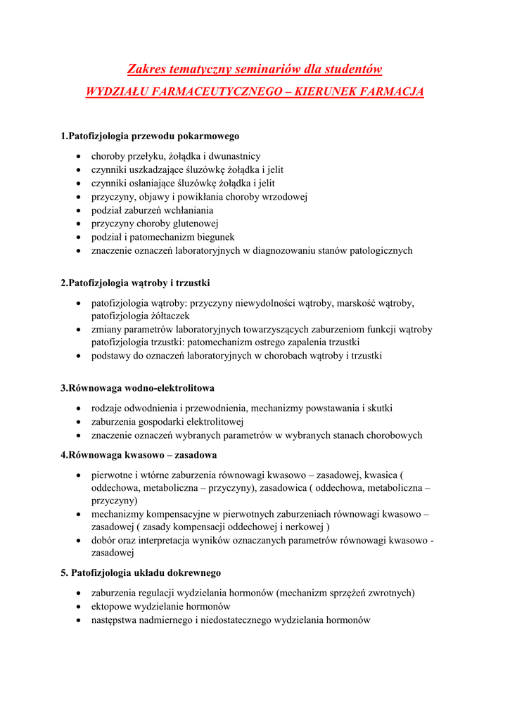 Zakres tematyczny seminariów dla studentów WYDZIAŁU FARMACEUTYCZNEGO – KIERUNEK FARMACJA 1.Patofizjologia przewodu pokarmowego choroby przełyku, żołądka i dwunastnicy czynniki uszkadzające śluzówkę żołądka i jelit czynniki osłaniające śluzówkę żołądka i jelit przyczyny, objawy i powikłania choroby wrzodowej podział zaburzeń wchłaniania przyczyny choroby glutenowej podział i patomechanizm biegunek znaczenie oznaczeń laboratoryjnych w diagnozowaniu stanów patologicznych 2.Patofizjologia wątroby i trzustki patofizjologia wątroby: przyczyny niewydolności wątroby, marskość wątroby, patofizjologia żółtaczek zmiany parametrów laboratoryjnych towarzyszących zaburzeniom funkcji wątroby patofizjologia trzustki: patomechanizm ostrego zapalenia trzustki podstawy do oznaczeń laboratoryjnych w chorobach wątroby i trzustki 3.Równowaga wodno-elektrolitowa rodzaje odwodnienia i przewodnienia, mechanizmy powstawania i skutki zaburzenia gospodarki elektrolitowej znaczenie oznaczeń wybranych parametrów w wybranych stanach chorobowych 4.Równowaga kwasowo – zasadowa pierwotne i wtórne zaburzenia równowagi kwasowo – zasadowej, kwasica ( oddechowa, metaboliczna – przyczyny), zasadowica ( oddechowa, metaboliczna – przyczyny) mechanizmy kompensacyjne w pierwotnych zaburzeniach równowagi kwasowo – zasadowej ( zasady kompensacji oddechowej i nerkowej ) dobór oraz interpretacja wyników oznaczanych parametrów równowagi kwasowo zasadowej 5. Patofizjologia układu dokrewnego zaburzenia regulacji wydzielania hormonów (mechanizm sprzężeń zwrotnych) ektopowe wydzielanie hormonów następstwa nadmiernego i niedostatecznego wydzielania hormonów nadczynność i niedoczynność gruczołów dokrewnych: nadczynność gruczołu tarczowego ( choroba Gravesa-Basedova – etiopatogeneza, wole guzkowe nadczynne – etiopatogeneza, przełom tyreotoksyczny – przyczyny ) niedoczynność gruczołu tarczowego ( postaci pierwotne i wtórne ) nadczynność i niedoczynność kory nadnerczy ( choroba Cushinga , zespół Cusinga, zespół Coona, choroba Addisona ) znaczenie doboru właściwych parametrów diagnostycznych w w/w stanach 6. Patofizjologia układu oddechowego wentylacja, perfuzja oraz wymiana gazów w płucach i ich zmiany w warunkach patologicznych zaburzenia transportu gazów oddechowych we krwi i zaopatrzenia tkanek regulacja oddychania i jej zaburzenia – nerwowa i chemiczna regulacja oddychania, duszność, patologiczne typy oddychania charakterystyka zaburzeń wentylacji typu obturacyjnego na przykładzie wybranych jednostek chorobowych charakterystyka zaburzeń wentylacji typu restrykcyjnego na przykładzie wybranych jednostek chorobowych patomechanizm niewydolności oddechowej: częściowej ( hipoksemicznej ), całkowitej ( hipoksemia + hiperkapnia ), kompensacja nerkowa kwasicy oddechowej mechanizm powstawania zespołu serca płucnego 7. Miażdżyca zmiany czynnościowe i morfologiczne tętnic , przyczyny powstawania zmian miażdżycowych mechanizm powstawania pierwotnych zmian miażdżycowych, rozwój blaszki miażdżycowej, rola homocysteiny oraz lipidów ustrojowych w powstawaniu miażdżycy wpływ tłuszczów pożywienia na lipidy osocza krwi podstawy interpretacji zaburzeń parametrów gospodarki lipidowej - profil miażdżycowy 8. Cukrzyca Zaburzenia ustrojowe i narządowe towarzyszące cukrzycy Ostre zaburzenia metaboliczne Przewlekłe powikłania cukrzycy znaczenie profilu glikemii oraz krzywej glikemicznej w diagnostyce cukrzycy 9. Krew i krzepnięcie patofizjologia układu czerwonokrwinkowego, niedokrwistości (aplastyczna, hemolityczna , niedoborowa ) nadkrwistości patogeneza, konsekwencje ogólnoustrojowe zaburzenia ilości i funkcji krwinek białych we krwi etiologia białaczek. Ostra białaczka szpikowa. Przewlekła białaczka szpikowa. patofizjologia hemostazy Zburzenia hemostazy naczyniowej (skazy naczyniowe). Zaburzenia hemostazy płytkowej; przyczyny skazy krwotocznej pochodzenia płytkowego. Zaburzenia osoczowych czynników krzepnięcia (zaburzenia układu krzepnięcia, fibrynolizy, kininogenezy). Osoczowe skazy krwotoczne i trombofilie skazy krwotoczne – naczyniowe, osoczowe, płytkowe ( trombocytopenie, trombocytopatie ) nadkrzepliwość krwi, patofizjologia fibrynolizy 10. Patofizjologia układu krążenia Patogeneza choroby niedokrwiennej serca; zawał serca. Patogeneza ostrych i przewlekłych niewydolności krążenia: podział niewydolności serca, przyczyny niewydolności krążenia, patomechanizm objawów niewydolności serca, niewydolność krążenia pochodzenia obwodowego. Zaburzenia regulacji ciśnienia tętniczego krwi: patogeneza choroby nadciśnieniowej, podział nadciśnienia tętniczego, powikłania narządowe w chorobie nadciśnieniowej. czynniki naczyniozwężające i naczyniorozszerzające markery zawału serca 11. Patofizjologia układu nerwowego rola części ośrodkowej i obwodowej układu nerwowego zaburzenia czuciowe i ruchowe zaburzenia funkcji układu wegetatywnego mediatory, funkcje synapsy efekty zaburzeń w krążeniu mózgowym zapalenie opon i mózgu, obrzęk mózgu mechanizm działania leków w obrębie synapsy 12. Zaburzenia odżywiania otyłość neuroendokrynna kontrola głodu i sytości - regulacja odżywiania wewnątrzwydzielnicza czynność tkanki tłuszczowej adipokiny powikłania otyłości niedożywienie – przyczyny, zaburzenia metaboliczne kacheksja – przyczyny, zaburzenia metaboliczne kacheksja nowotworowa kacheksja w niewydolności krążenia kacheksja w niewydolności nerek kacheksja w POCHP sarkopenia - przyczyny, zaburzenia metaboliczne Podręczniki zalecane: 1. B. Zahorska-Markiewicz, E. Małecka-Tendera.: ”Patofizjologia kliniczna”, Elsevier Urban & Partner, Wrocław 2009 2. Silbernagl S., Lang F.: „Atlas patofizjologii“. MedPharm Polska, Wrocław, 2011 3. Damjanov I.:”Patofizjologia”, Elsevier Urban & Partner, Wrocław 2009 4. Bręborowicz A.: „Zarys patofizj