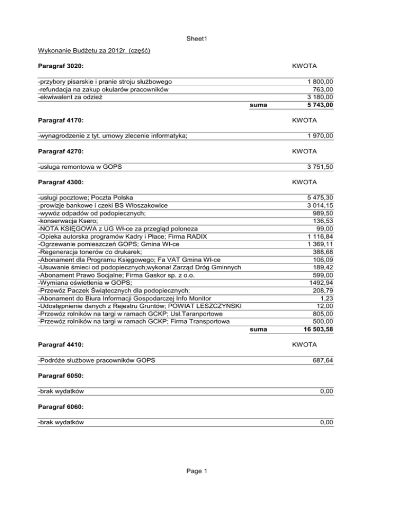 Sheet1 Wykonanie Budżetu za 2012r. (część) Paragraf 3020: KWOTA -przybory pisarskie i pranie stroju służbowego -refundacja na zakup okularów pracowników -ekwiwalent za odzież suma Paragraf 4170: 1 800,00 763,00 3 180,00 5 743,00 KWOTA -wynagrodzenie z tyt. umowy zlecenie informatyka; 1 970,00 Paragraf 4270: KWOTA -usługa remontowa w GOPS 3 751,50 Paragraf 4300: KWOTA -usługi pocztowe; Poczta Polska -prowizje bankowe i czeki BS Włoszakowice -wywóz odpadów od podopiecznych; -konserwacja Ksero; -NOTA KSIĘGOWA z UG Wł-ce za przegląd poloneza -Opieka autorska programów Kadry i Płace; Firma RADIX -Ogrzewanie pomieszczeń GOPS; Gmina Wł-ce -Regeneracja tonerów do drukarek; -Abonament dla Programu Księgowego; Fa VAT Gmina Wł-ce -Usuwanie śmieci od podopiecznych;wykonał Zarząd Dróg Gminnych -Abonament Prawo Socjalne; Firma Gaskor sp. z o.o. -Wymiana oświetlenia w GOPS; -Przewóz Paczek Świątecznych dla podopiecznych; -Abonament do Biura Informacji Gospodarczej Info Monitor -Udostępnienie danych z Rejestru Gruntów; POWIAT LESZCZYŃSKI -Przewóz rolników na targi w ramach GCKP; Usł.Taranportowe -Przewóz rolników na targi w ramach GCKP; Firma Transportowa suma Paragraf 4410: 5 475,30 3 014,15 989,50 136,53 99,00 1 116,84 1 369,11 388,68 106,09 189,42 599,00 1492,94 208,79 1,23 12,00 805,00 500,00 16 503,58 KWOTA -Podróże służbowe pracowników GOPS 687,64 Paragraf 6050: -brak wydatków 0,00 Paragraf 6060: -brak wydatków 0,00 Page 1