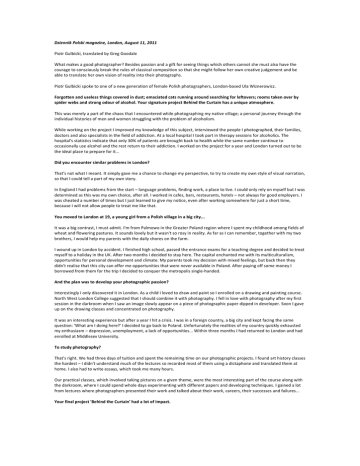 Dziennik Polski magazine, London, August 11, 2011 Piotr Gulbicki, translated by Greg Goodale What makes a good photographer? Besides passion and a gift for seeing things which others cannot she must also have the courage to consciously break the rules of classical composition so that she might follow her own creative judgement and be able to translate her own vision of reality into their photographs. Piotr Gulbicki spoke to one of a new generation of female Polish photographers, London-‐based Ula Wiznerowicz. Forgotten and useless things covered in dust; emaciated cats running around searching for leftovers; rooms taken over by spider webs and strong odour of alcohol. Your signature project Behind the Curtain has a unique atmosphere. This was merely a part of the chaos that I encountered while photographing my native village; a personal journey through the individual histories of men and women struggling with the problem of alcoholism. While working on the project I improved my knowledge of this subject, interviewed the people I photographed, their families, doctors and also specialists in the field of addiction. At a local hospital I took part in therapy sessions for alcoholics. The hospital's statistics indicate that only 30% of patients are brought back to health while the same number continue to occasionally use alcohol and the rest return to their addiction. I worked on the project for a year and London turned out to be the ideal place to prepare for it... Did you encounter similar problems in London? That's not what I meant. It simply gave me a chance to change my perspective, to try to create my own style of visual narration, so that I could tell a part of my own story. In England I had problems from the start – language problems, finding work, a place to live. I could only rely on myself but I was determined as this was my own choice, after all. I worked in cafes, bars, restaurants, hotels – not always for good employers. I was cheated a number of times but I just learned to give my notice, even after working somewhere for just a short time, because I will not allow people to treat me like that. You moved to London at 19, a young girl from a Polish village in a big city... It was a big contrast, I must admit. I'm from Palmowo in the Greater Poland region where I spent my childhood among fields of wheat and flowering pastures. It sounds lovely but it wasn't so rosy in reality. As far as I can remember, together with my two brothers, I would help my parents with the daily chores on the farm. I wound up in London by accident. I finished high school, passed the entrance exams for a teaching degree and decided to treat myself to a holiday in the UK. After two months I decided to stay here. The capital enchanted me with its multiculturalism, opportunities for personal development and climate. My parents took my decision with mixed feelings, but back then they didn't realise that this city can offer me opportunities that were never available in Poland. After paying off some money I borrowed from them for the trip I decided to conquer the metropolis single-‐handed. And the plan was to develop your photographic passion? Interestingly I only discovered it in London. As a child I loved to draw and paint so I enrolled on a drawing and painting course. North West London College suggested that I should combine it with photography. I fell in love with photography after my first session in the darkroom when I saw an image slowly appear on a piece of photographic paper dipped in developer. Soon I gave up on the drawing classes and concentrated on photography. It was an interesting experience but after a year I hit a crisis. I was in a foreign country, a big city and kept facing the same question: 'What am I doing here?' I decided to go back to Poland. Unfortunately the realities of my country quickly exhausted my enthusiasm – depression, unemployment, a lack of opportunities... Within three months I had returned to London and had enrolled at Middlesex University. To study photography? That's right. We had three days of tuition and spent the remaining time on our photographic projects. I found art history classes the hardest – I didn't understand much of the lectures so recorded most of them using a dictaphone and translated them at home. I also had to write essays, which took me many hours. Our practical classes, which involved taking pictures on a given theme, were the most interesting part of the course along with the darkroom, where I could spend whole days experimenting with different papers and developing techniques. I gained a lot from lectures where photographers presented their work and talked about their work, careers, their successes and failures... Your final project 'Behind the Curtain' had a lot of impact. I put a lot of time and devotion into it, which helped to earn me a few important prizes in the British art world. After my graduate exhibition I qualified for the prestigious D&AD competition which was an exhibition of all the best graduates of art college and art faculty graduates in Great Britain in 2010. I won the main prize. You also featured on British TV. Yes, as one of the four finalists of New Sensation 2010 organized by Channel 4 and London's Saatchi Gallery. Part of the prize was to be featured in a programme made by the station. There was also an article about me in British Journal of Photography, the oldest and most important photography magazine in Great Britain. I also took part in a prestigious exhibition at the House if Nobleman by Regent's Park while Behind the Curtain got a solo exhibition at the Kunstraum Cafe Mitterhofer gallery in Innichen, Italy. How do you take a good photograph? The camera is the most important thing when it comes to technical matters. I prefer to use a medium format Bronica which, when used with film, yields extraordinary quality, depth and sharpness in prints, especially when combined with a fast lens. Composition is also impo