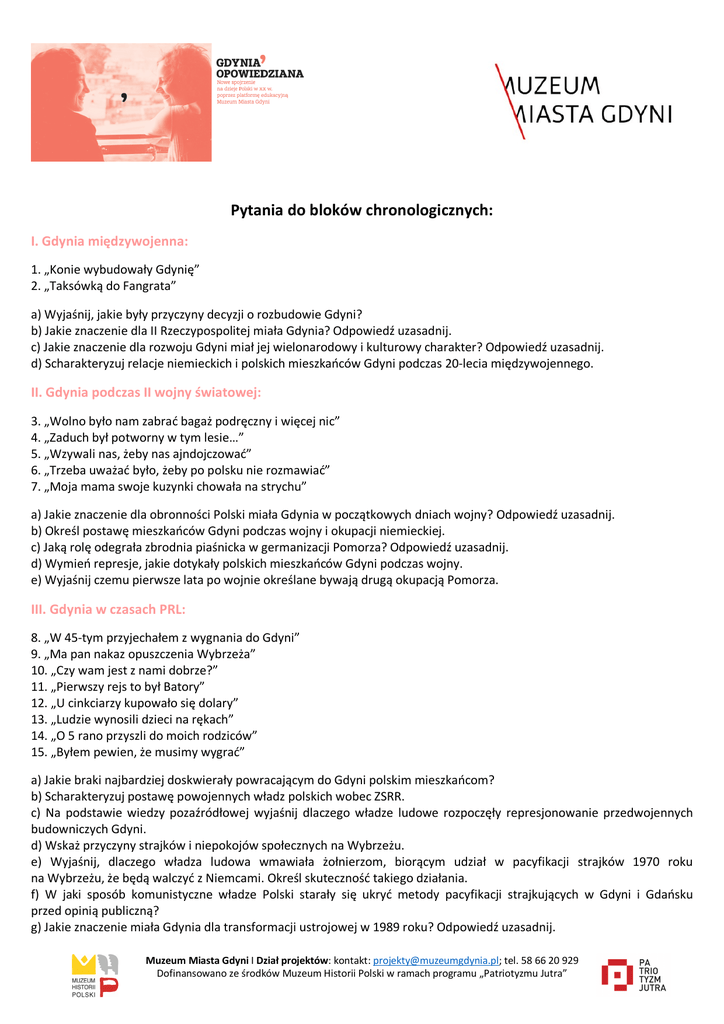 Pytania do bloków chronologicznych: I. Gdynia międzywojenna: 1. „Konie wybudowały Gdynię” 2. „Taksówką do Fangrata” a) Wyjaśnij, jakie były przyczyny decyzji o rozbudowie Gdyni? b) Jakie znaczenie dla II Rzeczypospolitej miała Gdynia? Odpowiedź uzasadnij. c) Jakie znaczenie dla rozwoju Gdyni miał jej wielonarodowy i kulturowy charakter? Odpowiedź uzasadnij. d) Scharakteryzuj relacje niemieckich i polskich mieszkańców Gdyni podczas 20-lecia międzywojennego. II. Gdynia podczas II wojny światowej: 3. „Wolno było nam zabrać bagaż podręczny i więcej nic” 4. „Zaduch był potworny w tym lesie…” 5. „Wzywali nas, żeby nas ajndojczować” 6. „Trzeba uważać było, żeby po polsku nie rozmawiać” 7. „Moja mama swoje kuzynki chowała na strychu” a) Jakie znaczenie dla obronności Polski miała Gdynia w początkowych dniach wojny? Odpowiedź uzasadnij. b) Określ postawę mieszkańców Gdyni podczas wojny i okupacji niemieckiej. c) Jaką rolę odegrała zbrodnia piaśnicka w germanizacji Pomorza? Odpowiedź uzasadnij. d) Wymień represje, jakie dotykały polskich mieszkańców Gdyni podczas wojny. e) Wyjaśnij czemu pierwsze lata po wojnie określane bywają drugą okupacją Pomorza. III. Gdynia w czasach PRL: 8. „W 45-tym przyjechałem z wygnania do Gdyni” 9. „Ma pan nakaz opuszczenia Wybrzeża” 10. „Czy wam jest z nami dobrze?” 11. „Pierwszy rejs to był Batory” 12. „U cinkciarzy kupowało się dolary” 13. „Ludzie wynosili dzieci na rękach” 14. „O 5 rano przyszli do moich rodziców” 15. „Byłem pewien, że musimy wygrać” a) Jakie braki najbardziej doskwierały powracającym do Gdyni polskim mieszkańcom? b) Scharakteryzuj postawę powojennych władz polskich wobec ZSRR. c) Na podstawie wiedzy pozaźródłowej wyjaśnij dlaczego władze ludowe rozpoczęły represjonowanie przedwojennych budowniczych Gdyni. d) Wskaż przyczyny strajków i niepokojów społecznych na Wybrzeżu. e) Wyjaśnij, dlaczego władza ludowa wmawiała żołnierzom, biorącym udział w pacyfikacji strajków 1970 roku na Wybrzeżu, że będą walczyć z Niemcami. Określ skuteczność takiego działania. f) W jaki sposób komunistyczne władze Polski starały się ukryć metody pacyfikacji strajkujących w Gdyni i Gdańsku przed opinią publiczną? g) Jakie znaczenie miała Gdynia dla transformacji ustrojowej w 1989 roku? Odpowiedź uzasadnij. Muzeum Miasta Gdyni I Dział projektów: kontakt: [email protected]; tel. 58 66 20 929 Dofinansowano ze środków Muzeum Historii Polski w ramach programu „Patriotyzmu Jutra”