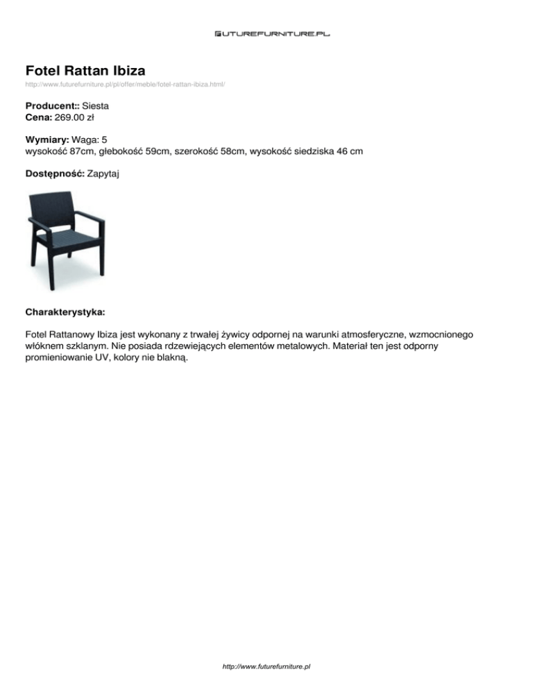 Fotel Rattan Ibiza http://www.futurefurniture.pl/pl/offer/meble/fotel-rattan-ibiza.html/ Producent:: Siesta Cena: 269.00 zł Wymiary: Waga: 5 wysokość 87cm, głebokość 59cm, szerokość 58cm, wysokość siedziska 46 cm Dostępność: Zapytaj Charakterystyka: Fotel Rattanowy Ibiza jest wykonany z trwałej żywicy odpornej na warunki atmosferyczne, wzmocnionego włóknem szklanym. Nie posiada rdzewiejących elementów metalowych. Materiał ten jest odporny promieniowanie UV, kolory nie blakną. http://www.futurefurniture.pl Dostępne wersje produktu: nazwa produktu warianty Fotel Rattanowy Ibiza biały cena 269.00zł dostępne Zapytaj Fotel Rattanowy Ibiza antracyt 269.00zł Zapytaj Fotel Rattanowy Ibiza brąz 269.00zł Zapytaj http://www.futurefurniture.pl Zdjęcia produktu: http://www.futurefurniture.pl Powered by TCPDF (www.tcpdf.org)