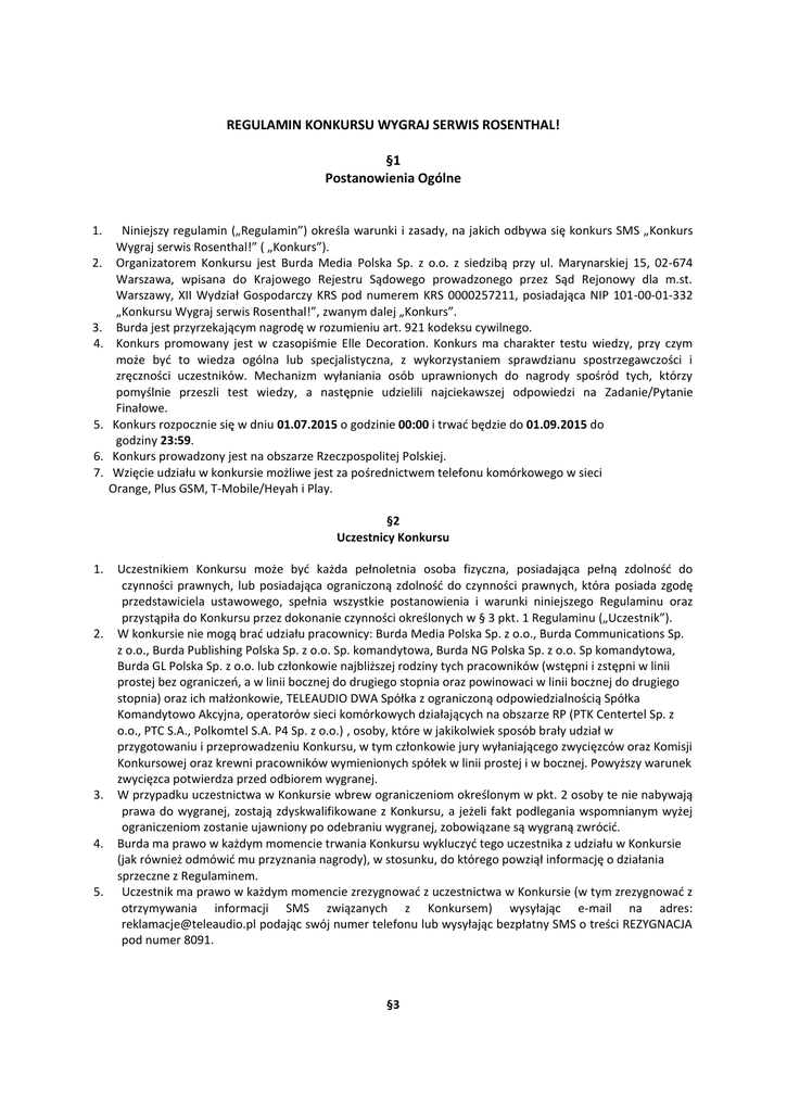 REGULAMIN KONKURSU WYGRAJ SERWIS ROSENTHAL! §1 Postanowienia Ogólne 1. 2. 3. 4. 5. 6. 7. Niniejszy regulamin („Regulamin”) określa warunki i zasady, na jakich odbywa się konkurs SMS „Konkurs Wygraj serwis Rosenthal!” ( „Konkurs”). Organizatorem Konkursu jest Burda Media Polska Sp. z o.o. z siedzibą przy ul. Marynarskiej 15, 02-674 Warszawa, wpisana do Krajowego Rejestru Sądowego prowadzonego przez Sąd Rejonowy dla m.st. Warszawy, XII Wydział Gospodarczy KRS pod numerem KRS 0000257211, posiadająca NIP 101-00-01-332 „Konkursu Wygraj serwis Rosenthal!”, zwanym dalej „Konkurs”. Burda jest przyrzekającym nagrodę w rozumieniu art. 921 kodeksu cywilnego. Konkurs promowany jest w czasopiśmie Elle Decoration. Konkurs ma charakter testu wiedzy, przy czym może być to wiedza ogólna lub specjalistyczna, z wykorzystaniem sprawdzianu spostrzegawczości i zręczności uczestników. Mechanizm wyłaniania osób uprawnionych do nagrody spośród tych, którzy pomyślnie przeszli test wiedzy, a następnie udzielili najciekawszej odpowiedzi na Zadanie/Pytanie Finałowe. Konkurs rozpocznie się w dniu 01.07.2015 o godzinie 00:00 i trwać będzie do 01.09.2015 do godziny 23:59. Konkurs prowadzony jest na obszarze Rzeczpospolitej Polskiej. Wzięcie udziału w konkursie możliwe jest za pośrednictwem telefonu komórkowego w sieci Orange, Plus GSM, T-Mobile/Heyah i Play. §2 Uczestnicy Konkursu 1. 2. 3. 4. 5. Uczestnikiem Konkursu może być każda pełnoletnia osoba fizyczna, posiadająca pełną zdolność do czynności prawnych, lub posiadająca ograniczoną zdolność do czynności prawnych, która posiada zgodę przedstawiciela ustawowego, spełnia wszystkie postanowienia i warunki niniejszego Regulaminu oraz przystąpiła do Konkursu przez dokonanie czynności określonych w § 3 pkt. 1 Regulaminu („Uczestnik”). W konkursie nie mogą brać udziału pracownicy: Burda Media Polska Sp. z o.o., Burda Communications Sp. z o.o., Burda Publishing Polska Sp. z o.o. Sp. komandytowa, Burda NG Polska Sp. z o.o. Sp komandytowa, Burda GL Polska Sp. z o.o. lub członkowie najbliższej rodziny tych pracowników (wstępni i zstępni w linii prostej bez ograniczeń, a w linii bocznej do drugiego stopnia oraz powinowaci w linii bocznej do drugiego stopnia) oraz ich małżonkowie, TELEAUDIO DWA Spółka z ograniczoną odpowiedzialnością Spółka Komandytowo Akcyjna, operatorów sieci komórkowych działających na obszarze RP (PTK Centertel Sp. z o.o., PTC S.A., Polkomtel S.A. P4 Sp. z o.o.) , osoby, które w jakikolwiek sposób brały udział w przygotowaniu i przeprowadzeniu Konkursu, w tym członkowie jury wyłaniającego zwycięzców oraz Komisji Konkursowej oraz krewni pracowników wymienionych spółek w linii prostej i w bocznej. Powyższy warunek zwycięzca potwierdza przed odbiorem wygranej. W przypadku uczestnictwa w Konkursie wbrew ograniczeniom określonym w pkt. 2 osoby te nie nabywają prawa do wygranej, zostają zdyskwalifikowane z Konkursu, a jeżeli fakt podlegania wspomnianym wyżej ograniczeniom zostanie ujawniony po odebraniu wygranej, zobowiązane są wygraną zwrócić. Burda ma prawo w każdym momencie trwania Konkursu wykluczyć tego uczestnika z udziału w Konkursie (jak również odmówić mu przyznania nagrody), w stosunku, do którego powziął informację o działania sprzeczne z Regulaminem. Uczestnik ma prawo w każdym momencie zrezygnować z uczestnictwa w Konkursie (w tym zrezygnować z otrzymywania informacji SMS związanych z Konkursem) wysyłając e-mail na adres: [email protected] podając swój numer telefonu lub wysyłając bezpłatny SMS o treści REZYGNACJA pod numer 8091. §3 Przebieg Konkursu 1. 2. 3. 4. 5. 6. 7. 8. 9. 10. 11. 12. 13. 14. 15. 16. 17. Aby wziąć udział w Konkursie należy w dniach od 01.07.2015 od godziny 00:00 do 01.09.2015 do godziny 23:59 wysłać SMS pod numer 74550 (koszt sms: 4zł netto/4,92zł z VAT) o treści reklamowanej na łamach numeru 4/2015 czasopisma Elle Decoration, tj. o treści ELLEDECO. Uczestnicy, którzy wyślą sms o treści ELLEDECO pod numer 74550 grają o serwis kawowy Biała Maria marki Rosenthal. Po dokonaniu zgłoszenia Uczestnik otrzyma od Organizatora wiadomość SMS z pytaniem konkursowym („Pytanie”). Odpowiedzi na pytanie konkursowe należy udzielać po otrzymaniu Pytania i zaznajomieniu się z jego treścią. Odpowiedź tę należy wysyłać za pomocą SMS pod numer 74550 (koszt sms: 4zł netto/4,92zł z VAT) zgodnie z instrukcją otrzymaną w wiadomości SMS z Pytaniem. Uczestnicy, którzy prawidłowo odpowiedzieli na Pytanie otrzymają od Organizatora SMS z informacją o zakwalifikowaniu do finału Konkursu. W dniu 02.09.2015 r. w godzinach od 11:00 do 23:59 odbędzie się finał Konkursu. Aby wziąć udział w finale Konkursu zakwalifikowani Uczestnicy winni wysłać w trakcie trwania finału Konkursu SMS o treści ROSEN pod numer 74550 (koszt sms: 4zł netto/4,92zł z VAT). Po dokonaniu zgłoszenia Uczestnik otrzyma od Organizatora wiadomość SMS z Zadaniem/Pytaniem Finałowym („Zadanie/Pytanie Finałowe”). Odpowiedzi na Zadanie/Pytanie Finałowe należy udzielaćpo jego otrzymaniu i zaznajomieniu się z jego treścią. Uwaga! Liczba znaków ze spacjami w wiadomości SMS nie powinna przekraczać 160 znaków, nie należy używać polskich znaków. Spośród nadesłanych odpowiedzi na Zadanie/Pytanie Finałowe niezależna komisja konkursowa złożona z 3 przedstawicieli Organizatora (dalej Niezależna Komisja Konkursowa) ustali osobę uprawnioną do nagrody spośród tych Uczestników Konkursu, którzy przesłali odpowiedź na Zadanie/Pytanie Finałowe. Podstawowe kryteria oceny Zadania/Pytania Finałowego są następujące: pomysłowość, zwięzłość i oryginalność odpowiedzi. Niezależna Komisja Konkursowa ma prawo nie przyjąć do Konkursu odpowiedzi niezgodnych z Zadaniem/Pytaniem Finałowym zawartym w sms-ie. Jednemu Uczestnikowi Konkursu jury może przyznać tylko jedną