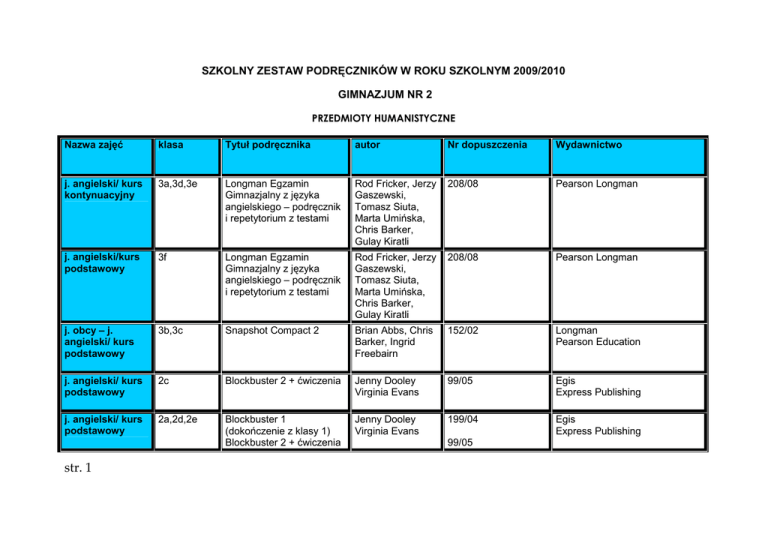 SZKOLNY ZESTAW PODRĘCZNIKÓW W ROKU SZKOLNYM 2009/2010 GIMNAZJUM NR 2 PRZEDMIOTY HUMANISTYCZNE Nazwa zajęć klasa Tytuł podręcznika autor Nr dopuszczenia Wydawnictwo j. angielski/ kurs kontynuacyjny 3a,3d,3e Longman Egzamin Gimnazjalny z języka angielskiego – podręcznik i repetytorium z testami Rod Fricker, Jerzy Gaszewski, Tomasz Siuta, Marta Umińska, Chris Barker, Gulay Kiratli 208/08 Pearson Longman j. angielski/kurs podstawowy 3f Longman Egzamin Gimnazjalny z języka angielskiego – podręcznik i repetytorium z testami Rod Fricker, Jerzy Gaszewski, Tomasz Siuta, Marta Umińska, Chris Barker, Gulay Kiratli 208/08 Pearson Longman j. obcy – j. angielski/ kurs podstawowy 3b,3c Snapshot Compact 2 Brian Abbs, Chris Barker, Ingrid Freebairn 152/02 Longman Pearson Education j. angielski/ kurs podstawowy 2c Blockbuster 2 + ćwiczenia Jenny Dooley Virginia Evans 99/05 Egis Express Publishing j. angielski/ kurs podstawowy 2a,2d,2e Blockbuster 1 (dokończenie z klasy 1) Blockbuster 2 + ćwiczenia Jenny Dooley Virginia Evans 199/04 Egis Express Publishing str. 1 99/05 j. angielski/ kurs podstawowy 1 Blockbuster 1+ ćwiczenia Jenny Dooley Virginia Evans 10/1/2009 Egis Express Publishing j. angielski/kurs kontynuacyjny 1 Blockbuster 2+ ćwiczenia Jenny Dooley Virginia Evans 10/2/2009 Egis Express Publishing j. niemiecki/ kurs podstawowy 3b,3c,3d,3e Team Deutsch 3+ ćwiczenia A. Einhorn, U. Esterll, E. – M. Jenkins, E. Koerner, A. Kubicka 24/08 Lektorklett j. niemiecki/kurs podstawowy 3a Team Deutsch 1b Team Deutsch 2a + ćwiczenia A. Einhorn, U. Esterll, E. – M. Jenkins, E. Koerner, A. Kubicka 33/06 20/07 Lektorklett j. niemiecki/kurs podstawowy 2b,2d,2e Team Deutsch 2 + ćwiczenia A. Einhorn, U. Esterll, E. – M. Jenkins, E. Koerner, A. Kubicka 20/07 Lektorklett j. niemiecki/kurs podstawowy (2 godz. w tygodniu) 1 Magnet 1 Girgio Motta 98/1/2009 Lektorkleett str. 2 j. niemiecki/kurs podstawowy (3 godz. w tygodniu) 1 Team Deutsch 1 + ćwiczenia A. Einhorn, U. Esterll, E. – M. Jenkins, E. Koerner, A. Kubicka 69/1/2009 Lektorklett j. niemiecki/kurs kontynuacyjny 1 Team Deutsch 1b Team Deutsch 2a + ćwiczenia A. Einhorn, U. Esterll, E. – M. Jenkins, E. Koerner, A. Kubicka 69/1/2009 69/2/2009 Lektorklett historia 3a,b,c,d,e,f Razem przez wieki. Zrozumieć przeszłość Grzegorz Wojciechowski 128/01 Arka historia 2a,b,c,d,e Razem przez wieki. Zrozumieć przeszłość Grzegorz Wojciechowski 228/00 Arka historia 1 Śladami przeszłości pod red. Stanisława Roszaka 60/1/2009 Nowa Era j. polski 3a,b,c,d,e,f „Zrozumieć słowo” Podręcznik do kształcenia literackiego „Zrozumieć słowo” Podręcznik do kształcenia językowego Anita Gis 59/01 Nowa Era „Słowa na czasie” Podręcznik do kształcenia literackiego i kulturowego „Słowa na czasie” Małgorzata Chmiel, Wilga Herman, Zofia Pomirska, j. polski str. 3 2a,b,c,d,e 154/01 95/3/2009 Nowa Era Podręcznik do kształcenia językowego z ćwiczeniami Piotr Doroszewski 95/4/2009 j. polski 1 Język polski kl.1 „Nasz wspólny świat” Podręcznik do kształcenia językowego Język polski kl. 1„Nasz wspólny świat” Podręcznik do kształcenia literackokulturowego Joanna Konowalska, Sławomir Mateja, Iwona Mokrzan Oczekuje na dopuszczenie Wiking 124/1/2009 religia 3a,b,c,d,e,f Jezus prowadzi i zbawia (z serii w drodze do Emous) Marek Zbigniew SJ (red.) AZ-33-01/1-11 WAM religia 2a,b,c,d,e Jezus działa i zbawia ( z serii w drodze do Emous) Marek Zbigniew SJ (red.) AZ-32-01/1-11 WAM religia 1 Jezus uczy i zbawia ( z serii w drodze do Emous) Marek Zbigniew SJ (red.) AZ-31-01/1-11 WAM WOS 3a,b,c,d,e,f Działam aktywnie. Wychowanie do aktywnego udziału w Ŝyciu gospodarczym. A. Dubiecka, Z. Góralewicz 238/02 WSiP SA WOS 2a,b,c,d,e Wiedza o społeczeństwie. Wychowanie obywatelskie M. Gensler, E. Marciniak 192/00 WSiP SA muzyka 3a,b,c,d,e,f Słuchanie muzyki; Muzyka – zeszyt ćwiczeń E. Wachowiak 79/03 Gawa muzyka 2a,b,c,d,e Muzyczny świat T. Wójcik 107/03 MAC Edukacja muzyka 1 Muzyczny świat + T. Wójcik 138/2009 MAC Edukacja str. 4 ćwiczenia plastyka 3a,b,c,d,e,f Sztuka w zasięgu ręki W. Sygut 88/03 MAC Edukacja plastyka 2a,b,c,d,e Sztuka w zasięgu ręki W. Sygut 44/07 MAC Edukacja plastyka 1 W tym cała sztuka J. Gumula 167/2009 MAC Edukacja SZKOLNY ZESTAW PODRĘCZNIKÓW W ROKU SZKOLNYM 2009/2010 GIMNAZJUM NR 2 PRZEDMIOTY MATEMATYCZNO- PRZYRODNICZE NAZWA ZAJĘĆ/ZAKRES GEOGRAFIA BIOLOGIA MATEMATYKA str. 5 KLASA/KLASY TYTUŁ PODRĘCZNIKA AUTOR NR DOPUSZCZENIA WYDAWNICTWO Kl. 1 Puls Ziemi. Podręcznik do geografii dla klasy 1 gimnazjum. + ćwiczenia Malarz R. 5/1/2009 M. ROśAK Kl. 2 Puls Ziemi. Podręcznik do geografii dla klasy 2 gimnazjum + ćwiczenia Uliszak R. 266/04 M. ROśAK Kl. 3 Puls Ziemi. Podręcznik do geografii dla klasy 3 gimnazjum + ćwiczenia Malarz R. 67/05 M. ROśAK Kl. 1 Biologia 1. Podręcznik dla gimnazjum + ćwiczenia. Loritz-Dobrowolska J. Sendecka E. 42/1/2009 OPERON Kl. 2 Biologia 2. Podręcznik dla gimnazjum. + ćwiczenia Loritz-Dobrowolska J. Sendecka E. 103/08 OPERON Kl. 3 Biologia 2. Podręcznik dla gimnazjum. Loritz-Dobrowolska J. Sendecka E. 103/08 OPERON Kl. 1 Matematyka 1. Podręcznik dla klasy pierwszej gimnazjum. Seria matematyka z plusem. Dobrowolska M. 168/1/2009 GWO Kl. 2 Kl. 3 FIZYKA I ASTRONOMIA CHEMIA INFORMATYKA TECHNIKA str. 6 Matematyka 2. Podręcznik dla klasy drugiej gimnazjum. Seria matematyka z plusem. Matematyka 1. Podręcznik dla klasy trzeciej gimnazjum. Seria matematyka z plusem. Dobrowolska M. 133/08 GWO Dobrowolska M. 169/08 GWO Kl. 1 Świat fizyki. Podręcznik dla uczniów gimnazjum. Część 1. Saganowska B., Rozenbajgier M. 11/1/2009 ZamKor Kl. 2 Fizyka 2. Podręcznik dla gimnazjum do fizyki i astronomii. Ścierski I., Tryl K., Wójciak J. 103/00 WIKING Kl. 3 Fizyka 3. Podręcznik dla gimnazjum do fizyki i astronomii. Wójciak J., Tryl K., Jackiewicz B. 141/01 WIKING Kl. 1 Chemia Nowej Ery. Część 1. Podręcznik dla gimnazjum. Kulawik J., Kulawik T., Litw