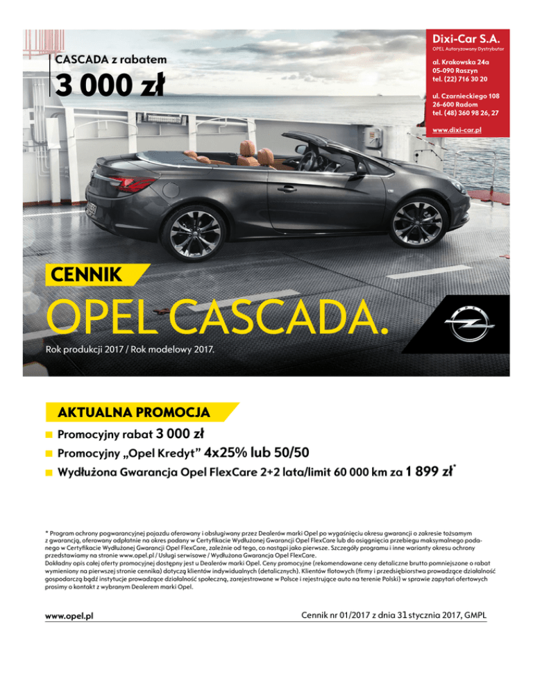 CASCADA z rabatem 3 000 zł CENNIK OPEL CASCADA. Rok produkcji 2017 / Rok modelowy 2017. AKTUALNA PROMOCJA Promocyjny rabat 3 000 zł Promocyjny „Opel Kredyt” 4x25% lub 50/50 Wydłużona Gwarancja Opel FlexCare 2+2 lata/limit 60 000 km za 1 899 zł * * Program ochrony pogwarancyjnej pojazdu oferowany i obsługiwany przez Dealerów marki Opel po wygaśnięciu okresu gwarancji o zakresie tożsamym z gwarancją, oferowany odpłatnie na okres podany w Certyfikacie Wydłużonej Gwarancji Opel FlexCare lub do osiągnięcia przebiegu maksymalnego podanego w Certyfikacie Wydłużonej Gwarancji Opel FlexCare, zależnie od tego, co nastąpi jako pierwsze. Szczegóły programu i inne warianty okresu ochrony przedstawiamy na stronie www.opel.pl / Usługi serwisowe / Wydłużona Gwarancja Opel FlexCare. Dokładny opis całej oferty promocyjnej dostępny jest u Dealerów marki Opel. Ceny promocyjne (rekomendowane ceny detaliczne brutto pomniejszone o rabat wymieniony na pierwszej stronie cennika) dotyczą klientów indywidualnych (detalicznych). Klientów flotowych (firmy i przedsiębiorstwa prowadzące działalność gospodarczą bądź instytucje prowadzące działalność społeczną, zarejestrowane w Polsce i rejestrujące auto na terenie Polski) w sprawie zapytań ofertowych prosimy o kontakt z wybranym Dealerem marki Opel. www.opel.pl Cennik nr 01/2017 z dnia 3 stycznia 2017, GMPL Cennik – Opel Cascada Rok produkcji 2016, rok modelowy 2017 Ceny promocyjne* Cosmo 1.4 Turbo 120 KM M6 112 700 1.4 Turbo 140 KM Start/Stop M6 115 900 1.6 Turbo 170 KM A6 126 250 1.6 Turbo 200 KM Start/Stop M6 127 250 2.0 CDTI 170 KM Start/Stop M6 133 300 Ceny katalogowe Cosmo 1.4 Turbo 120 KM M6 115 700 1.4 Turbo 140 KM Start/Stop M6 118 900 1.6 Turbo 170 KM A6 129 250 1.6 Turbo 200 KM Start/Stop M6 130 250 2.0 CDTI 170 KM Start/Stop M6 136 300 * Dokładny opis całej oferty promocyjnej dostępny jest u Dealerów marki Opel. Ceny promocyjne (rekomendowane ceny detaliczne brutto pomniejszone o rabat wymieniony na pierwszej stronie cennika) dotyczą klientów indywidualnych (detalicznych). Klientów flotowych (firmy i przedsiębiorstwa prowadzące działalność gospodarczą bądź instytucje prowadzące działalność społeczną, zarejestrowane w Polsce i rejestrujące auto na terenie Polski) w sprawie zapytań ofertowych prosimy o kontakt z wybranym Dealerem marki Opel. Cennik Opla Cascady, rok produkcji 2017, rok modelowy 2017, nr 01/2017 z dnia 31 stycznia 2017 1/4 Wyposażenie standardowe NADWOZIE Automatycznie sterowany miękki dach w kolorze czarnym Elektrycznie sterowane i podgrzewane lusterka zewnętrzne w kolorze nadwozia Szyba przednia pochłaniająca promieniowanie cieplne Reflektory przeciwmgielne Światła do jazdy dziennej Tylne lampy w technologii LED Zawieszenie przednie HiPerStrut Zawieszenie tylne z drążkiem Watta Obręcze kół ze stopów lekkich wieloramienne 18x7,5" z oponami 235/50 R18 97V Obniżone zawieszenie sportowe WNĘTRZE Tapicerka Lumio, czarna, tkanina łączona ze skórą sztuczną z przeszyciami Indian Summer. Listwy ozdobne Piano Black. Sportowe fotele przednie 6-kierunkowa regulacja foteli przednich: przód-tył, góra-dół, pochylenie siedziska, pochylenie oparcia Konsola centralna z przesuwanym podłokietnikiem Tylne siedzenia dzielone w proporcji 50/50 Ręcznie obsługiwany system odchylania foteli przednich „Easy Entry” Klimatyzacja dwustrefowa sterowana elektronicznie Nawiewy powietrza w drugim rzędzie siedzeń Komputer pokładowy z wyświetlaczem graficznym między tarczami wskaźników Kierownica pokryta skórą z przyciskami sterowania System multimedialny CD 600 IntelliLink. Zawiera: 7 głośników, łącza Bluetooth®, USB, AUX-in, wyświetlacz kolorowy 7”. BEZPIECZEŃSTWO I UKŁADY WSPOMAGAJĄCE KIEROWCĘ Układ stabilizacji toru jazdy ESP® System Opel OnStar® Przednie i boczne pełnowymiarowe poduszki powietrzne dla kierowcy i pasażera Aktywne zagłówki foteli przednich Tempomat z ogranicznikiem prędkości Czujniki parkowania z tyłu System monitorujący ciśnienie w oponach z kalibracją manualną Hamulec postojowy sterowany elektrycznie. Zawiera: układ wspomagania ruszania pod górę. Wyłącznik przedniej i bocznej poduszki powietrznej pasażera System przypominania o zapięciu pasów na przednich siedzeniach Elektrycznie sterowane podajniki pasów bezpieczeństwa Zaczepy Isofix w oparciach tylnych zewnętrznych siedzeń Cosmo 19T DWE AKP T3U T3Z UGE GNB GNG RQJ XJ2 TAJT AE4/AG6 XADU A46 CJ2 N34/UC3 UFW UE1 AJG AJF K33 UD7 UJM J71 UH0/UH1 S S S S S S S S S S S S S S S S S S S S S S S S S S S S S S S S S Wyposażenie dodatkowe NADWOZIE Lakier metaliczny / perłowy / opalizujący 21J / 21K / 21H Miękki dach w kolorze Malbec lub Sweet Mokka lub Khaki. Zawiera: Dodatkową akustyczną izolację C1Y Dodatkowa akustyczna izolacja dachu DWF Elektrycznie składane lusterka boczne A8Z Adaptacyjne reflektory bi-ksenonowe AFL ze spryskiwaczami i światłami LED do jazdy dziennej. Zawiera: Pakiet Dobrej Widoczności CE4 Spryskiwacze reflektorów F45 Adaptacyjny układ jezdny FlexRide Q1P Obręcze kół ze stopów lekkich 5-ramienne 19x8", opony 235/45 R19 95W (dostępność zależna od wersji) RT8 Obręcze kół ze stopów lekkich 5-ramienne 19x8", opony 235/45 R19 95W (dostępność zależna od wersji) RVB Obręcze kół ze stopów lekkich wieloramienne, dwukolorowe 19x8", opony 235/45 R19 95W (dostępność zależna od wersji) RQ9/RTH/RQA Obręcze kół ze stopów lekkich 5-ramienne, dwukolorowe 20x8,5", opony 245/40 R20 95W (dostępność zależna od wersji) RUA Zapasowe koło dojazdowe, stalowe 17" WNĘTRZE Tapicerka Siena skórzana perforowana z elementami ze sztucznej skóry, czarna z przeszyciami „Star Silver”. TAAV Zawiera: Pakiet Ergonomicznych Foteli Przednich, listwy ozdobne „Black Magic”. Tapicerka Siena skórzana perforowana z elementami ze sztucznej skóry, beżowa. TAMD Zawiera: Pakiet Ergonomicznych Foteli Przednich, listwy ozdobne „P