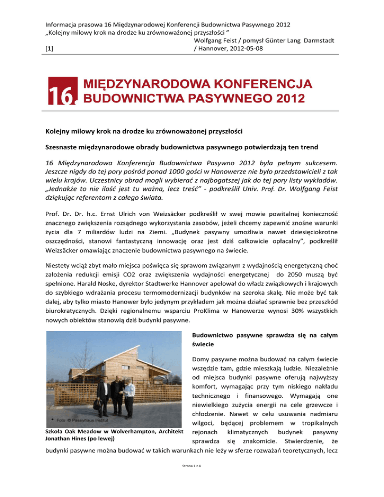 Informacja prasowa 16 Międzynarodowej Konferencji Budownictwa Pasywnego 2012 „Kolejny milowy krok na drodze ku zrównoważonej przyszłości ” Wolfgang Feist / pomysł Günter Lang Darmstadt [1] / Hannover, 2012-05-08 Kolejny milowy krok na drodze ku zrównoważonej przyszłości Szesnaste międzynarodowe obrady budownictwa pasywnego potwierdzają ten trend 16 Międzynarodowa Konferencja Budownictwa Pasywno 2012 była pełnym sukcesem. Jeszcze nigdy do tej pory pośród ponad 1000 gości w Hanowerze nie było przedstawicieli z tak wielu krajów. Uczestnicy obrad mogli wybierać z najbogatszej jak do tej pory listy wykładów. „Jednakże to nie ilość jest tu ważna, lecz treść” - podkreślił Univ. Prof. Dr. Wolfgang Feist dziękując referentom z całego świata. Prof. Dr. Dr. h.c. Ernst Ulrich von Weizsäcker podkreślił w swej mowie powitalnej konieczność znacznego zwiększenia rozsądnego wykorzystania zasobów, jeżeli chcemy zapewnić znośne warunki życia dla 7 miliardów ludzi na Ziemi. „Budynek pasywny umożliwia nawet dziesięciokrotne oszczędności, stanowi fantastyczną innowację oraz jest dziś całkowicie opłacalny”, podkreślił Weizsäcker omawiając znaczenie budownictwa pasywnego na świecie. Niestety wciąż zbyt mało miejsca poświęca się sprawom związanym z wydajnością energetyczną choć założenia redukcji emisji CO2 oraz zwiększenia wydajności energetycznej do 2050 muszą być spełnione. Harald Noske, dyrektor Stadtwerke Hannover apelował do władz związkowych i krajowych do szybkiego wdrażania procesu termomodernizacji budynków na szeroka skalę. Nie może być tak dalej, aby tylko miasto Hanower było jedynym przykładem jak można działać sprawnie bez przeszkód biurokratycznych. Dzięki regionalnemu wsparciu ProKlima w Hanowerze wynosi 30% wszystkich nowych obiektów stanowią dziś budynki pasywne. Budownictwo pasywne sprawdza się na całym świecie Domy pasywne można budować na całym świecie wszędzie tam, gdzie mieszkają ludzie. Niezależnie od miejsca budynki pasywne oferują najwyższy komfort, wymagając przy tym niskiego nakładu technicznego i finansowego. Wymagają one niewielkiego zużycia energii na cele grzewcze i chłodzenie. Nawet w celu usuwania nadmiaru wilgoci, będącej problemem w tropikalnych Szkoła Oak Meadow w Wolverhampton, Architekt rejonach klimatycznych budynek pasywny Jonathan Hines (po lewej) sprawdza się znakomicie. Stwierdzenie, że budynki pasywne można budować w takich warunkach nie leży w sferze rozważań teoretycznych, lecz Strona 1 z 4 Informacja prasowa 16 Międzynarodowej Konferencji Budownictwa Pasywnego 2012 „Kolejny milowy krok na drodze ku zrównoważonej przyszłości ” Wolfgang Feist / pomysł Günter Lang Darmstadt [2] / Hannover, 2012-05-08 wynika praktycznych doświadczeń. Architekci z USA, Kanady, Wielkiej Brytanii, Szwecji, Hiszpanii, Korei oraz Chin w swych wystąpieniach wskazywali wiele takich przykładów. Szczególną uwagę poświecono tu ambasadzie austriackiej zbudowanej w Dżakarcie w standardzie budynku pasywnego, którą zaprezentował wiedeński architekt Fritz Oettl. Szczególnym wynikiem obrad było potwierdzeni stwierdzenia, że budynki pasywne rzeczywiście przynoszą olbrzymie oszczędności energetyczne dla których je stworzono. Udowodniły to przykłady z USA, termomodernizacji budynków w zabudowie szeregowej z Londynu, szkoły w miejscowości Wolverhampton (Anglia) oraz pierwszego Tegu typu obiektu z Hiszpanii. Coraz lepsze komponenty prowadzą do tego, że coraz łatwiej projektować i budować budynki pasywne. Największa jak do tej pory zorganizowana wystawa budownictwa pasywnego pokazała jak duże poczyniono postępy w zakresie komponentów pasywnych – wiele nowych okien pasywnych klasy A, kolejna certyfikowana kompaktowa pompa ciepła oraz zaawansowane technologicznie centrale wentylacyjne. Nowe osiągnięcia w tej dziedzinie umożliwiają realizację budynków pasywnych na całym świecie. Przykładowo zaprezentowano Prof. Dr. Feist podczas wystawy budownictwa rewolucyjne oszklenia o wartości U 0,1 W/m2K, pasywnego 2012 które w przyszłości umożliwią budowę domów pasywnych w Ułan Bator (Mongolia) będącej najzimniejsza stolicą świata. Na wyżynach w Meksyku czy też w Portugalii czyli tzw. „szczęśliwych klimatach” można zrealizować budynki pasywne całkiem bez ogrzewania, chłodzenia czy usuwania wilgoci stosując jedynie całkiem proste rozwiązania. Coraz większe zapotrzebowanie na certyfikowaną jakość budynku pasywnego Na świecie istnieje obecnie 40.000 domów pasywnych o powierzchni użytkowej wynoszącej 20 milionów metrów kwadratowych. Natomiast dotychczas 2.500 architektów i inżynierów budowlanych zdobyło uprawnienia certyfikowanego projektanta budownictwa pasywnego. Szkolenia takie oferowane są w 20 krajach przez 50 różnych jednostek szkoleniowych. Przykładowo w Grecji projektanci uważają budownictwo pasywne za najlepszą drogę wyjścia z kryzysu. Idea budownictwa pasywnego nie zna granic państwowych, a standard ten można zastosować dla każdego obiektu. Podczas tegorocznych obrad zaprezentowano pierwszą halę tenisową w standardzie budynku pasywnego w miejscowości Växjö w Szwecji. Oraz szpitale we Frankfurcie nada Menem oraz dzielnicy Köln-Chronweiler. Wszystkie te inwestycje w tak różnorodnych klimatach mogły zostać zrealizowane dzięki wszechstronnemu pakietowi do projektowania budynków pasywnych PHPP. Nawet niedawni Strona 2 z 4 Informacja prasowa 16 Międzynarodowej Konferencji Budownictwa Pasywnego 2012 „Kolejny milowy krok na drodze ku zrównoważonej przyszłości ” Wolfgang Feist / pomysł Günter Lang Darmstadt [3] / Hannover, 2012-05-08 sceptycy przekonali się do tego narzędzia i chcą wykorzystywać je do budowy własnych wydajnych energetycznie budynków. Oprogramowanie to uznane zostało za pewną i niezawodną metodę obliczania zapotrzebowania na o