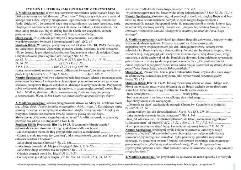 TYDZIEŃ 1: LITURGIA JAKO SPOTKANIE Z CHRYSTUSEM 1. Modlitwa poranna: W tym tyg. czerpiemy natchnienie części stałych Mszy św. Dziś zatrzymamy się nad słowami: „Pan z wami". Bóg rzeczywiście jest z nami od samego rana i chce, abyśmy przyjmowali Jego obecność z radością. Pomódl się: Panie, dziękuję Ci, że czuwałeś nade mną przez całą noc i że teraz jesteś przy mnie. Dziękuję, że codziennie na nowo jesteś dla mnie, za miłość, z którą czekasz, i za moc, którą przynosisz. Daj mi dzisiaj być dla Ciebie we wszystkim, co będę podejmować. Ps 63(62): Boże, mój Boże, szukam Ciebie... Słowo życia: „Nie jesteście już obcymi i przychodniami, ale jesteście współobywatelami świętych i domownikami Boga". Ef 2, 19 Studium Biblii: W tym tyg. pochylimy się nad tekstem: Hbr 10, 19-25. Przeczytaj go. Jakie myśli porusza? Zapamiętaj pierwsze zdanie, będziemy je dziś rozważać. - Krew Jezusa, Jego śmierć na krzyżu, jest fundamentem wiary chrześcijan. Czego Chrystus dokonał przez wylanie krwi swojej? Hbr 13, 20..……...……………….…; Ap 12, 11..……..………...; Rz 3, 25;5, 9; Ef l,7; Hbr 9, 13 1 P 1, 18-19. …………; Dz 20, 28……………..…..….….; Ef 2,13 i Kol 1, 20 …………….……………..…; 1 P 1, 1-2……………….…..; Hbr 12,22-24 i Ap 5,9b-10……………….…………; - Jaką rzeczywistość możemy nazwać „Miejscem Świętym", do którego wejdziemy przez krzyż Jezusa? (1J 1, 7 i Ap 1, 5b-6) ………..…..…Ap 7, 14b-15……………… Namiot Spotkania: Modlitwę wieczorną będą inspirowały zdania z mszalnego aktu pokutnego. Na końcu każdego dnia chrześcijanin przypomina sobie, co go w nim spotkało, przeprasza Boga za uchybienia i dziękuje za otrzymane dobra. Przypomnij sobie wydarzenia dnia, zastanów się nad tym, w czym mogłeś zawinić wobec Boga i ludzi. Módl się słowami: „Boże, spowiadam się Tobie wyznaję zło, proszę o przebaczenie. Wiem, że bez Ciebie nie jestem zdolny do prawdziwego dobra". -Gdzie ma źródło każda Boża droga prawdy?: J 14, 4-6, ……………..…………….. -w jakim postępowaniu św. Paweł widzi drogę najdoskonalszą? 1 Kor 12, 31; 13,1-n Namiot Spotkania: Zastanów się, jak przebiegł ci ten dzień, dziękuj Bogu za dobro, które się stało twoim udziałem; pomyśl, w czym mogłeś Boga zasmucić i przepraszaj Go gorąco. Przypomnij sobie, ilu masz przyjaciół w niebie, którym leży na sercu twój duchowy rozwój. Pomódl się: „Błagam Najświętszą Maryję, zawsze Dziewicę,/ wszystkich Aniołów i Świętych/ o modlitwę za mnie/ do Pana, Boga naszego". 3. Modlitwa poranna: Każdy dzień jest darem Boga dla człowieka. Jesteśmy w nim wezwani do dziękczynienia. Możemy to czynić na różne sposoby, ale najpiękniejszym dziękczynieniem jest dar. Dlatego prawdziwy, szczery zwrot człowieka ku Bogu wiąże się z darem, ofiarą. Pomódl się, by dzień dzisiejszy, który został ci dany, Bóg przyjął jako swój dzień w twoim życiu, żeby dokonywał, czego sam chce, a ciebie zachował od zła. Pomódl się słowami, które celebrans wypowiada przed złożeniem ofiary (podczas przygotowania darów): „Przyjmij nas (mnie), Panie, stojących (ego) przed Tobą,/ niech nasza (moja) ofiara/ tak się dzisiaj dokona przed Tobą, Panie Boże,/ aby się Tobie podobała." Słowo życia: „Proszę was, bracia, przez miłosierdzie Boże, abyście dali ciała swoje na ofiarę żywą, świętą,Bogu przyjemną, jako wyraz waszej rozumnej służby Bożej."Rz 12,1 Studium Biblii: Hbr 10, 19-25. Dzisiaj rozważymy zdanie od słów: „Mając zaś"... Mówi ono o naszej możliwości zbliżenia się do Boga i zachęca do zrealizowania warunków, które umożliwiają to zbliżenie. Co dla ciebie oznacza: - mieć serce prawe………………..………., - wiarą pełną,………………………..…, - być oczyszczonym na duszy z wszelkiego zła świadomego ……………………….., - być obmytym na ciele wodą czystą…………...……………………………….…….. 2. Modlitwa poranna: Podczas przygotowania darów we Mszy św. celebrans modli - „Obmycie na ciele" nawiązuje do obrzędu Chrztu Św. Czym było w życiu św. się: „Boże, dzięki Twojej hojności otrzymaliśmy chleb... wino...". Dzisiejszego ranka Pawła? Dz 22, 16……………………………………..……………………………… spróbuj rozważyć, co otrzymujesz codziennie „dzięki Bożej hojności". Dziękuj za - Jakim znakiem jest dla chrześcijanina?1 Kor 6, 11 i Ef 5, 25b-26………………... wszystko. Pomódl się psalmem 19(18): Niebiosa głoszą chwałę Boga... - Jaką budowlę stanowią ludzie ochrzczeni? Hbr 3, 5-6 ……………………………. Słowo życia: „Cóż masz, czego byś nie otrzymał? A jeśliś otrzymał, to czemu się - Kto jest właścicielem, „wielkim kapłanem", ale także „kamieniem węgielnym" chełpisz, tak jakbyś nie otrzymał?"1 Kor 4, 7b i „fundamentem" tej budowli? Ef 2, 19-22, 1 Kor 3, 11-17, 1 P 2, 4-5……………… Studium Biblii: Przeczytaj: Hbr 10, 19-25. O czym mówi drugie zdanie? - O co powinniśmy się starać będąc kamieniami tej samej świątyni? Rz 14, 19…….. odpowiedz swoimi słowami: - Czego i jak dokonał dla nas Jezus? ............................. Namiot Spotkania: Przebiegnij myślą kolejne wydarzenia. Jakie były twoje - Jakie znaczenie ma to, że Bóg przyjął ciało, stał się człowiekiem? …………….… spotkania z ludźmi? Jak spełniałeś swoje obowiązki: czy wykorzystałeś każdą - Czemu to ciało nazwane jest „zasłoną", jaka rzeczywistość „zasłaniana" jest przez sposobność, by niczego nie zaniedbać, byłeś pracowity, potrafiłeś racjonalnie człowieczeństwo Chrystusa?..................................................... odpocząć, by praca była owocna? Pomódl się słowami mszalnego aktu pokutnego i 