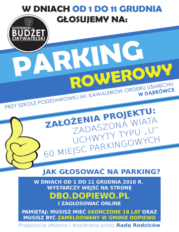 W DNIACH OD 1 DO 11 GRUDNIA GŁOSUJEMY NA: JAK GŁOSOWAĆ NA PARKING? W DNIACH OD 1 DO 11 GRUDNIA 2016 R. WYSTARCZY WEJŚĆ NA STRONĘ DBO.DOPIEWO.PL I ZAGŁOSOWAĆ ONLINE PAMIĘTAJ: MUSISZ MIEĆ SKOŃCZONE 18 LAT ORAZ MUSISZ BYĆ ZAMELDOWANY W GMINIE DOPIEWO Propozycja złożona i wspierana przez Radę Rodziców ZADASZONY PARKING DLA ROWERÓW PRZY BOISKU SZKOŁY PODSTAWOWEJ W DĄBRÓWCE OGÓLNY OPIS ZADANIA Parking dla rowerów w formie zadaszonej wiaty, wyposażony w praktycznie i wytrzymałe stojaki U-kształtne do mocowania rowerów, zlokalizowany w bezpośrednim sąsiedztwie boiska Szkoły Podstawowej im. Kawalerów Orderu Uśmiechu w Dąbrówce. SZCZEGÓŁOWY OPIS ZADANIA WRAZ Z UZASADNIENIEM Projekt zakłada budowę wiaty dwustronnej zadaszonej, z dachem dwuspadowym do środka. Konstrukcja wiaty z profili stalowych malowanych tradycyjnie. Pokrycie z blachy trapezowej. Szerokość wiaty 4m, wysokość 2,2/2,6m do dachu, długość 18,5m. Wiata ma być wyposażona w praktyczne, wytrzymałe i bezpieczne stojaki U-kształtne do mocowania rowerów w ilości 30 szt (przypięcie obustronne - pojemność na 60 rowerów). Dopuszcza się zastosowanie innych rozwiązań projektowych i technologicznych, jeżeli z zapytań ofertowych kierowanych do potencjalnych wykonawców wyniknie, iż bardziej ekonomiczna tj. oszczędna będzie inna konstrukcja wiaty (np. zadaszenie półkoliste czy inne, inny rodzaj pokrycia dachu itp.). Zadaszona wiata rowerowa ma być zlokalizowana w bezpośrednim sąsiedztwie boiska Szkoły Podstawowej im. Kawalerów Orderu Uśmiechu w Dąbrówce. Realizacja tego zadania pozwoli na ukształtowanie ładu przestrzennego terenu znajdującego się w bezpośrednim sąsiedztwie boiska Szkoły Podstawowej im. Kawalerów Orderu Uśmiechu w Dąbrówce. Duża część dzieci uczęszczająca do placówki szkolnej przy ul. Malinowej zamieszkuje na terenie przyległych osiedli mieszkaniowych. Za sprawą istniejącej infrastruktury osiedlowej dzieci chętnie korzystają z transportu rowerowego w codziennym przemieszczaniu się z domu do szkoły i z powrotem. Rowery parkowane są w stojakach zamontowanych przez szkołą, których ilość jest zdecydowanie niewystarczająca. Tylko część rowerów jest parkowana w stojakach, pozostała część rowerów (dla której zabrakło miejsca w stojakach) jest parkowana w „pozycji leżącej” w bezpośrednim sąsiedztwie tych stojaków. Taki sposób parkowania rowerów powoduje bałagan przed szkołą. Dzieci przeciskają się pomiędzy leżącymi rowerami aby wydostać rowery zaparkowane w stojakach. Już teraz do szkoły uczęszcza ponad 500 dzieci a wraz z będącą na ukończeniu rozbudową ta liczba wzrośnie o następne kilkaset uczniów. Dodatkowo niezbyt wysoka jakość stojaków zamontowanych obecnie przy szkole nie zapewnia bezpiecznego zapięcia roweru i niszczy koła oraz tarcze hamulcowe rowerów (w przypadku rowerów wyposażonych w hamulce hydrauliczne). DODATKOWE INFORMACJE ORAZ GŁOSOWANIE ONLINE NA STRONIE: DBO.DOPIEWO.PL
