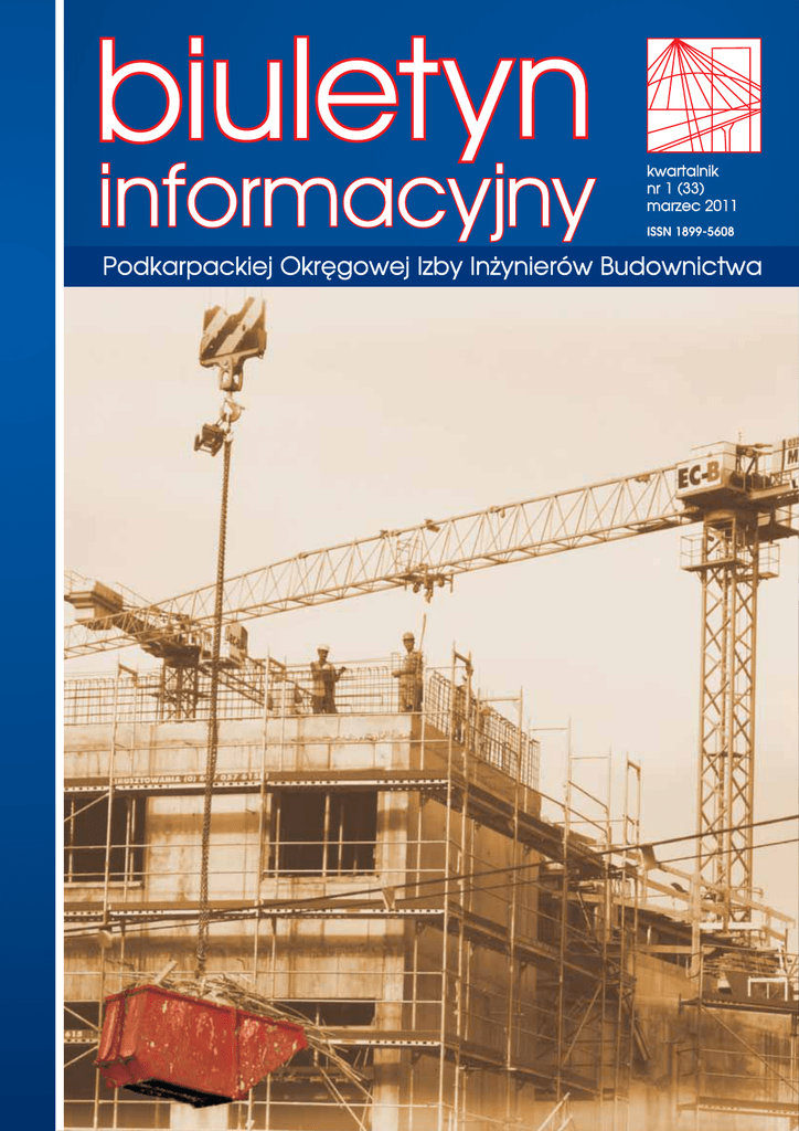 kwartalnik nr 1 (33) marzec 2011 ISSN 1899-5608 Podkarpackiej Okręgowej Izby Inżynierów Budownictwa Podkarpacka Okrêgowa Izba In¿ynierów Budownictwa ul. S³owackiego 20, 35-060 Rzeszów OSOBY PE£NI¥CE FUNKCJE W ORGANACH IZBY W KADENCJI 2010-2014 Sekretariat, Przewodnicz¹cy tel. 17 850 77 05, 17 850 77 06, fax 17 850 77 07 e-mail: [email protected] Portal internetowy e-mail: [email protected] www.inzynier.rzeszow.pl Biuro czynne: od poniedzia³ku do czwartku w godz. 7.30–15.30 Konto Podkarpackiej Okrêgowej Izby In¿ynierów Budownictwa: Kredyt Bank 61 1500 1100 1211 0005 2361 0000 DY¯URY CZŁONKÓW PREZYDIUM RADY PODKARPACKIEJ OKRÊGOWEJ IZBY IN¯YNIERÓW BUDOWNICTWA: mgr inż. Zbigniew Detyna - przewodniczący Rady PDK OIIB wtorki 14.00 - 16.00 mgr inż. Grzegorz Dubik - z-ca przew. Rady PDK OIIB środy 14.00 - 16.00 mgr inż. Jacek Gil - z-ca przew. Rady PDK OIIB poniedziałki godz. 14.00 - 16.00 mgr inż. Andrzej Łuszczyński - skarbnik Rady PDK OIIB poniedziałki godz. 14.00 - 16.00 mgr inż. Leszek Kaczmarczyk - sekretarz Rady PDK OIIB wtorki 14.00 - 16.00 USTALONE DNI I GODZINY UDZIELANIA INFORMACJI I WYJAŚNIEŃ CZŁONKOM PODKARPACKIEJ OKRĘGOWEJ IZBY INŻYNIERÓW BUDOWNICTWA w siedzibie biura PDK OIIB: Przewodniczący Okręgowej Komisji Rewizyjnej mgr inż. Janusz Środa pełni dyżur w środy od 14.00 do 16.00 Przewodniczący Okręgowej Komisji Kwalifikacyjnej dr inż. Zbigniew Plewako pełni dyżur w poniedziałki od godz. 9.00 - 11.00 Przewodniczący Okręgowego Sądu Dyscyplinarnego mgr inż. Zbigniew Tylek pełni dyżur w czwartki od godz. 13.30 - 15.30 Okręgowi Rzecznicy Odpowiedzialności Zawodowej pełnią dyżur rotacyjnie we wtorki od godz. 13.00 - 15.00 Przewodniczący Komisji ds. Doskonalenia Zawodowego mgr inż. Bogumił Surmiak pełni dyżur we wtorki od godz. 12.00 - 13.00 Przewodniczący Zespołu ds. Samopomocy Koleżeńskiej mgr inż. Roman Cużytek pełni dyżur w czwartki od godz. 13.30 do 15.30 Przewodniczący Zespołu ds. Portalu Internetowego mgr inż. Wacław Kamiński pełni dyżur w środy od godz. 14.00 do 16.00 Przewodniczący Komisji Prawno-Regulaminowej mgr inż. Jarosław Śliwa pełni dyżur w środy od 13.30 do 15.30 Dyżur Radca Prawny - Kancelaria Prawnicza Artur Kosturek i Wspólnicy sp. k., dyżury: œrody, piątki 9.00 -11.00 tel. 17 852 03 85, skype: kosturek-kancelaria PREZYDIUM RADY PDK OIIB S¥D DYSCYPLINARNY PDK OIIB Zbigniew Detyna - przewodniczący Grzegorz Dubik - zastępca przewodniczącego Jacek Gil - zastępca przewodniczącego Leszek Kaczmarczyk - sekretarz Andrzej Łuszczyński - skarbnik Witold Dobosiewicz - członek Aurelia Mirek - członek Zbigniew Tylek - przewodniczący Elżbieta Kosior - wiceprzewodnicząca Marianna Krupa - wceprzewodnicząca Jerzy Kubiński - sekretarz Maria Skręt Marian Baran Bogusław Strzałka Adam Kesler Marian Zabawski Marek Malinowski Paweł Zawada Antoni Mączka RADA PDK OIIB Grzegorz Bajorek Wiesław Baran Zbigniew Detyna - przewodniczący Witold Dobosiewicz - cz³onek Prezydium Grzegorz Dubik - zastępca przewodniczącego Przemysław Dumański Jacek Gil - zastępca przewodniczącego Józef Jamro Leszek Kaczmarczyk - sekretarz Wacław Kamiński Marcin Kaniuczak Janusz Leń Andrzej Łuszczyński - skarbnik Anna Malinowska Andrzej Michalski Aurelia Mirek - cz³onek Prezydium Janusz Orłowski Ryszard Pabian Grzegorz Pabisiak Henryk Piątkiewicz Zdzisław Pisarek Liliana Serafin Jarosław Suchora Bogumił Surmiak Piotr Urban KOMISJA REWIZYJNA PDK OIIB Janusz Środa - przewodniczący Jerzy Lechwacki - wiceprzewodniczący Grażyna Materna - sekretarz Tadeusz Czech Aleksander Cyran Wojciech Kras Antoni Łobodziński Waldemar Polek ISSN 1899-5608 Rada Programowa: Bo¿ena Babiarz PZITS, Adam Jakóbczak PZITB, Leszek Kaczmarczyk PDK OIIB, Anna Paja - pracownik Biura PDK OIIB, Dariusz Sobala ZMRP, Ryszard Sendyka SITWM, Adam Szalwa SEP, Andrzej Zimierowicz SITK, Barbara Kopeć WEiI PRz, Aleksander Koz³owski WBiIŒ Prz Redaguje zespó³: Leszek Kaczmarczyk - redaktor naczelny Bo¿ena Baron - sekretarz redakcji, Anna Rakuœ - redaktor prowadz¹cy Redakcja zastrzega sobie prawo ingerowania w nadesłane teksty. Materiałów niezamówionych nie zwracamy. Na ok³adce: Zdjęcie z III edycji konkursu fotograficznego „Budownictwo wokół nas – Podkarpacie”: Rzeszów lato 2010, rozbudowa Politechniki Rzeszowskiej Oprac. graf., sk³ad komputerowy: Wydawnictwo EDYTOR www.edytor.rzeszow.pl [email protected] Nak³ad: 6000 egz. Druk: DUET, tel. 17 87 11 281 Jerzy Madera - rzecznik koordynator Rzecznicy: Andrzej Panek Krzysztof Czech Maria Darowska-Anusik Edward Sikora Jerzy Lewiński KOMISJA DS. DOSKONALENIA ZAWODOWEGO PDK OIIB Bogumił Surmiak - przewodniczący Bożena Babiarz Marcin Kaniuczak Grzegorz Bajorek Marek Kopeć Józef Baum Janusz Pluta Krzysztof Buczyński Wacław Rejman Przemysław Dumański Jerzy Szmyd Józef Jamro Irena Uliniarz Wacław Kamiński ZESPÓ£ DS. SAMOPOMOCY KOLE¯EÑSKIEJ PDK OIIB Roman Cużytek - przewodniczący Stanisław Dołęgowski Barbara Pasowicz Tadeusz Dusak Józef Warchoł ZESPÓ£ DS. PORTALU INTERNETOWEGO PDK OIIB Wacław Kamiński - przewodniczący Grzegorz Bajorek Zdzisław Pisarek Marek Kopeć Anna Szostak KOMISJA PRAWNO-REGULAMINOWA PDK OIIB KOMISJA KWALIFIKACYJNA PDK OIIB Podkarpackiej Okręgowej Izby Inżynierów Budownictwa RZECZNIK ODPOWIEDZIALNOŒCI ZAWODOWEJ PDK OIIB Zbigniew Plewako - przewodniczący Stanisław Dołęgowski - wiceprzewodniczący Andrzej Tarczyński - wiceprzewodniczący Andrzej Mamczur - sekretarz Andrzej Hliniak Wojciech Jaśkowski Andrzej Klecha Teodor Mateja Henryk Owsiany Janusz Pluta Marian Żołyniak Jarosław Śliwa - przewodniczący Andrzej Głąb Wojciech Rawski Maciej Kwiatek DELEGACI NA ZJAZDY POLSKIEJ IZBY INŻYNIERÓW BUDOWNICTWA Grzegorz Bajorek Zbigniew Detyna Stanisław Dołęgowski Grzegorz Dubik Jacek Gil Leszek Kaczmarczyk Andrzej Łuszczyński Aurelia Mirek Ryszard Pabian Irena Uliniarz Adresy e-mail PDK OIIB · Kom