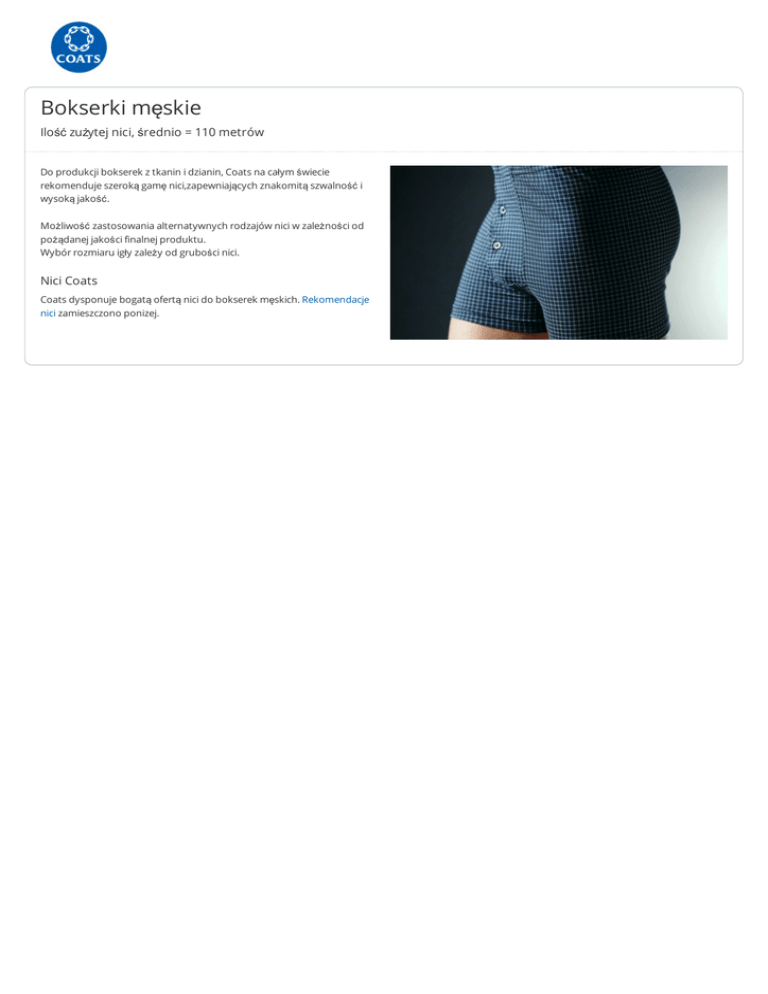 Bokserki męskie Ilość zużytej nici, średnio = 110 metrów Do produkcji bokserek z tkanin i dzianin, Coats na całym świecie rekomenduje szeroką gamę nici,zapewniających znakomitą szwalność i wysoką jakość. Możliwość zastosowania alternatywnych rodzajów nici w zależności od pożądanej jakości finalnej produktu. Wybór rozmiaru igły zależy od grubości nici. Nici Coats Coats dysponuje bogatą ofertą nici do bokserek męskich. Rekomendacje nici zamieszczono ponizej. Numer ściegu Rodzaj ściegu Produkt 301 Ścieg stębnowy dwunitkowy (301) Epic Więcej 2 504 Ścieg trzynitkowy overlokowy (504) Epic Więcej 3 406 Epic Więcej Epic Więcej 1 Podszywanie dwuigłowe (406) 4 304-5 Ścieg stębnowy, ozdobny prostokątny (301) Premium Tkaniny Najwyższej jakości nici rdzeniowe poliestrowe Nici przemysłowe Coats dostępne są w szerokiej gamie rodzajów włókien i wykończeń, z których każdy opracowany jest pod kątem konkretnych potrzeb naszych klientów. Zapraszamy do zapoznania się z naszą bogatą ofertą poniżej. W przypadku dostępności innych opcji, proszę wybrać odpowiednią opcję z listy. Wygląd szwu Rodzaj ściegu Ścieg stębnowy dwunitkowy (301) Ścieg trzynitkowy overlokowy (504) 1 2 Numer ściegu Gęstość ściegu (na 3cm) Górna nitka Grubość igły Nm Dolna nitka Produkt Tex Tkt Produkt Tex Tkt 301 14 - 16 Epic 24 lub 30 120 lub 100 Epic 24 lub 30 120 lub 100 70 - 90 504 14 - 16 Epic 24 lub 30 120 lub 100 Epic 24 lub 30 120 lub 100 70 - 90 3 Podszywanie dwuigłowe (406) 406 14 - 18 Epic 24 lub 30 120 lub 100 Epic 24 lub 30 120 lub 100 70 - 90 4 Ścieg stębnowy, ozdobny prostokątny (301) 304-5 - Epic 24 lub 30 120 lub 100 Epic 24 lub 30 120 lub 100 70 - 90 Informacje dodatkowe Wybór między zalecanymi dwiema grubościami Tex nici będzie uwarunkowany: Wymogami dotyczącymi rodzaju szwów Dociskiem stopki Wymagań dotyczących szwów dekoracyjnych (stębnowanie) Podszywanie bielizny męskiej i chłopięcej obejmującej slipy, w tym slipy z frontem w kształcie litery „Y” i bokserki, wymaga użycia następujących rodzajów ściegów: 406 Podszywanie dwuigłowe 407 Podszywanie trzyigłowe 605 Ścieg trzyigłowy drabinkowy z przeplataczem górnym 607 Ścieg drabinkowy sześcionitkowy, podszywanie czteroigłowe z przeplataczem górnym Rekomendacje podane w tabeli powyżej dotyczą wszystkich tych rodzajów ściegów. Wybór nici użytej do przeplatacza górnego jest warunkowany pożądanym efektem wizualnym. Do popularnych nici na igłę należą: Gramax, Epic, Sylko i Alcazar. Na chwytacze łańcuszkowe przy obszywaniu rozporków (401x2), należy zastosować nici Gramax Tex 18. Aby uniknąć uszkodzeń materiału w czasie zszywania bielizny dzianinowej, zaleca się użycie igieł zakończonych kulką. Rekomendacje nici do szycia zamieszczone powyżej pełnią funkcję pomocniczą w produkcji odzieży o wysokiej jakości szwach. Ponieważ elementy tego samego rodzaju mogą różnić się surowcem, konstrukcją, oraz metodami produkcji i postprodukcji, rekomendacje te należy traktować jako wstępne wskazówki w wyborze nici. Szczegółowe rekomendacje w wyborze nici i igieł, precyzyjny szacunek zużycia nici oraz wsparcie techniczne można uzyskać kontaktując się z lokalnym oddziałem Coats. Niniejsze zalecenia i dane na temat zużycia stanowią jedynie wskazówki i udzielone są w dobrej wierze, lecz bez gwarancji lub odpowiedzialności ze strony firmy lub jej pracowników.