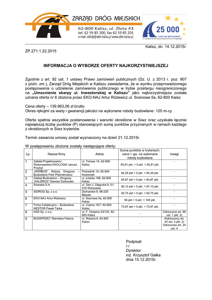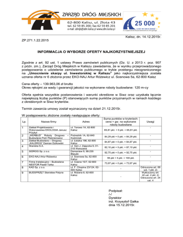 Kalisz, dn. 14.12.2015r. ZP.271.1.22.2015 INFORMACJA O WYBORZE OFERTY NAJKORZYSTNIEJSZEJ Zgodnie z art. 92 ust. 1 ustawy Prawo zamówień publicznych (Dz. U. z 2013 r. poz. 907 z późn. zm.), Zarząd Dróg Miejskich w Kaliszu zawiadamia, że w wyniku przeprowadzonego postępowania o udzielenie zamówienia publicznego w trybie przetargu nieograniczonego na „Umocnienie skarpy ul. Inwestorskiej w Kaliszu” jako najkorzystniejsza została uznana oferta nr 6 złożona przez EKO-NAJ Artur Różewicz ul. Sosnowa 5a, 62-800 Kaisz Cena oferty – 139.963,06 zł brutto Okres rękojmi za wady i gwarancji jakości na wykonane roboty budowlane: 120 m-cy Oferta spełnia wszystkie postanowienia i warunki określone w Siwz oraz uzyskała łącznie największą liczbę punktów (P) stanowiących sumę punktów przyznanych w ramach każdego z określonych w Siwz kryteriów. Termin zawarcia umowy został wyznaczony na dzień 21.12.2015r. W postępowaniu złożone zostały następujące oferty: Lp. Nazwa firmy 4 Zakład Projektowania i Wykonawstwa EKOLOGIA Janusz Przybył „WERBUD” Roboty Drogowo – Budowlane Piotr Pleśnierowicz Zakład Budowlano – Drogowy „KALDROG” Damian Dzikowski Skanska S.A. 5 SIDROG Sp. z o.o. 6 EKO-NAJ Artur Różewicz 7 8 Firma Instalacyjno – Budowlana NESTOR Paweł Tarka KAD Sp. z o.o. 9 BUDSPRZĘT Stanisław Patyna 1 2 3 Adres ul. Torowa 1A, 62-800 Kalisz Pośrednik 1A, 62-840 Koźminek ul. Łódzka 196, 62-800 Kalisz ul. Gen.J. Zajączka 9, 01518 Warszawa Domaniew 9, 98-235 Błaszki ul. Sosnowa 5a, 62-800 Kalisz ul. Ciasna 15/7, 62-800 Kalisz ul. F. Chopina 23/124, 62800 Kalisz ul. Różana 6, 62-800 Kalisz Suma punktów w kryteriach: cena + gw. na wykonane roboty budowlane Uwagi - 65,81 pkt. + 0 pkt. = 65,81 pkt. 84,29 pkt + 0 pkt. = 84,29 pkt. 84,87 pkt + 0 pkt. = 84,87 pkt. 82,10 pkt + 5 pkt. = 87,10 pkt. 92,75 pkt + 0 pkt. = 92,75 pkt. 95 pkt + 5 pkt. = 100 pkt. 73,97 pkt + 0 pkt. = 73,97 pkt. - - Podpisał: /-/ Dyrektor inż. Krzysztof Gałka dnia 15.12.2015r. Odrzucona art. 89 ust. 1 pkt. 2) Wykluczony art. 24 ust. 2 pkt. 2) Odrzucona art. 24 ust. 4